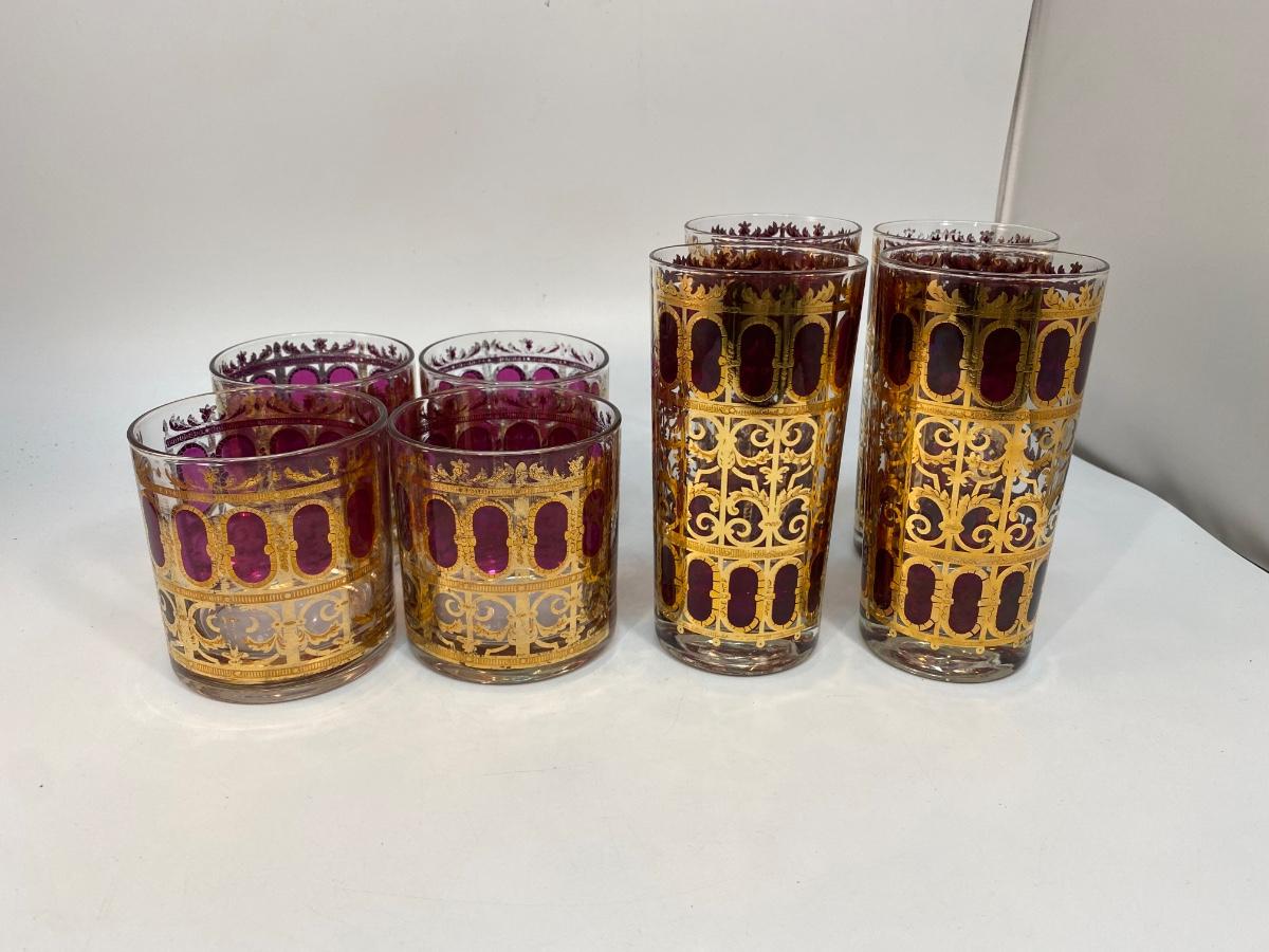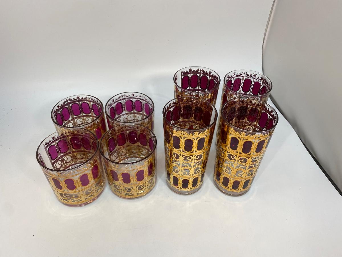 Vintage MCM Mid Century Culver Red & Gold Cranberry Scroll Drink Glass Set Highball Lowball Barware. Set of 8, 4 rocks glasses and 4 highball glasses. Some wear to the patterns, some glasses more than others, no chips.