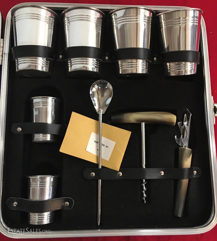 Set is in mint condition does not appear to have been used, 6" thick, 14" wide and 12" tall not including the handle. Liquor Set.