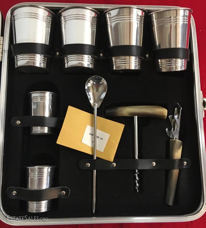 Set is in mint condition does not appear to have been used, 6" thick, 14" wide and 12" tall not including the handle. Liquor Set. This table was in last months auction but the high bidder failed to pick up and pay for it.