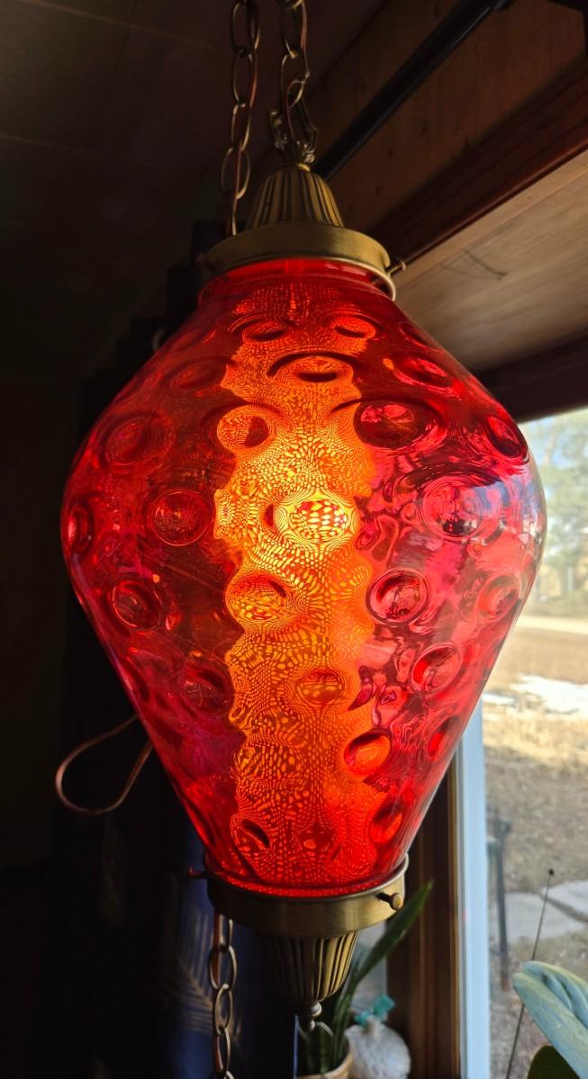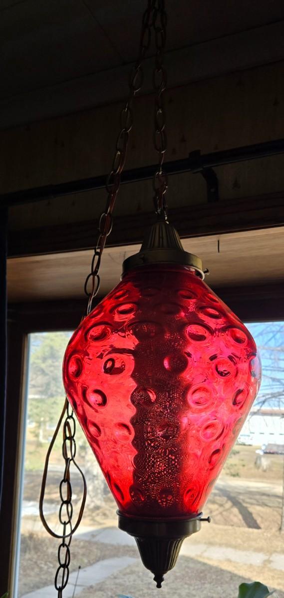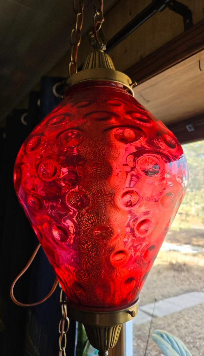24 inch long Ruby red hanging swag light with inside diffuser. In excellent working condition.
