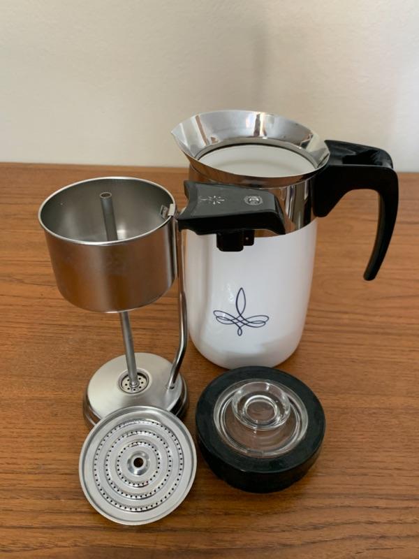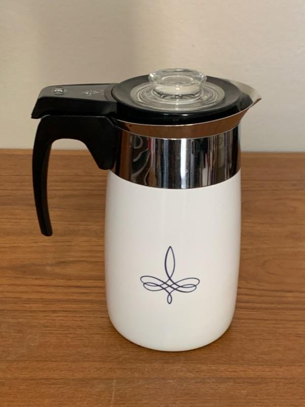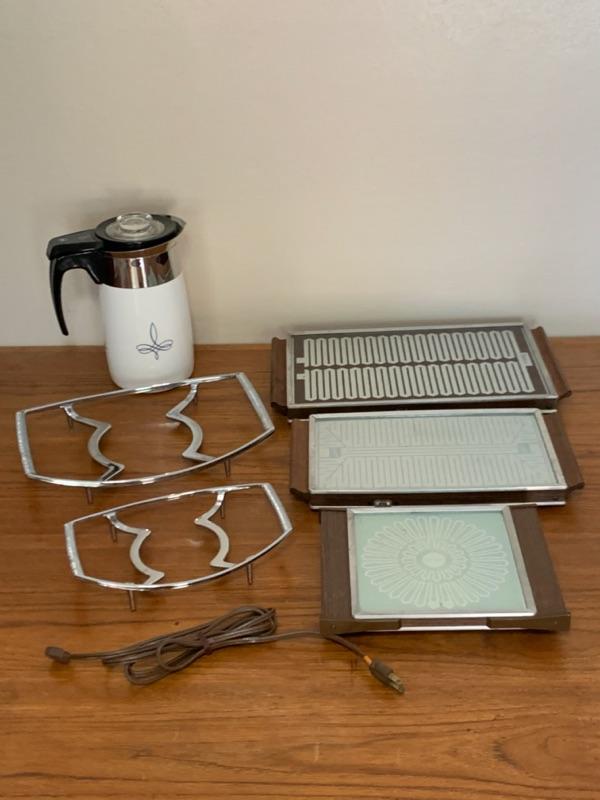 1 Corning Ware Electric Percolator Coffee Pot, no cord. Top plastic piece has cracks. Unsure if it works.