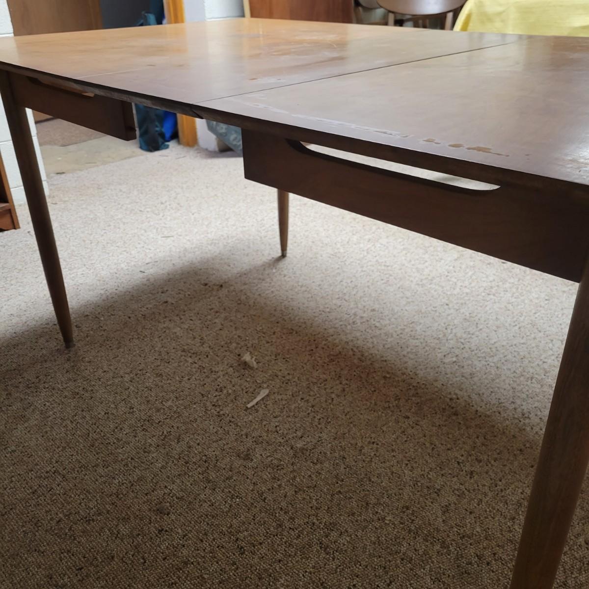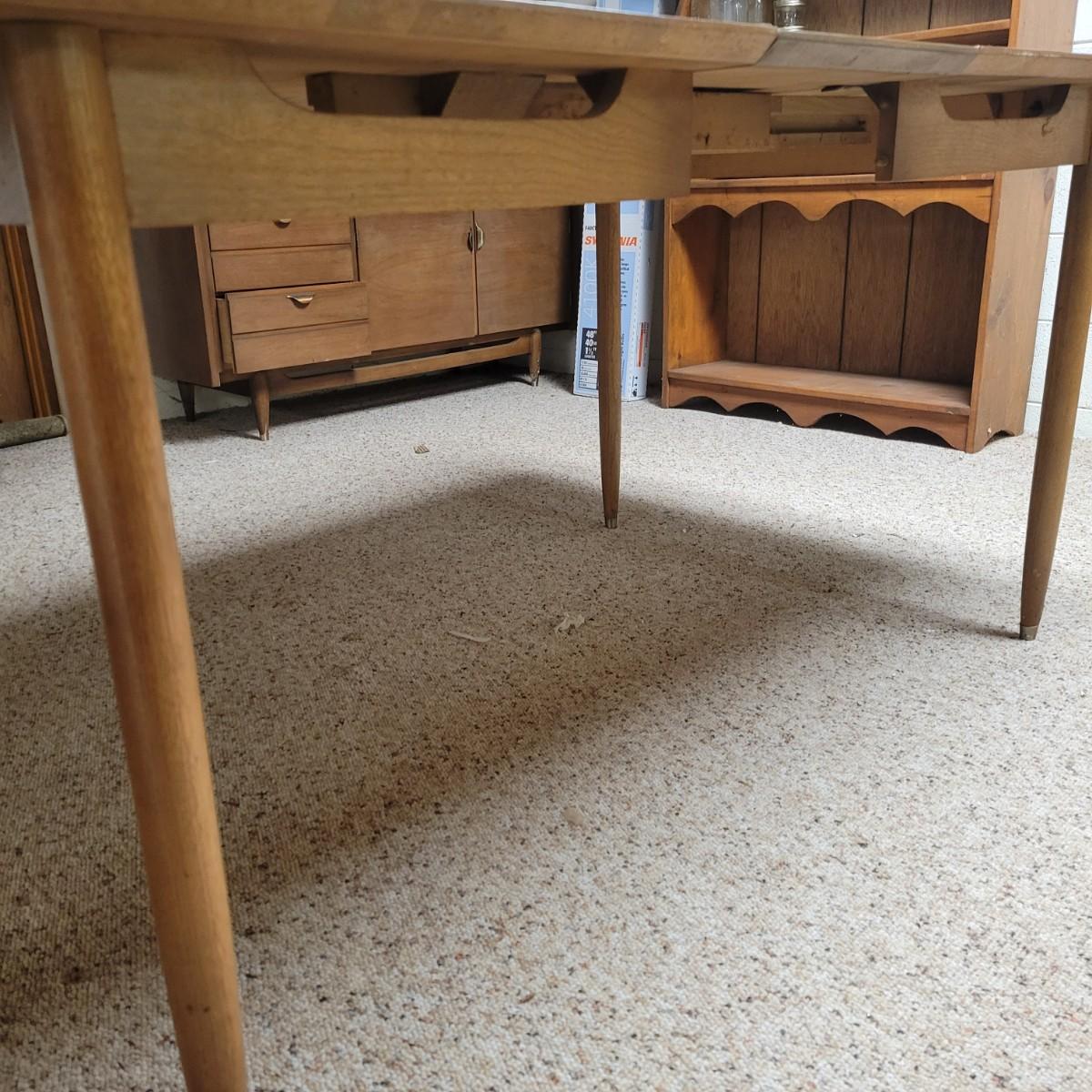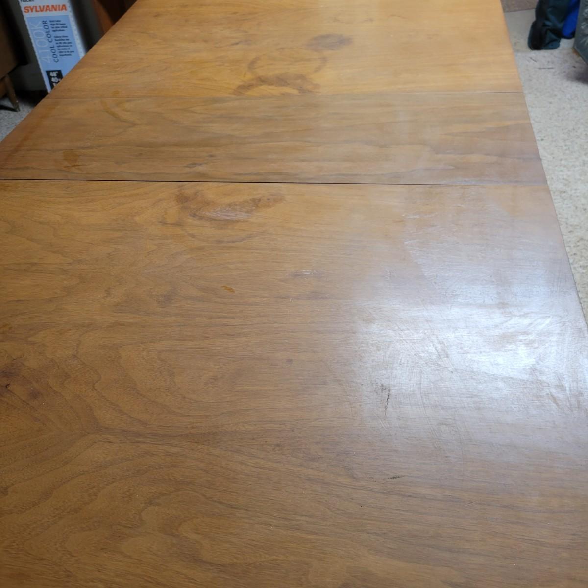 A solid wood MCM table in good condition, but does have some scratches and blemishes. This table appears to be made of maple and includes a 12" leaf and has metal leg protectors. Table measures approximately 68" x 38" x 30" with leaf installed. Local pickup only. Winning bidder must bring assistance to help move and load this item due to its weight and/or size.