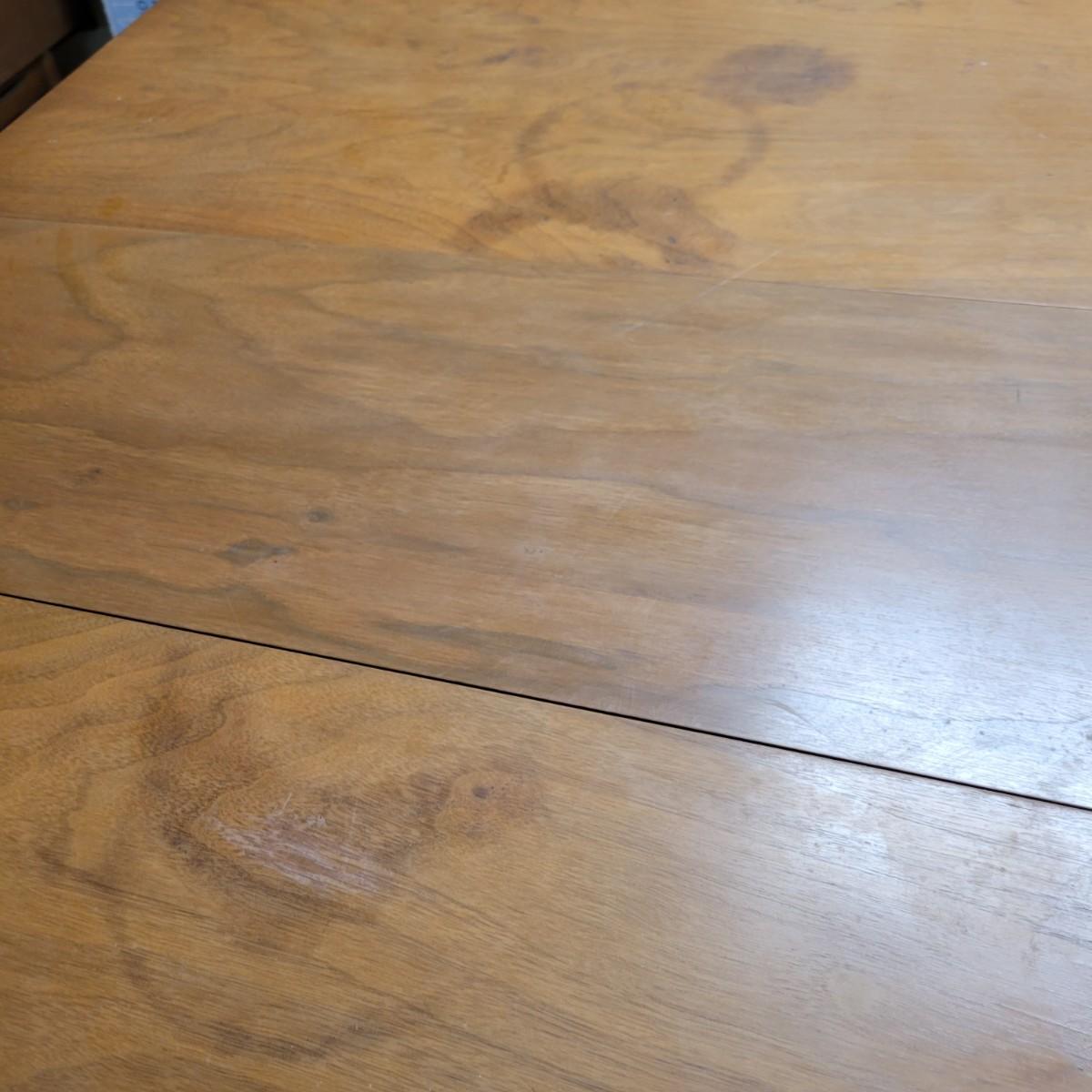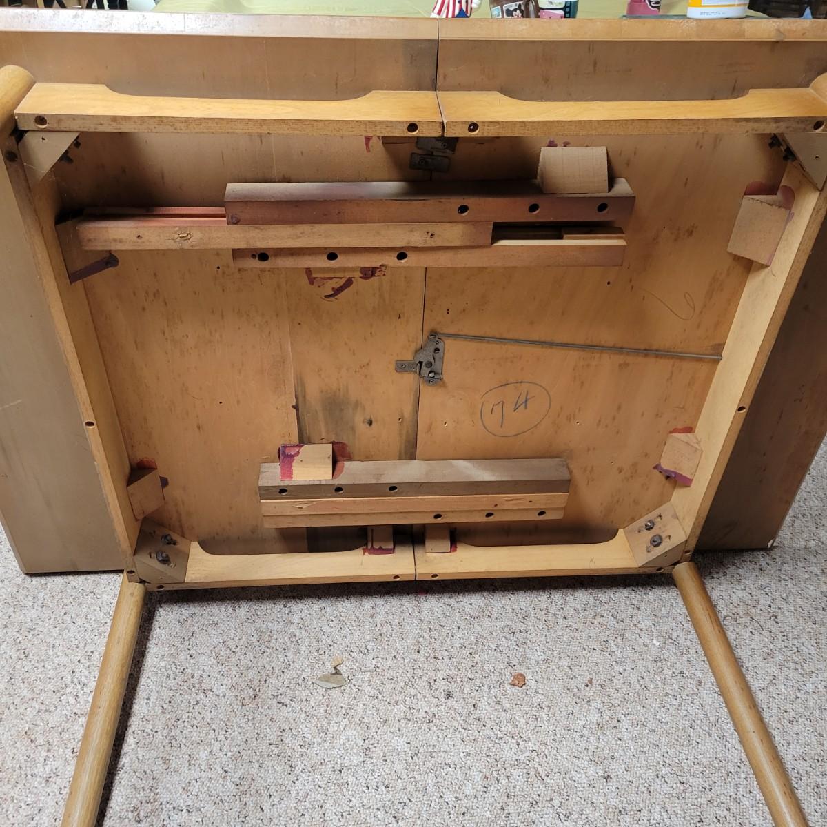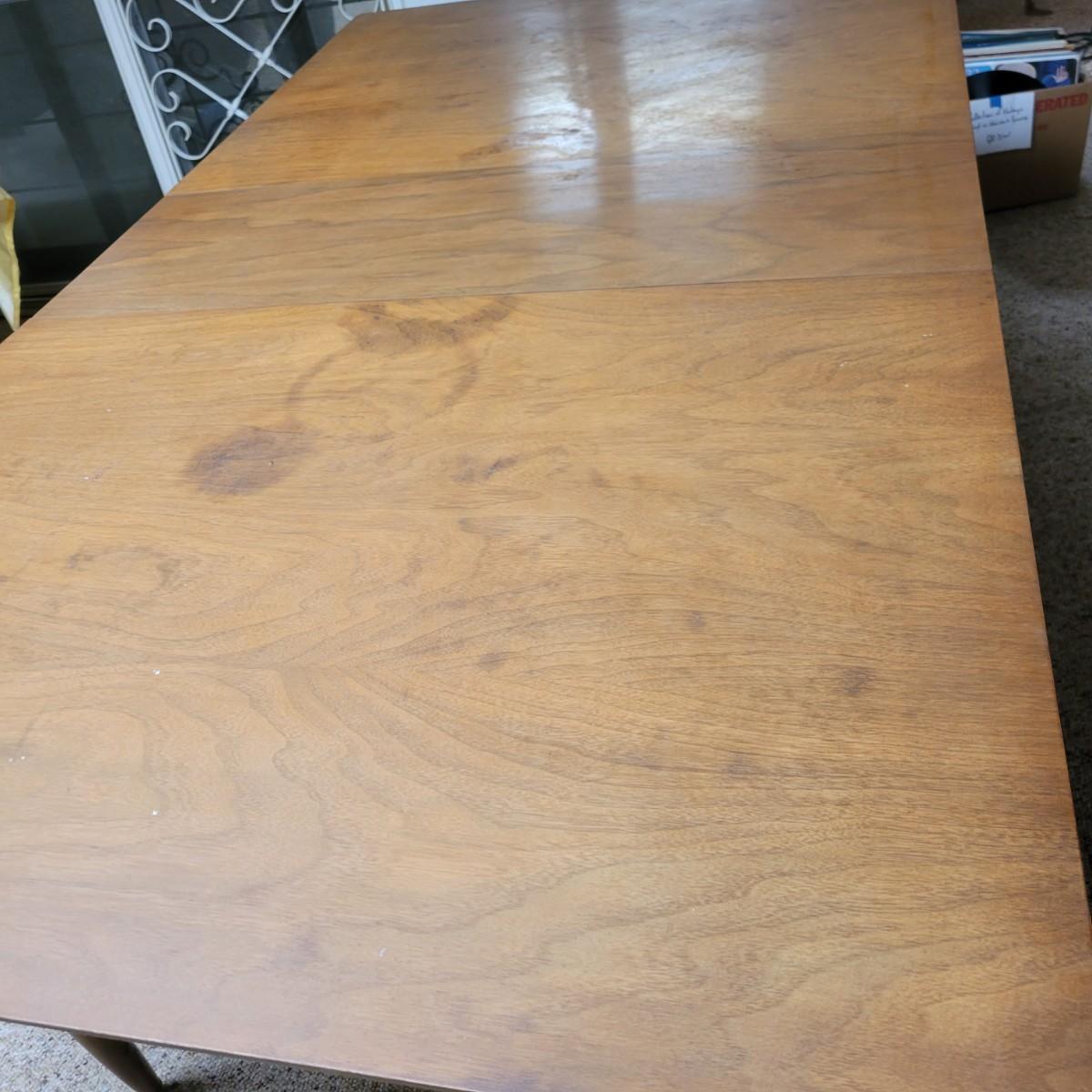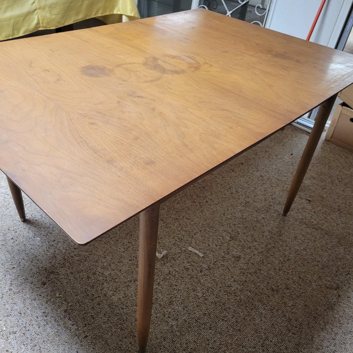 A solid wood MCM table in good condition, but does have some scratches and blemishes. This table appears to be made of maple and includes a 12" leaf and has metal leg protectors. Table measures approximately 68" x 38" x 30" with leaf installed. Local pickup only. Winning bidder must bring assistance to help move and load this item due to its weight and/or size.