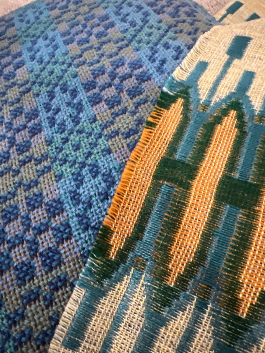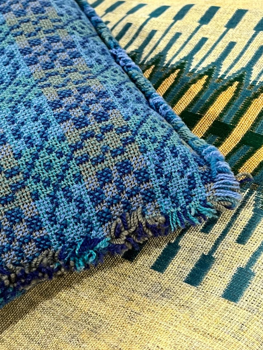 This amazing table runner has a slight fringe on the ends. It measures 11 feet long by 16 inches wide. The pillow has fringe all around the edges and is a 14” square. The last pic shows the colors the best.