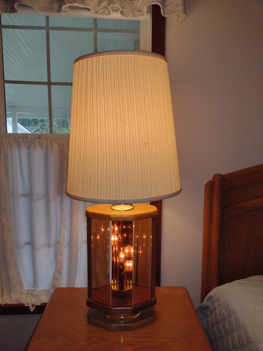 Vintage MCM Table Top 3-Way Lamp- Oak, Brass, and Etched Amber Glass (Choice A)