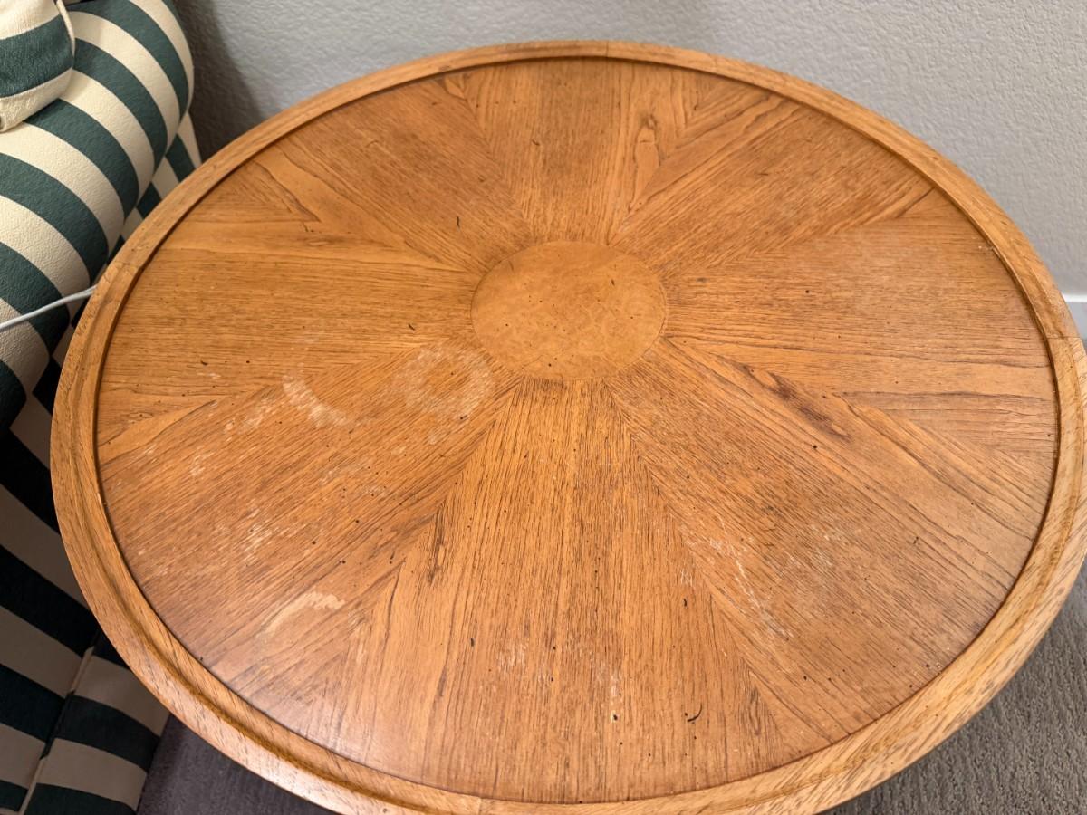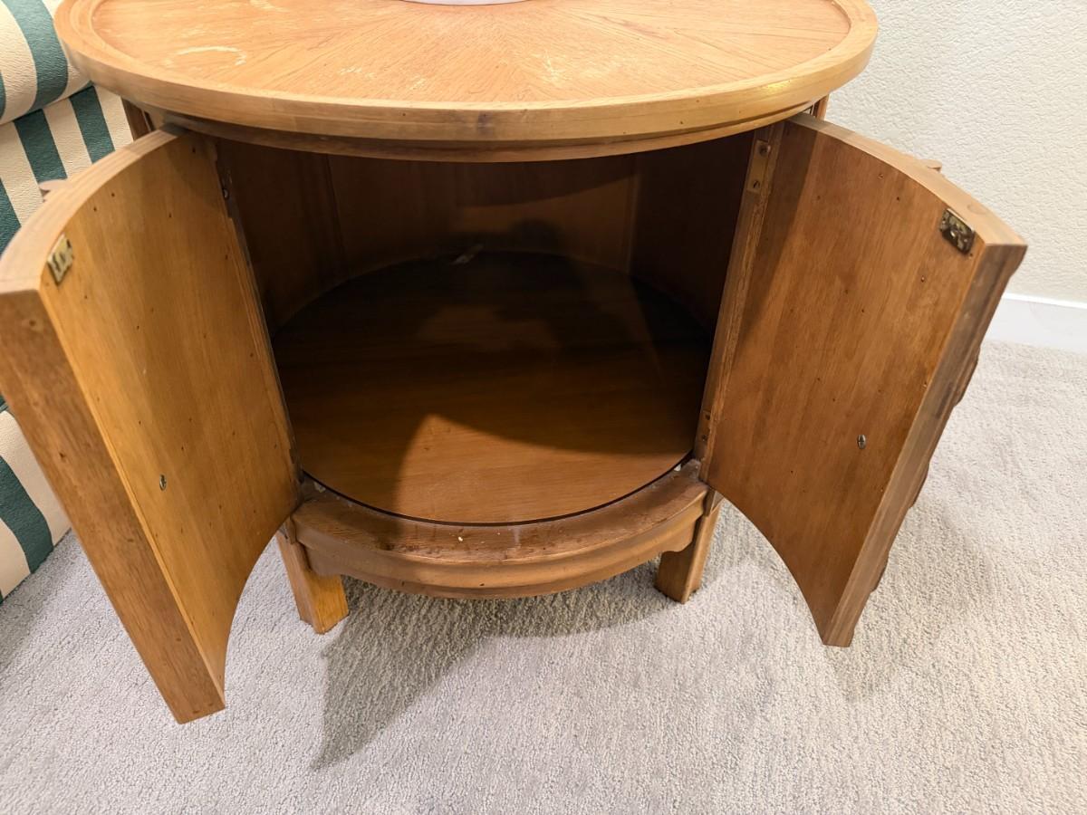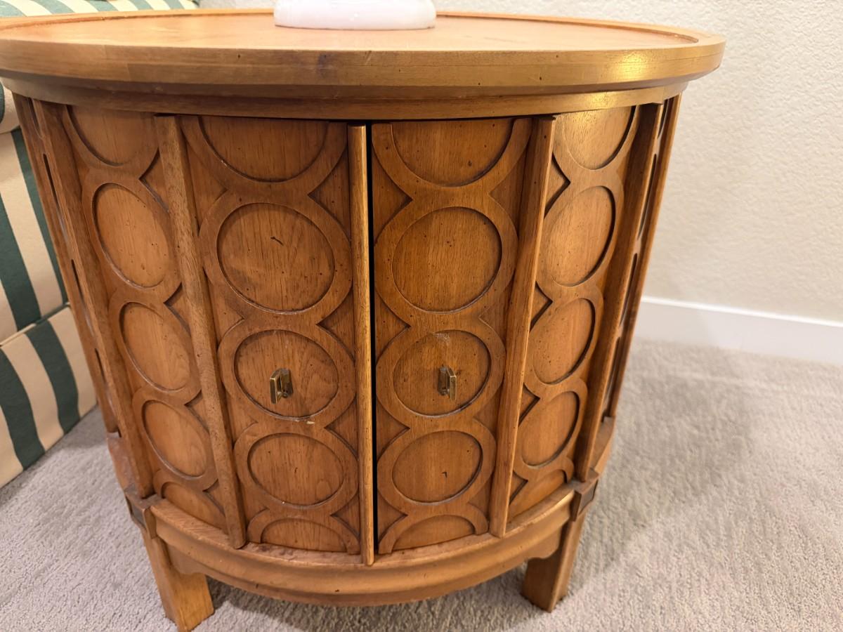 Vintage MCM Thomasville Round Drum End Table w/ travertine Top