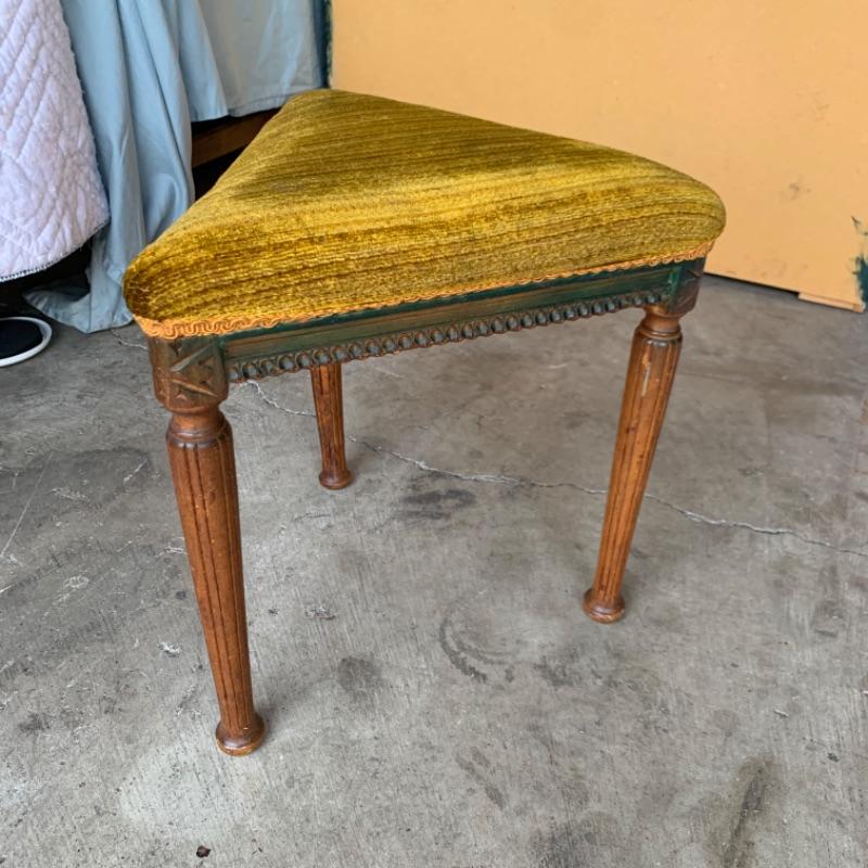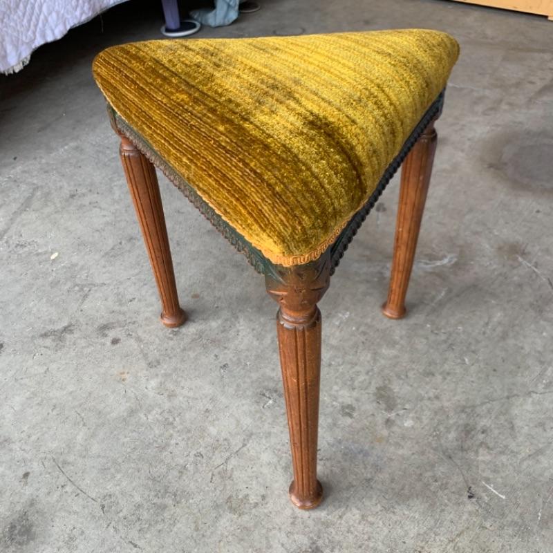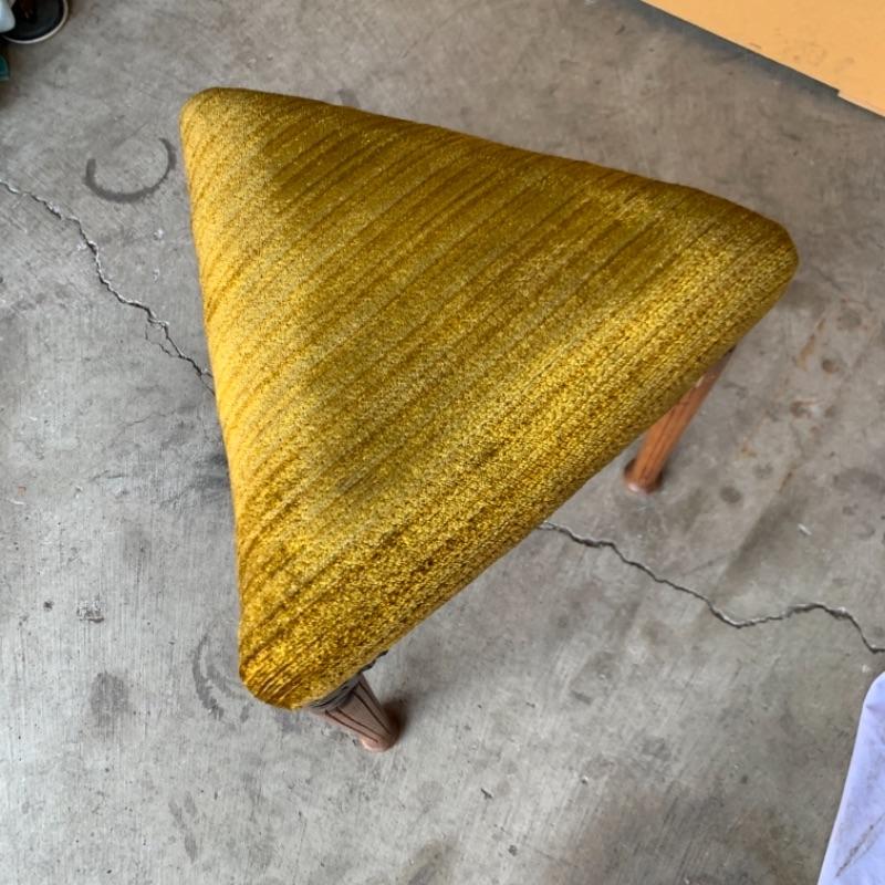 Upholstered triangle footstool. Excellent condition with less-than appropriate wear for age. Very clean. Measures 15 1/2” tall.