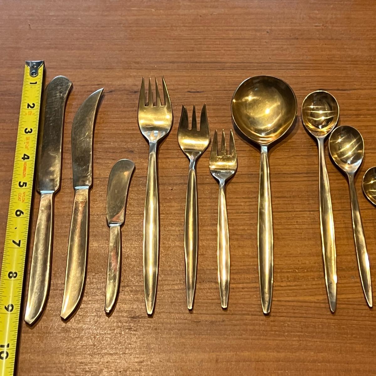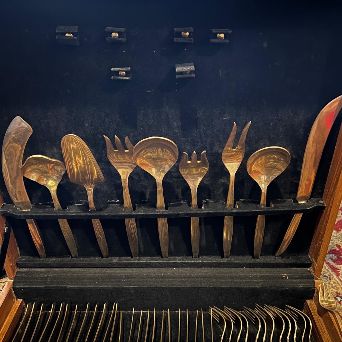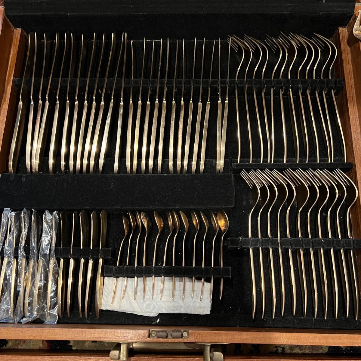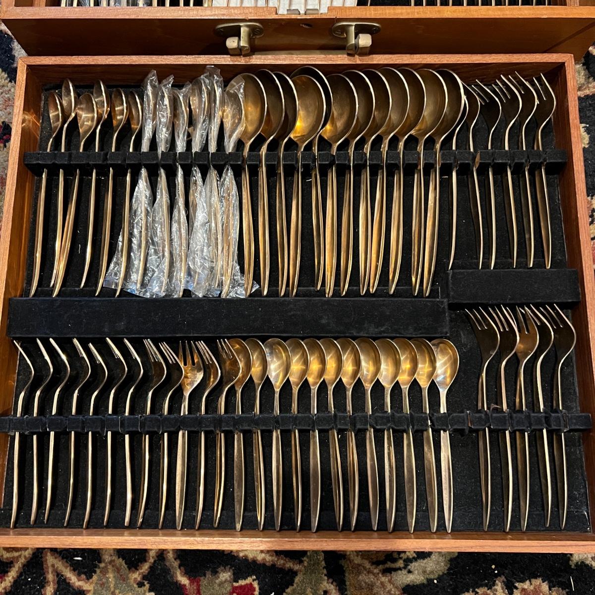 142 Pc. Vintage MCM VU Brass Flatware Set In Original Wood Box