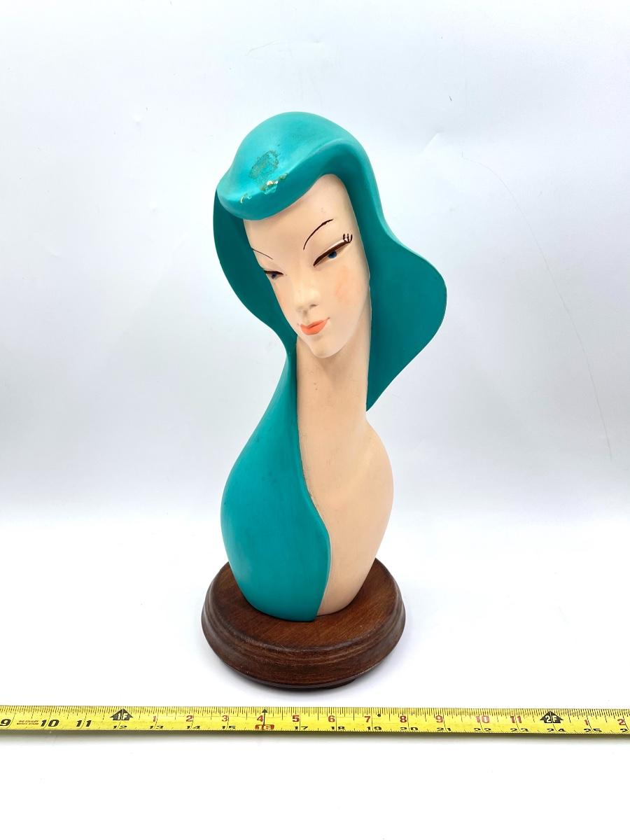 Very cool sculptural piece! This is pretty leightweight. She does have some damage to the front of her hair as shown - maybe she just needs a little hat :) Marked with #225
