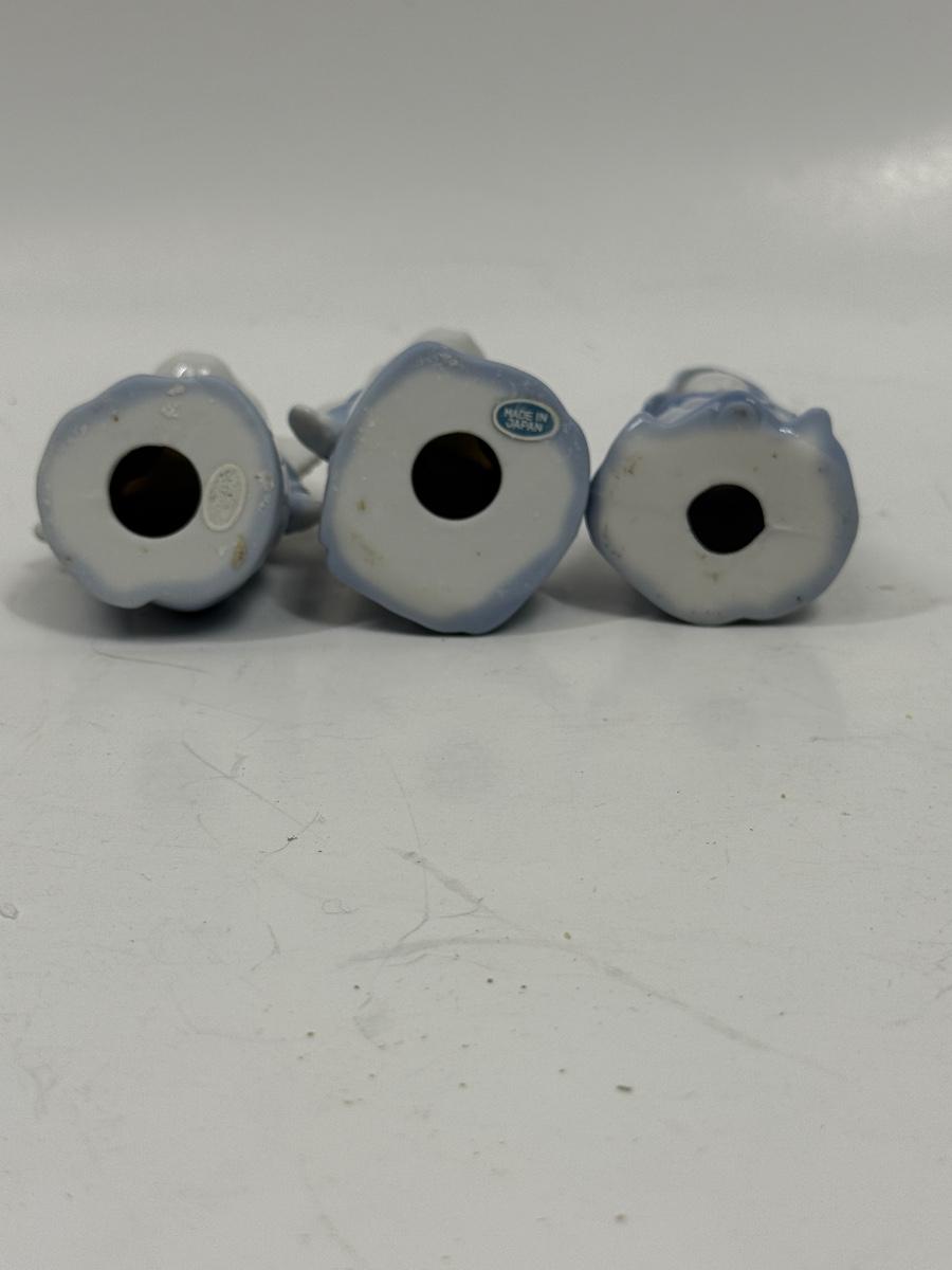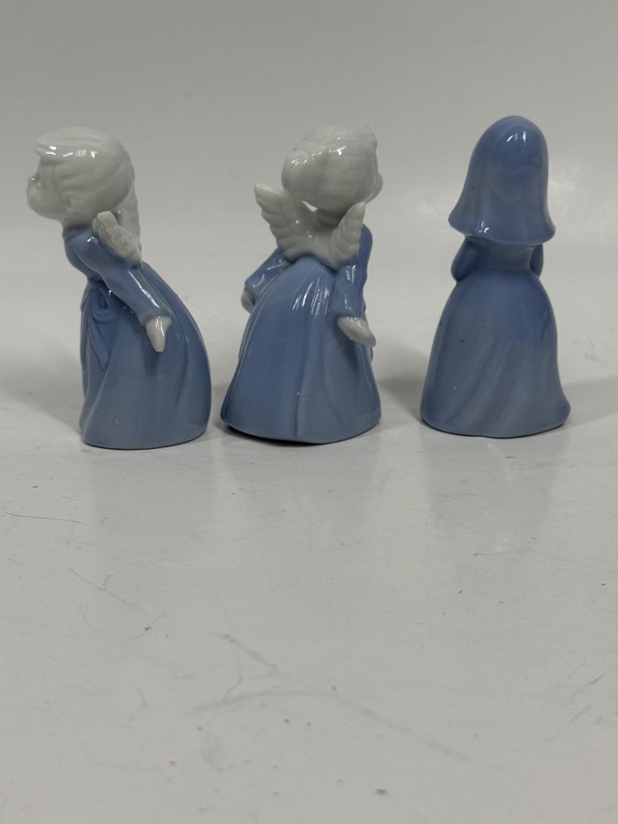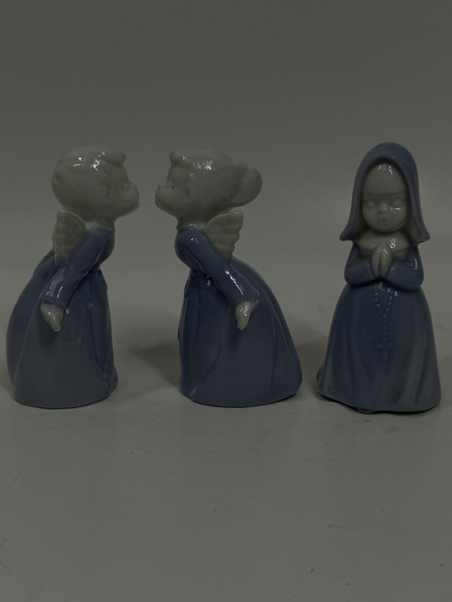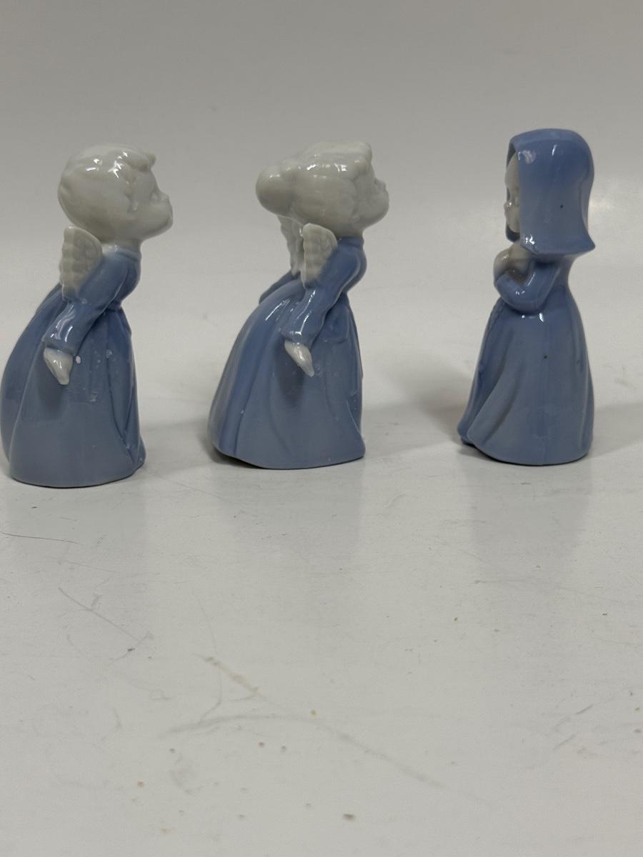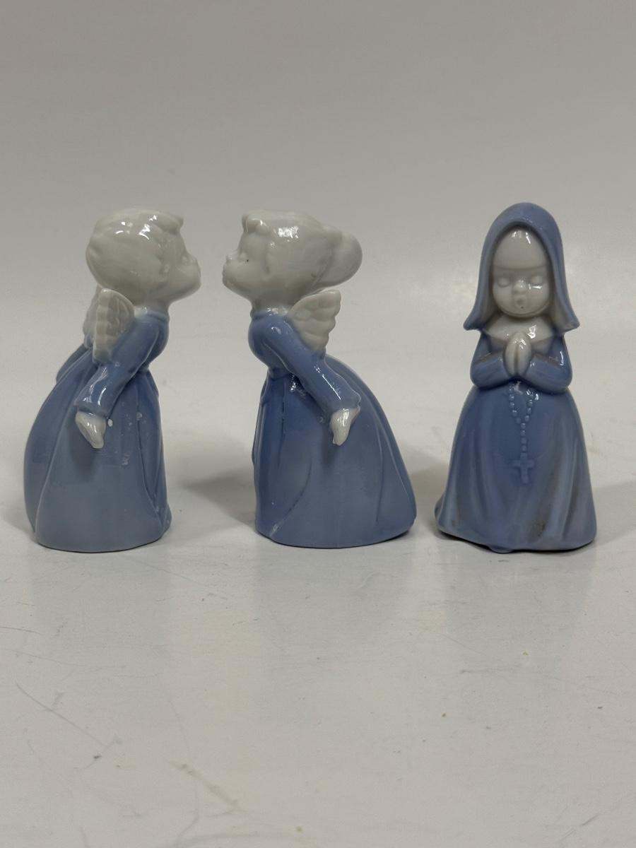 Vintage Inarco Japan Kissing Boy and Girl Angel Figurines and Praying Nun Porcelain Figurine Blue Girl Religious 3.5". All appear to be in good condition.
