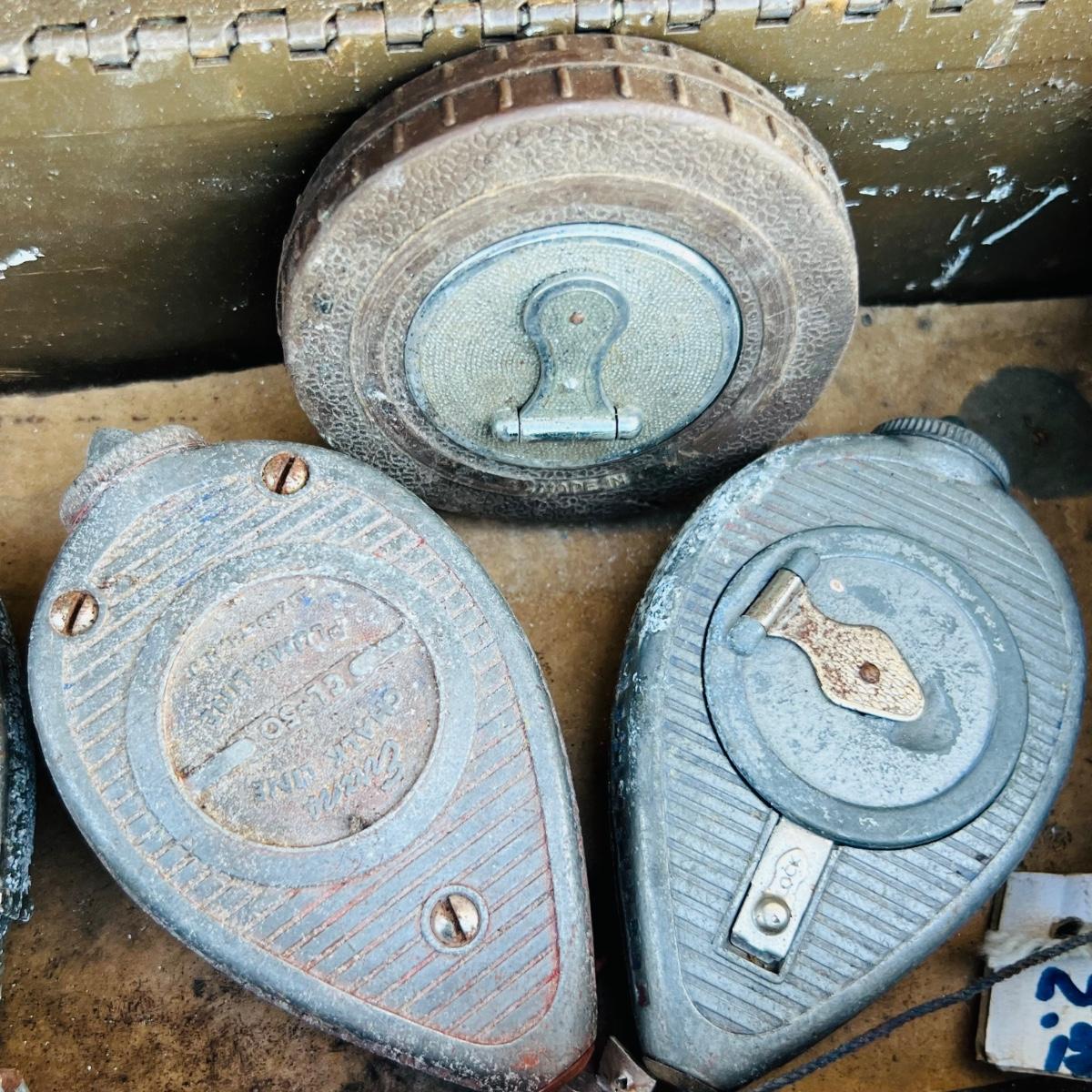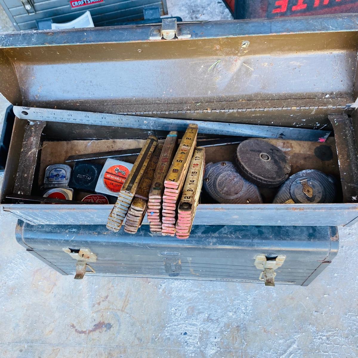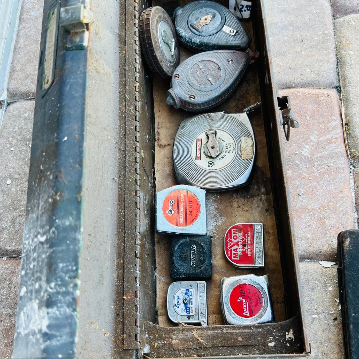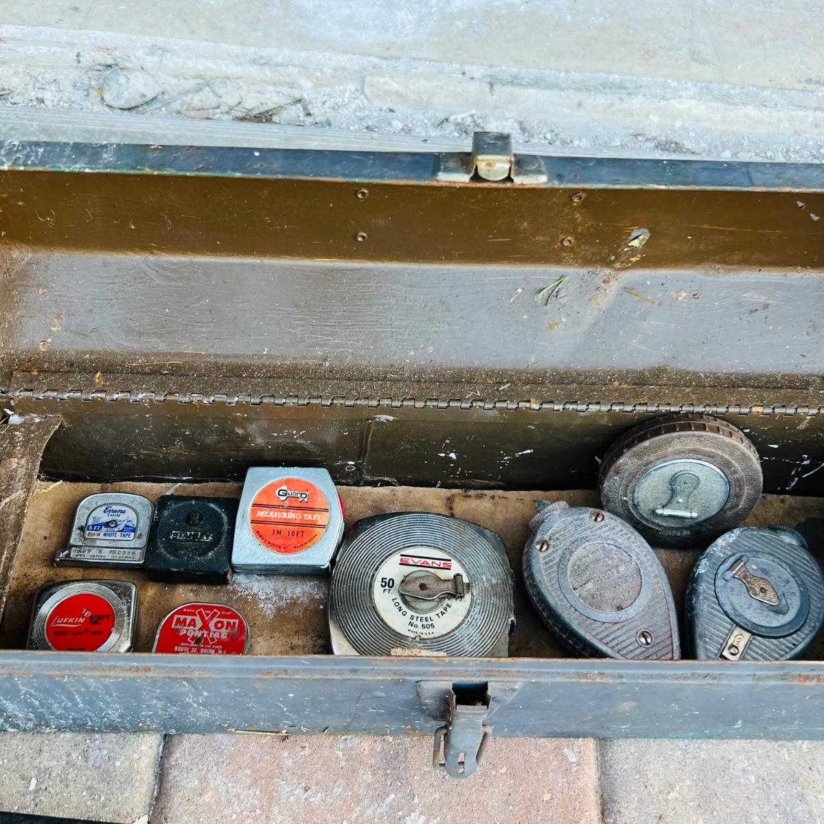 Lot includes a metal toolbox, filled with vintage measuring tapes.