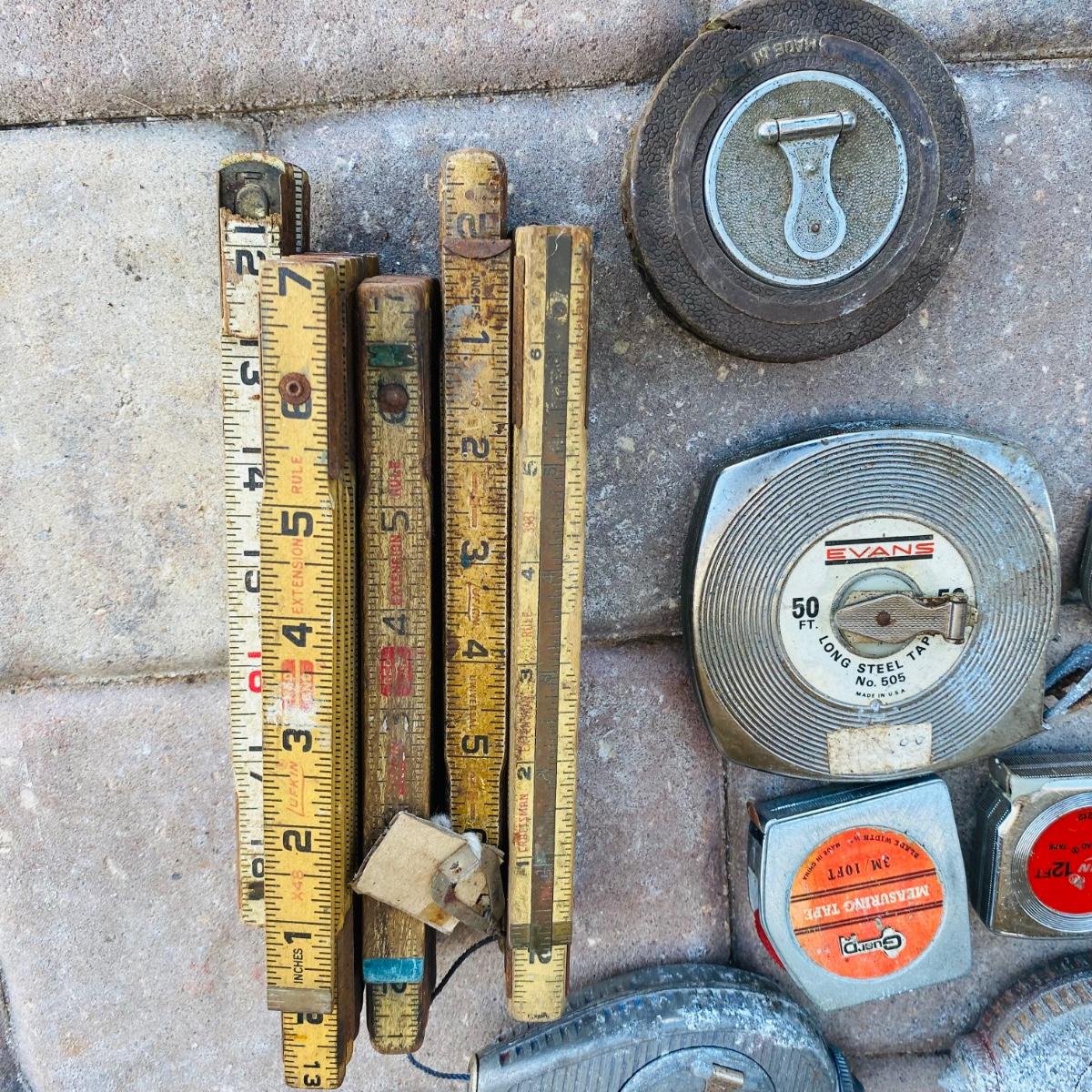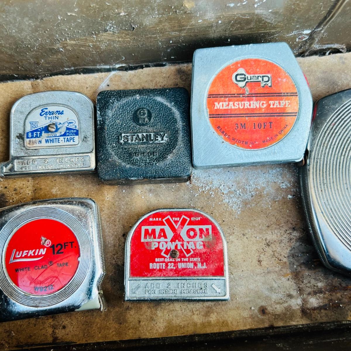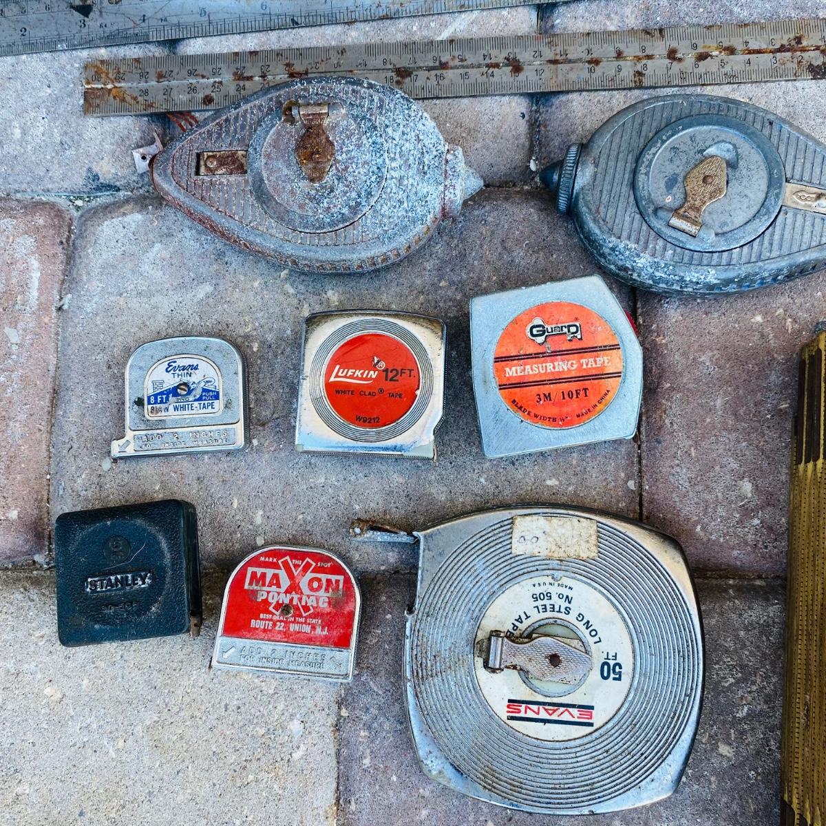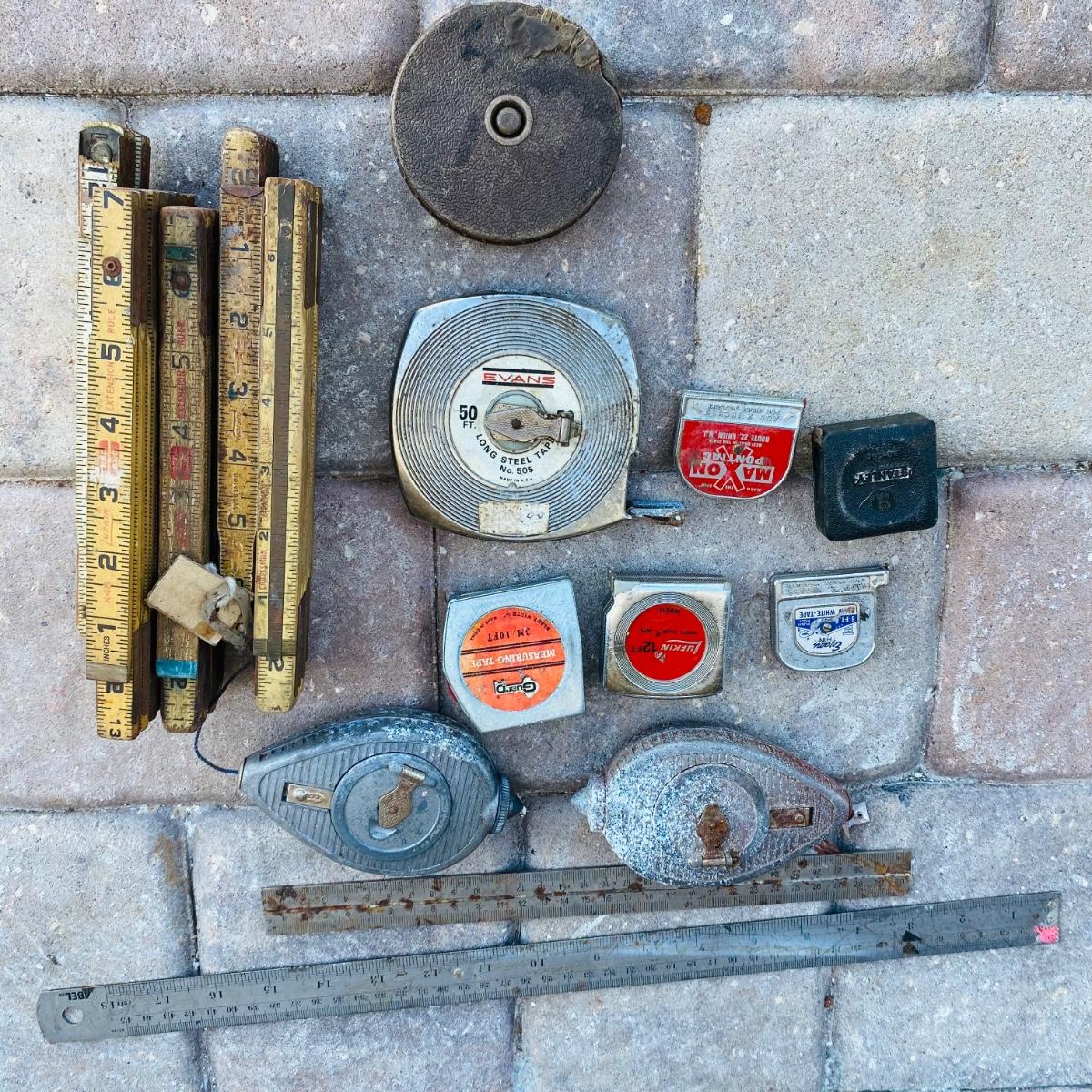 Lot includes a metal toolbox, filled with vintage measuring tapes.
