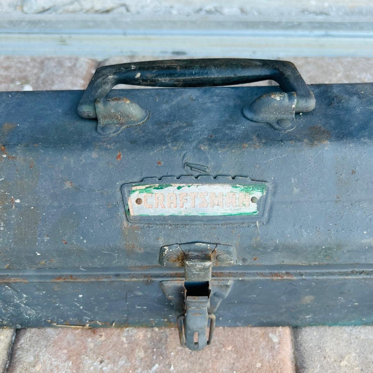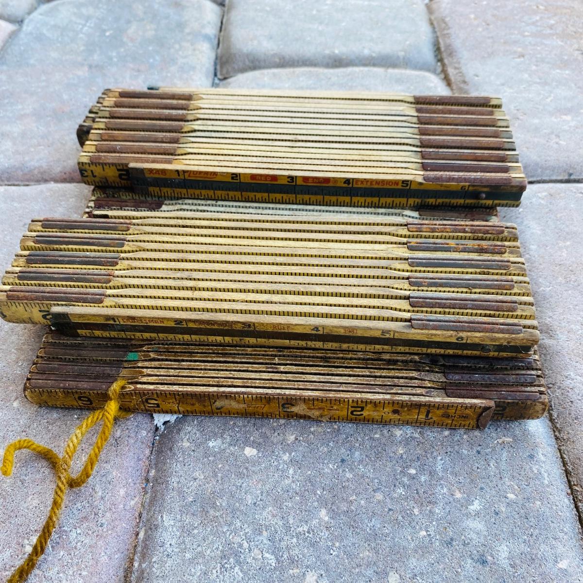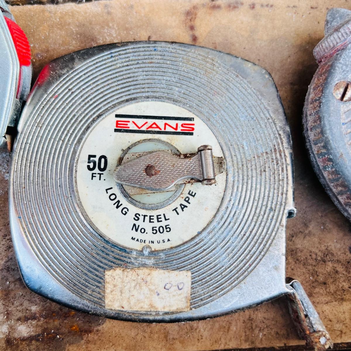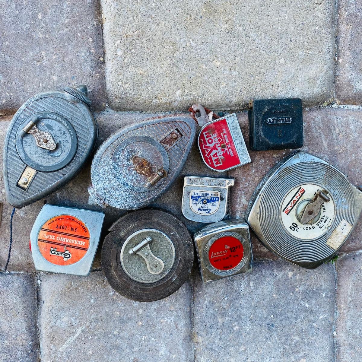 Lot includes a metal toolbox, filled with vintage measuring tapes.