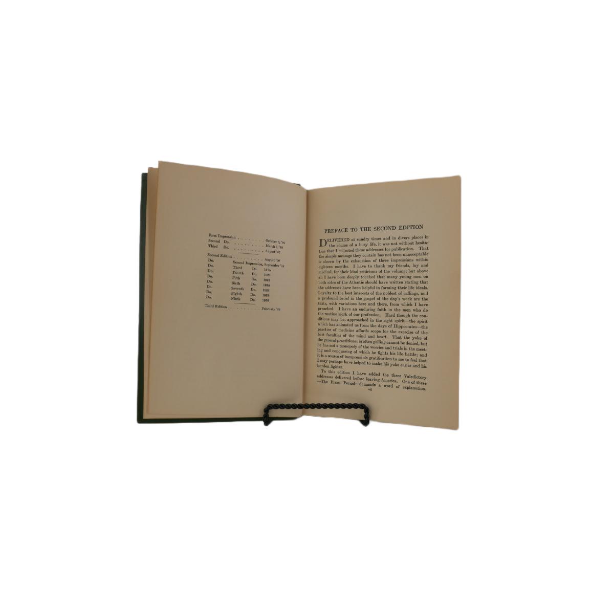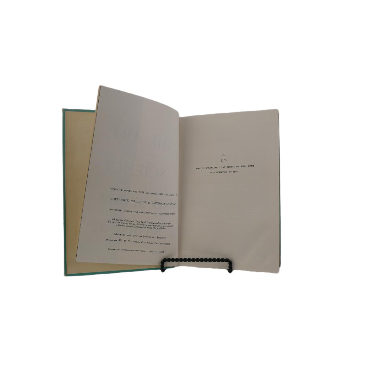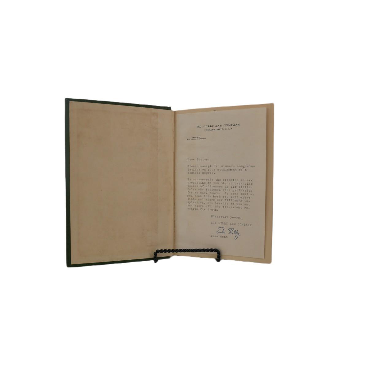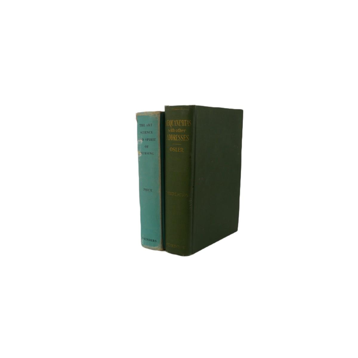 The Art, Science and Spirit of Nursing by Alice L. Price textbook copyright, 1954 W. B. Saunders Company. Book does have underlining and notes throughout. This was a medical student's textbook for school. Overall great condition, binding well intact. Measures 5.5" x 8" x 1.5". Aequanimitas with Other Addresses by Sir William Osler copyright, 1932 The Blakiston Company Third Edition. This was a presented as a gift by Eli Lilly and Company to graduate doctors. Included is congratulatory letter with print signature of Eli Lilly. Book is in great condition, no binding or other issues found. Measures 5.5" x 8" x 2". Lot weighs 4 lbs. (M5)