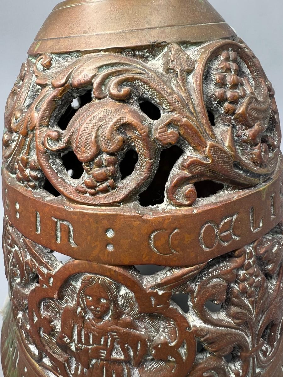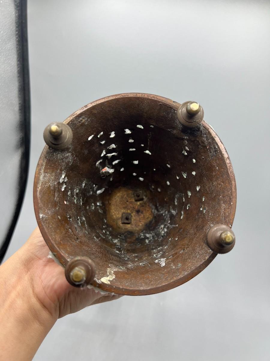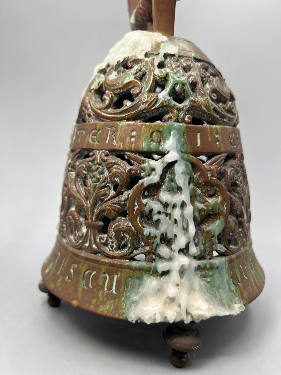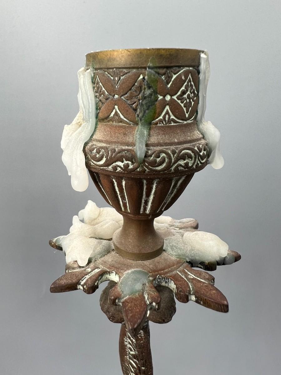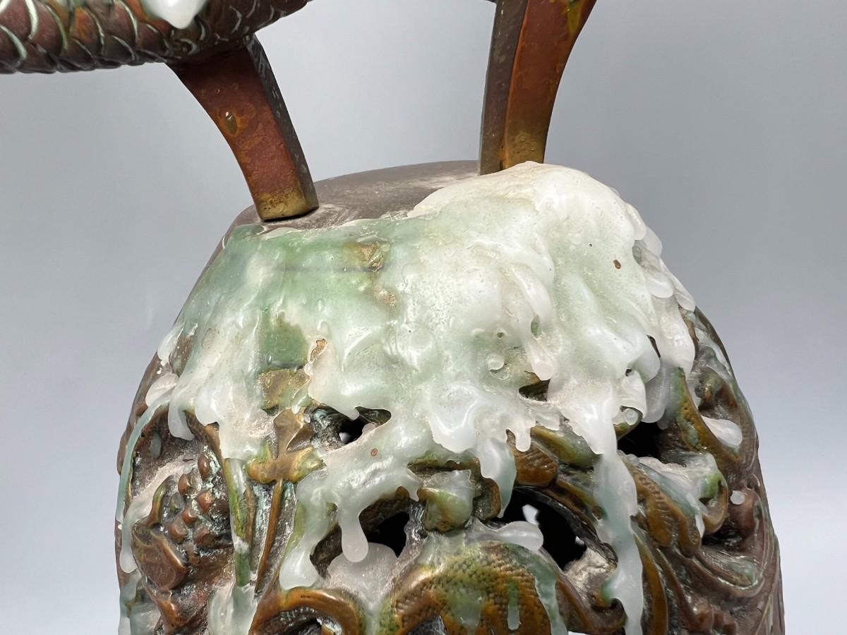 There is caked on wax that has oxidized and turned some parts of the candle holder green. Still in cool collectible condition!
