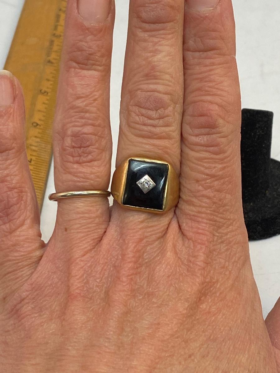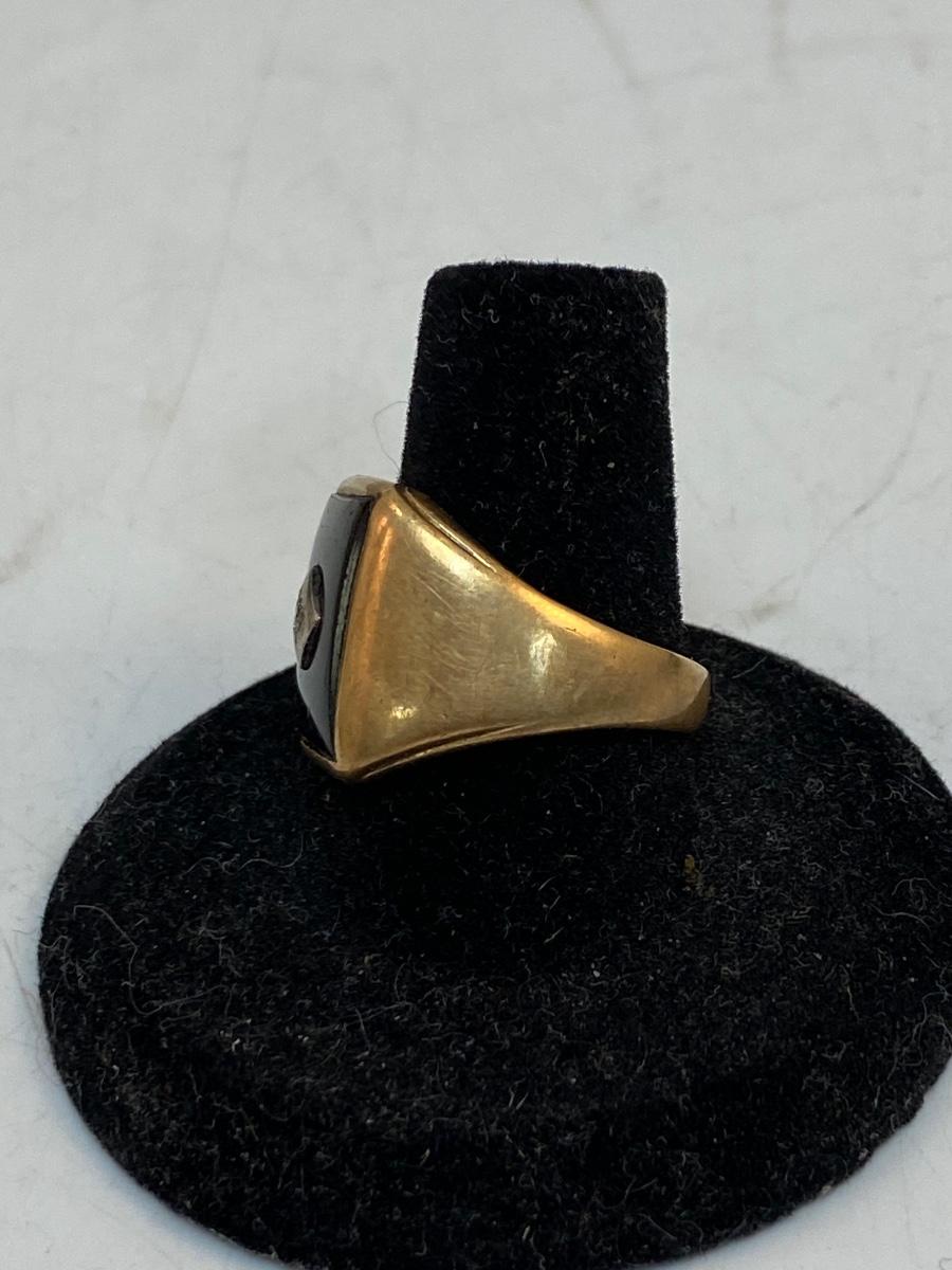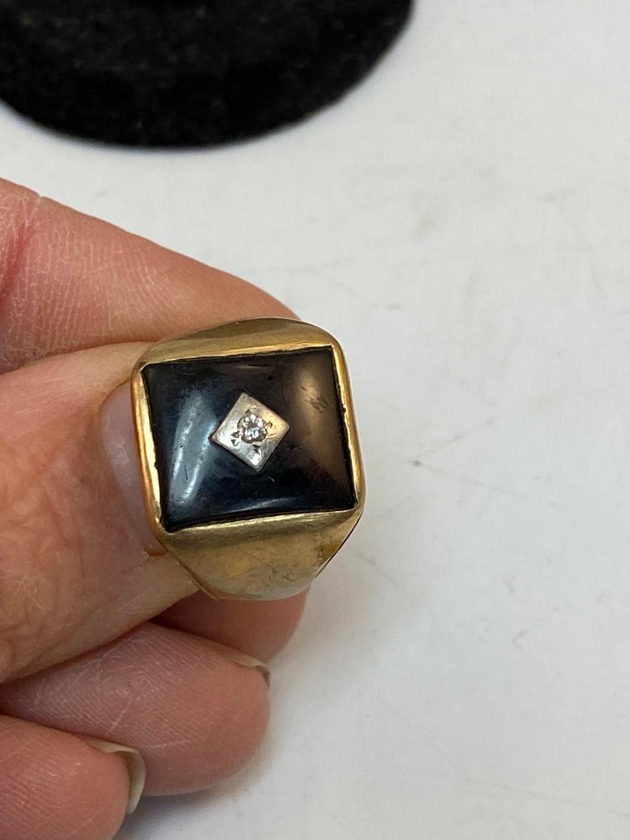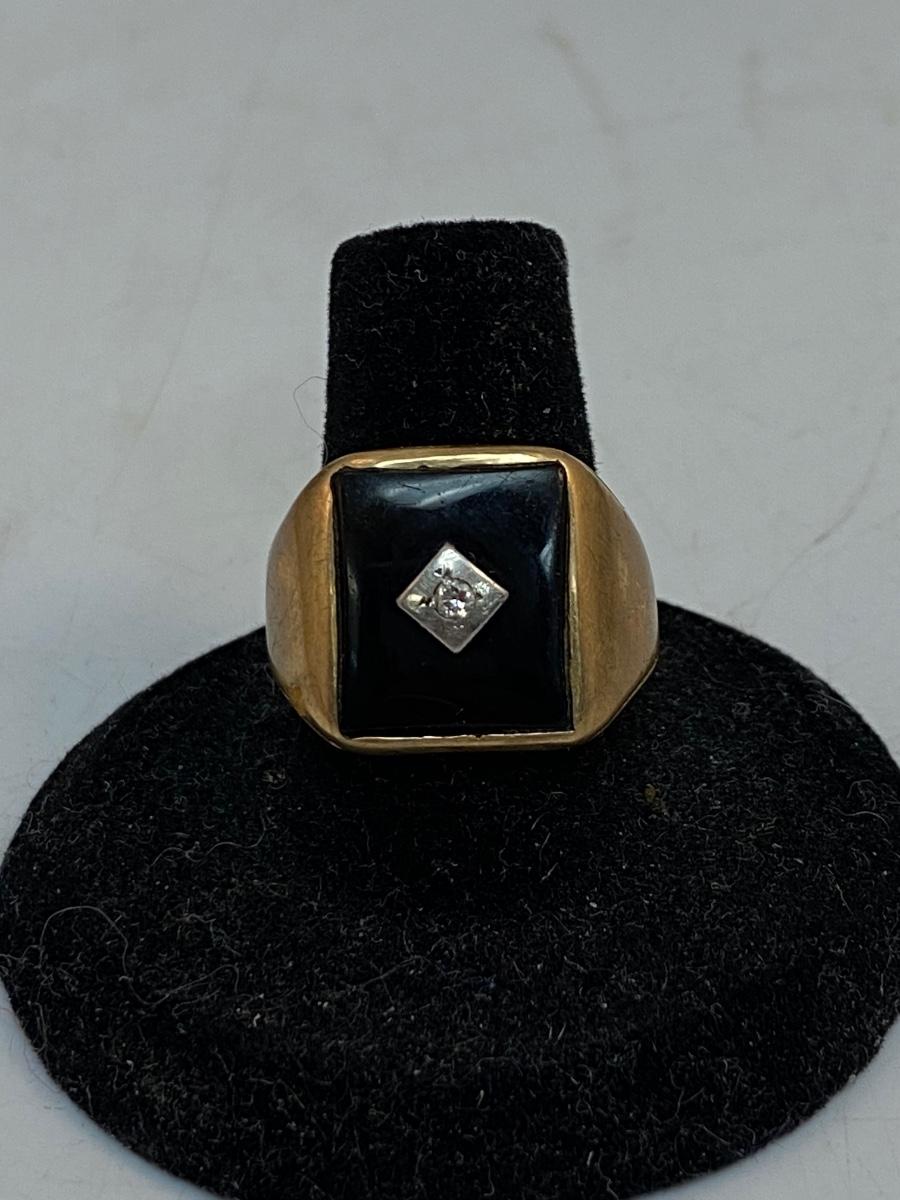 Vintage Men's 10k Yellow Gold & Onyx Ring with Diamond. In good vintage condition. Stamped inside.