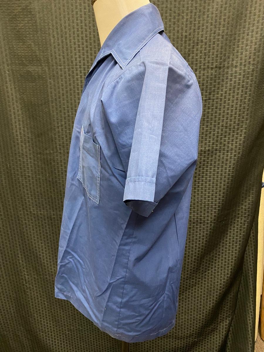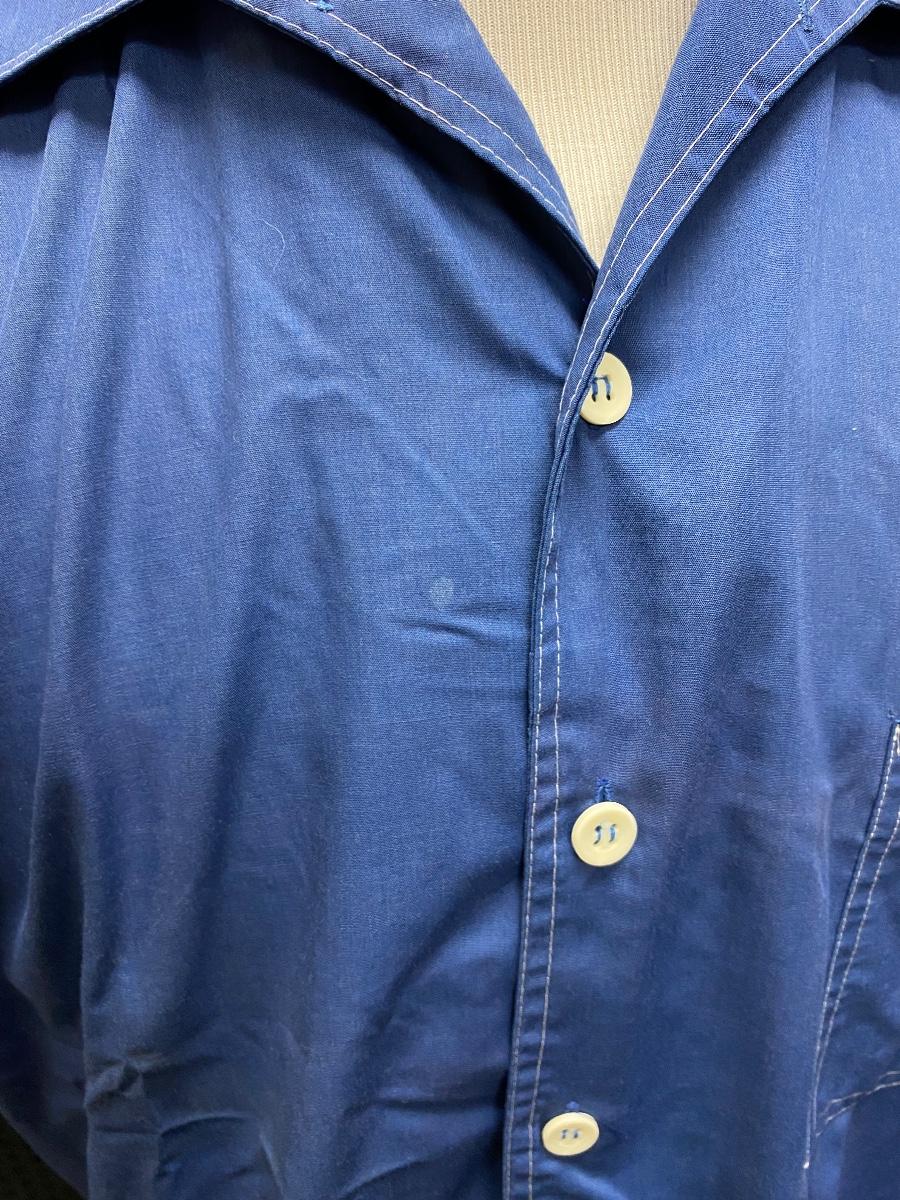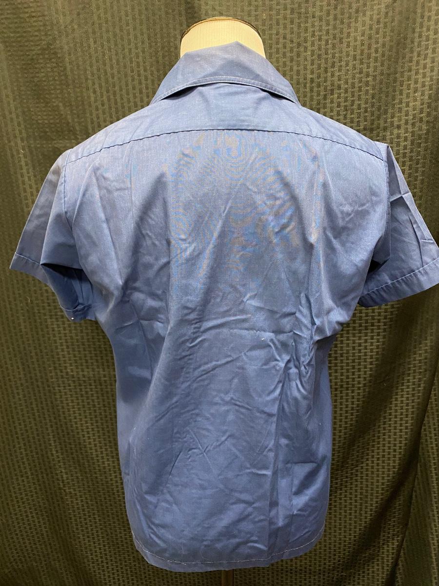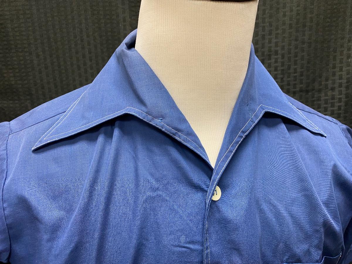 Vintage blue men's button front shirt. Short sleeve with a great pointed collar. Light spot on the front, may come clean. Size medium.