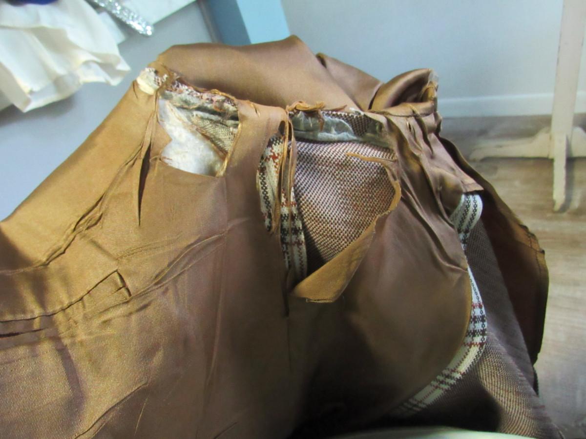 No labels, size unknown, material unknown. Has wear and needs cleaning. The lining is all torn out at the arm pits.