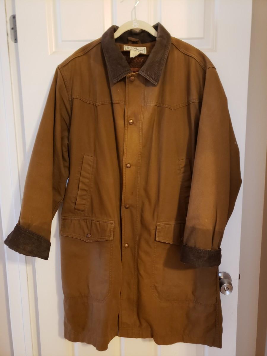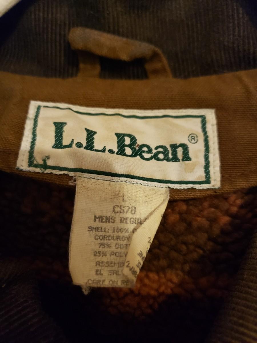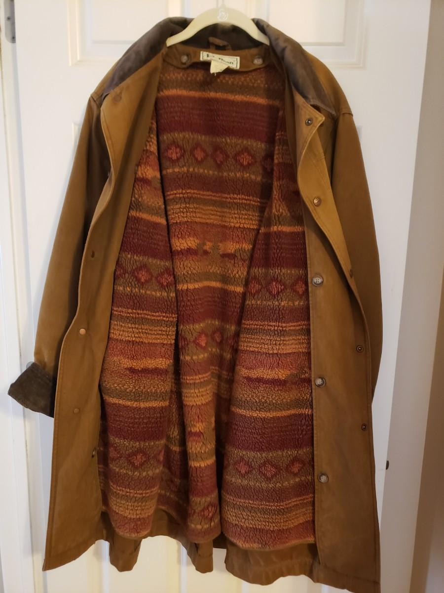 Mens L L Bean Brown canvas barn coat. Button out Aztec lining. Corduroy cuffs & collar with snap closure