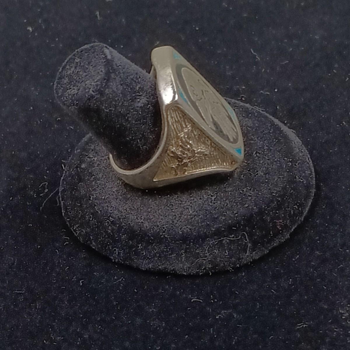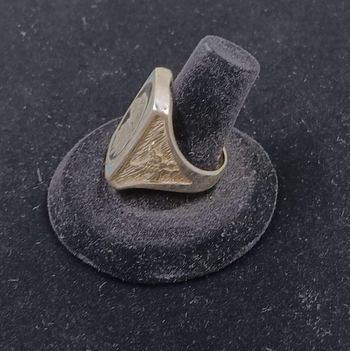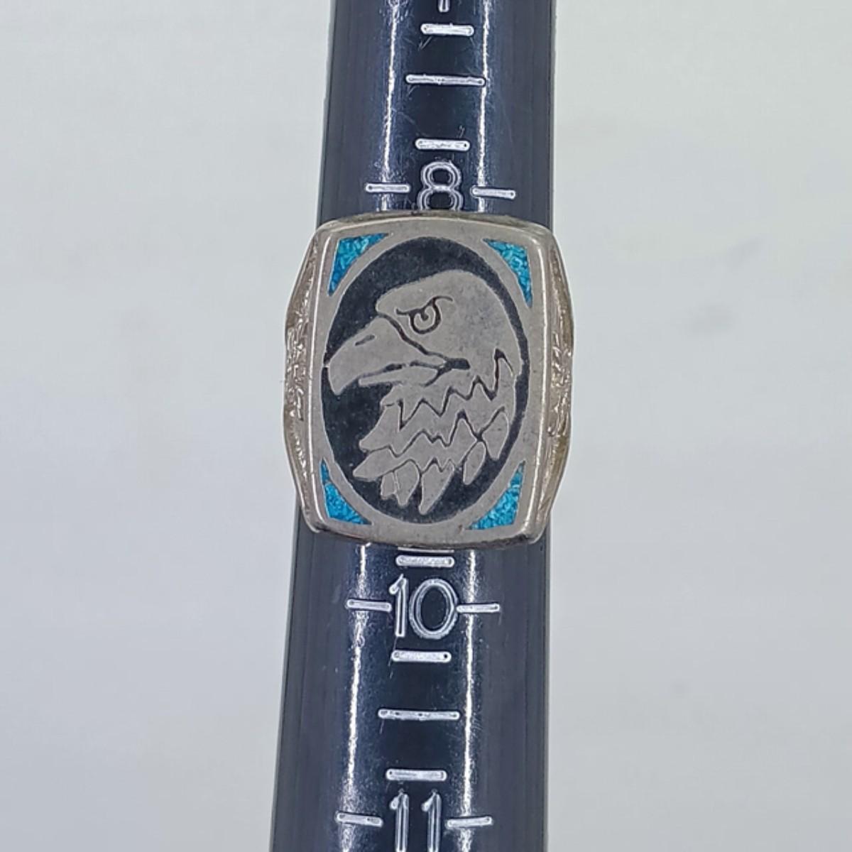 This vintage sterling silver men's eagle ring features and eagle on the face set in onyx with turquois accents. The ring also has a carved eagle on each side. The ring weighs 14.9 grams and is a size 10.