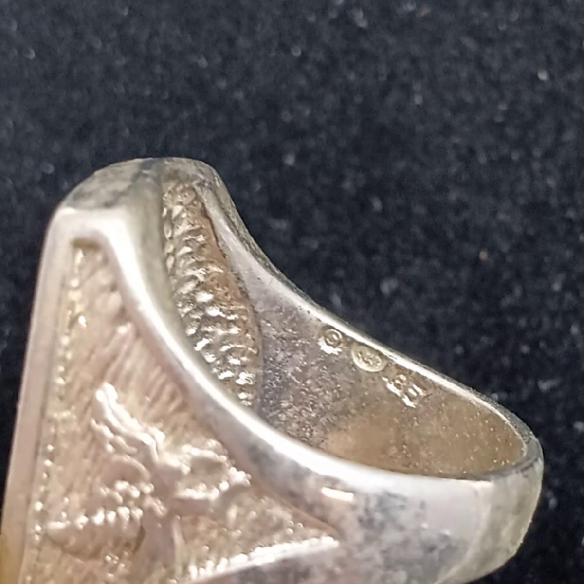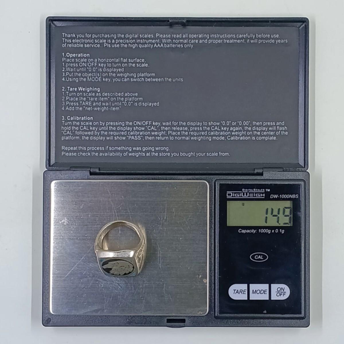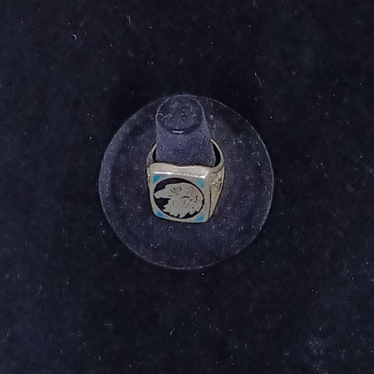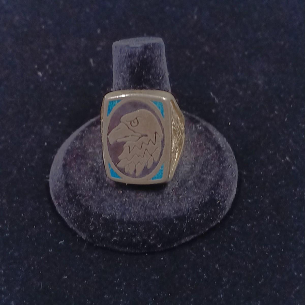 This vintage sterling silver men's eagle ring features and eagle on the face set in onyx with turquois accents. The ring also has a carved eagle on each side. The ring weighs 14.9 grams and is a size 10.