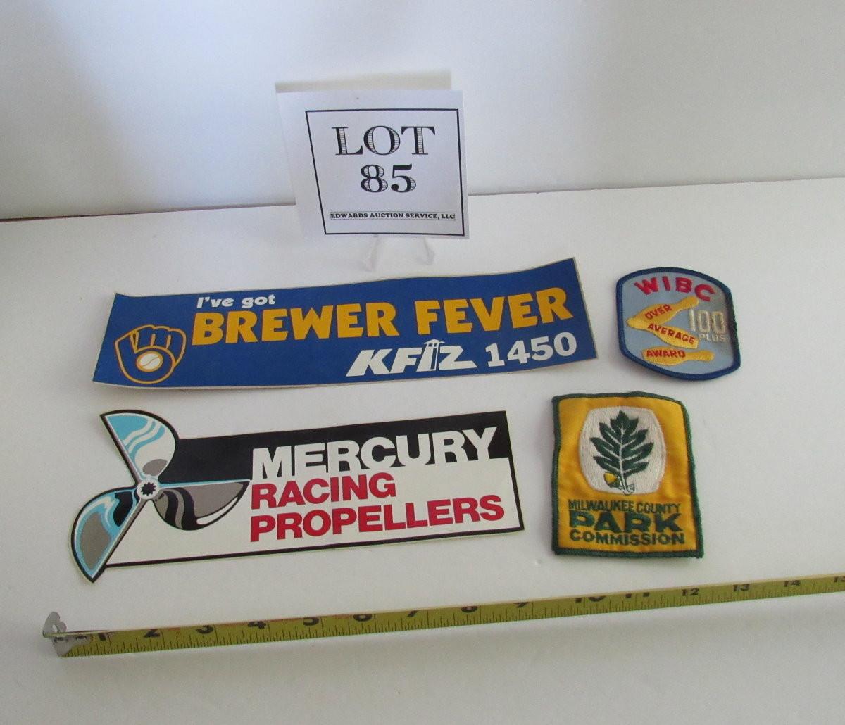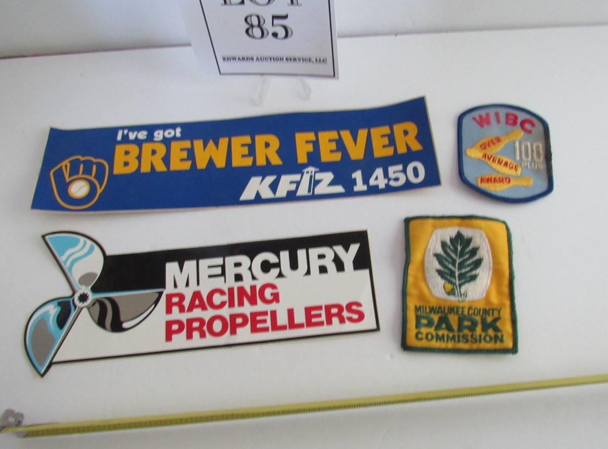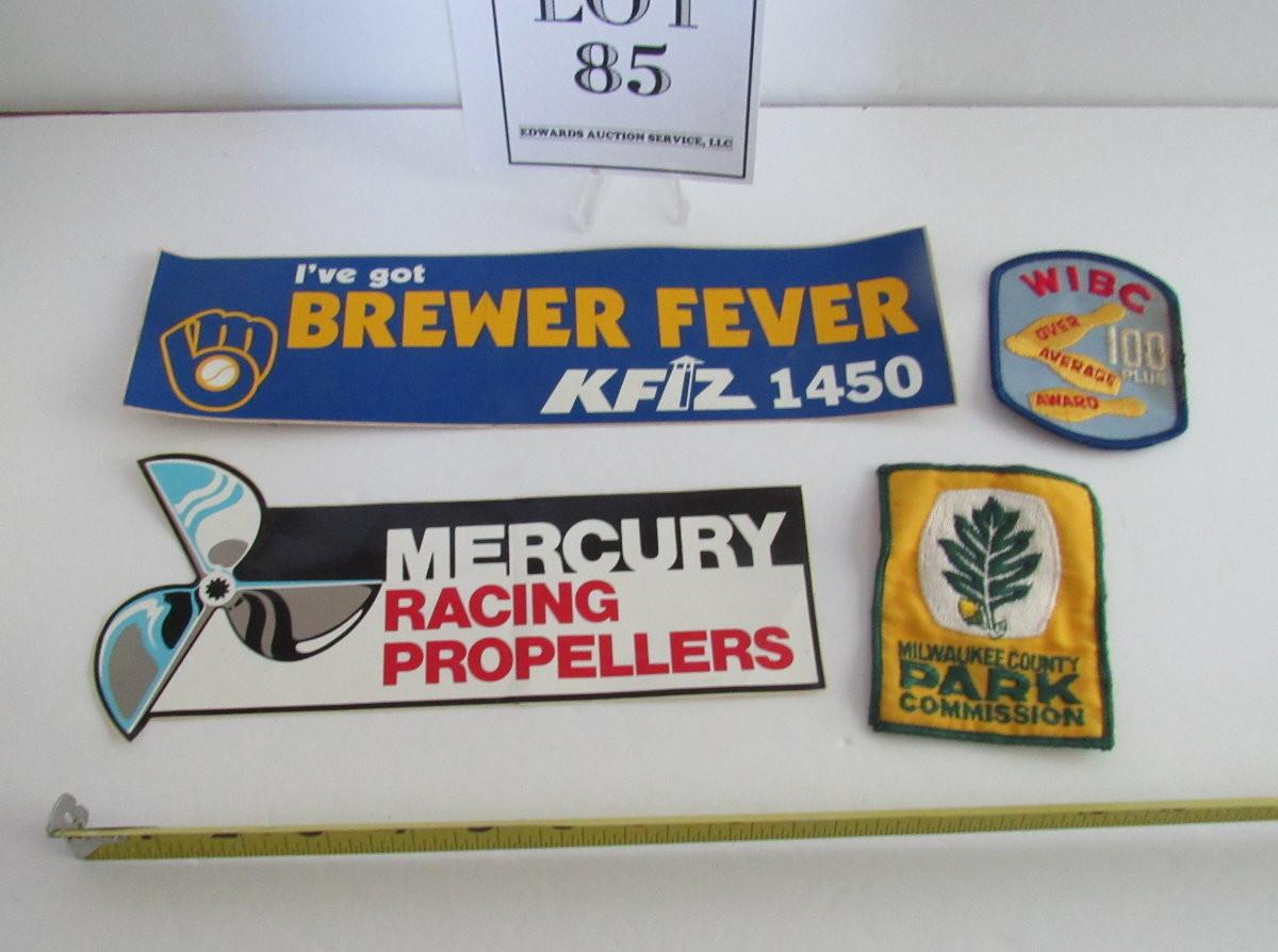 Vintage Mercury Racing Propellers and Brewers Bumper Stickers and 2 Patches
