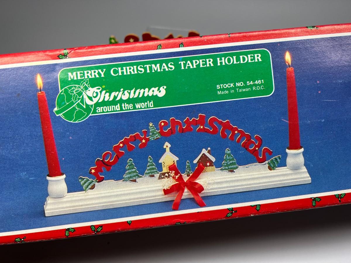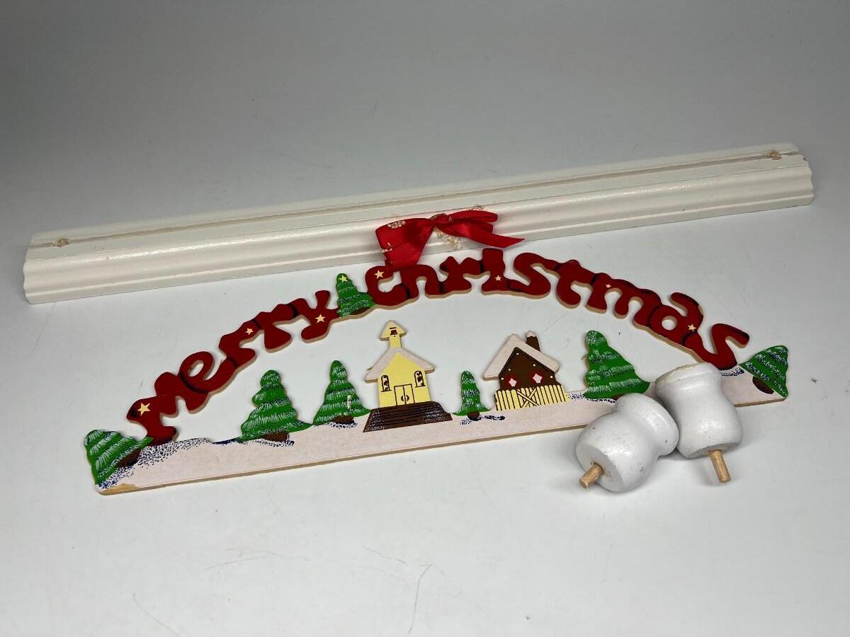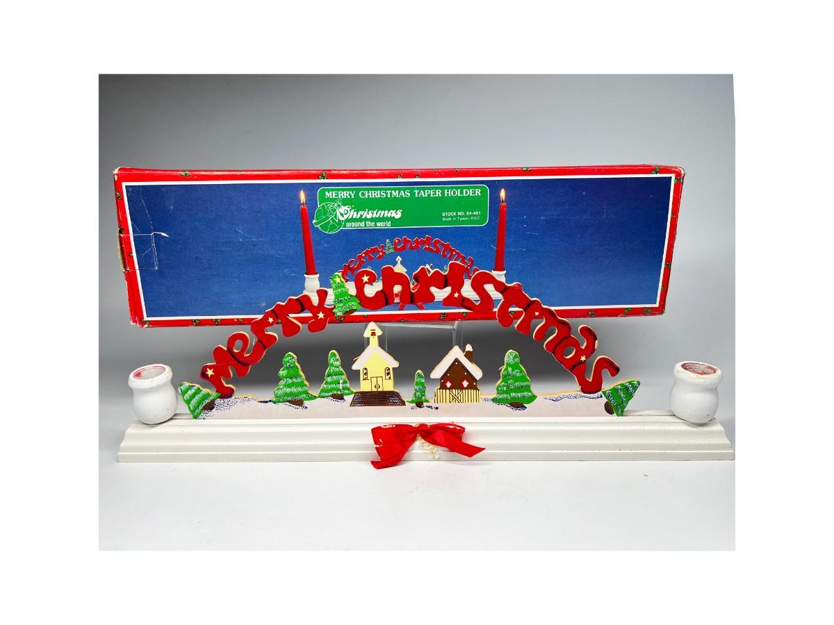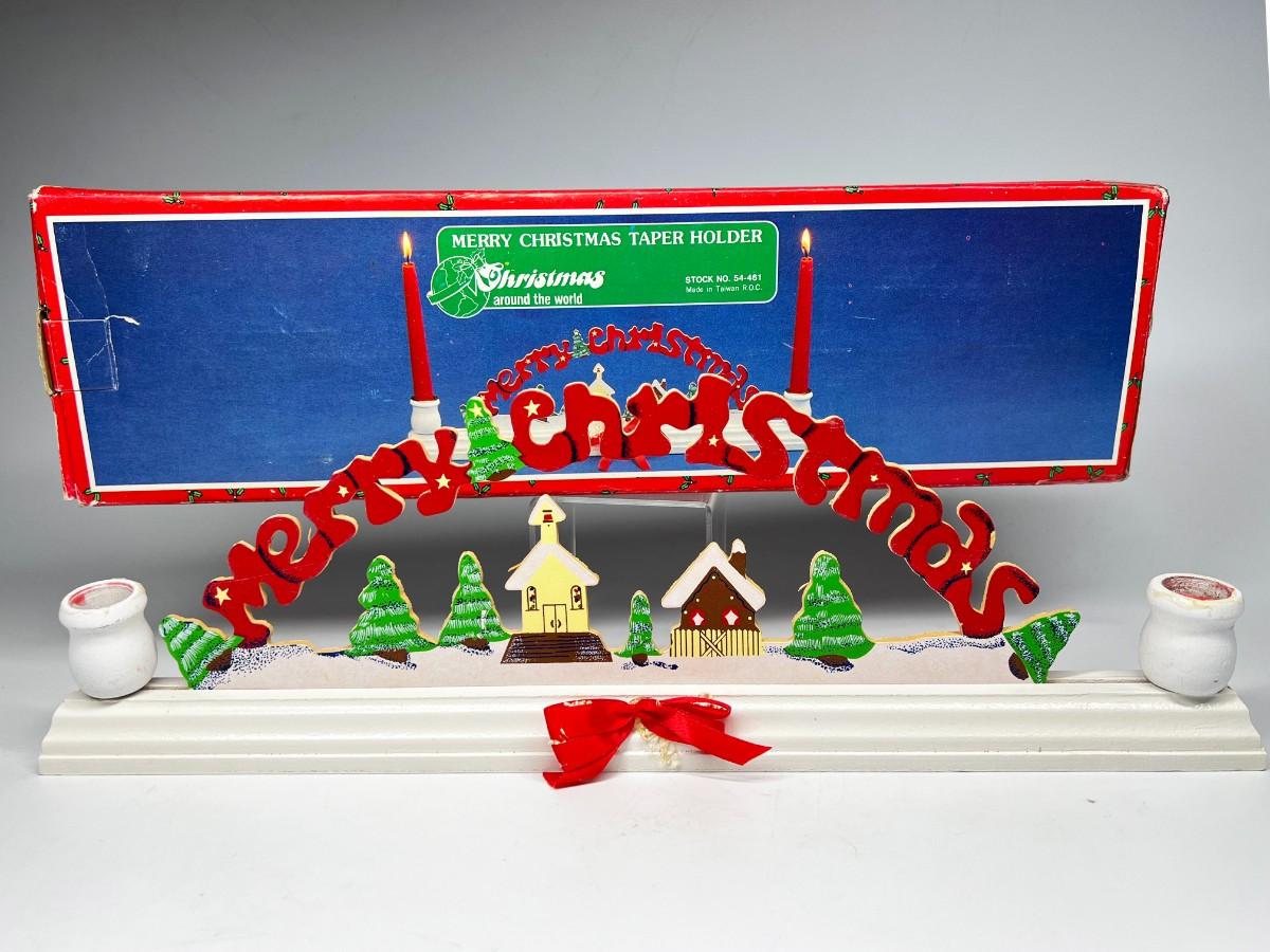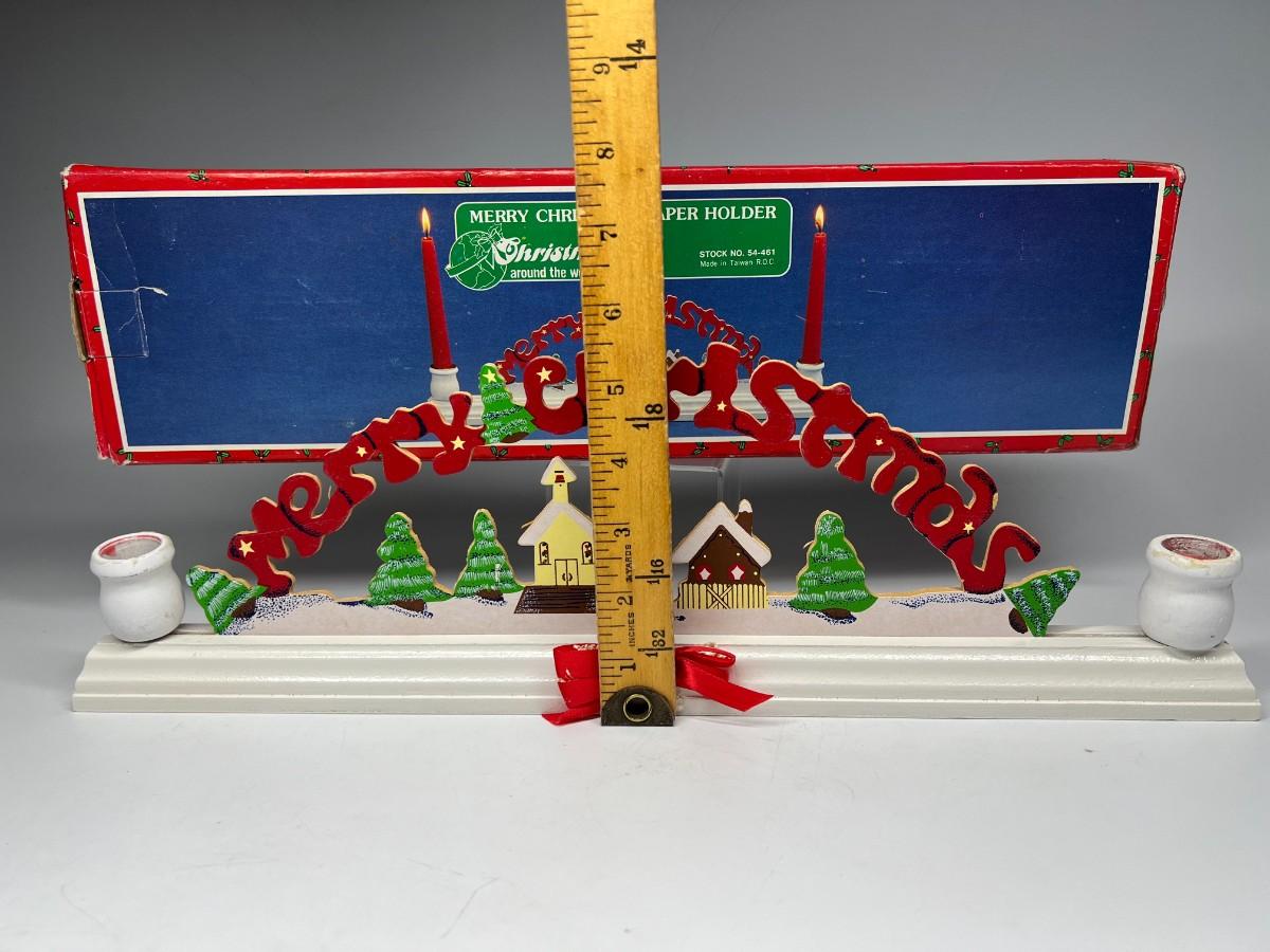 Vintage Merry Christmas Painted Wood Candle Holder Mantle Shelf Display. Has original box. Good condition.