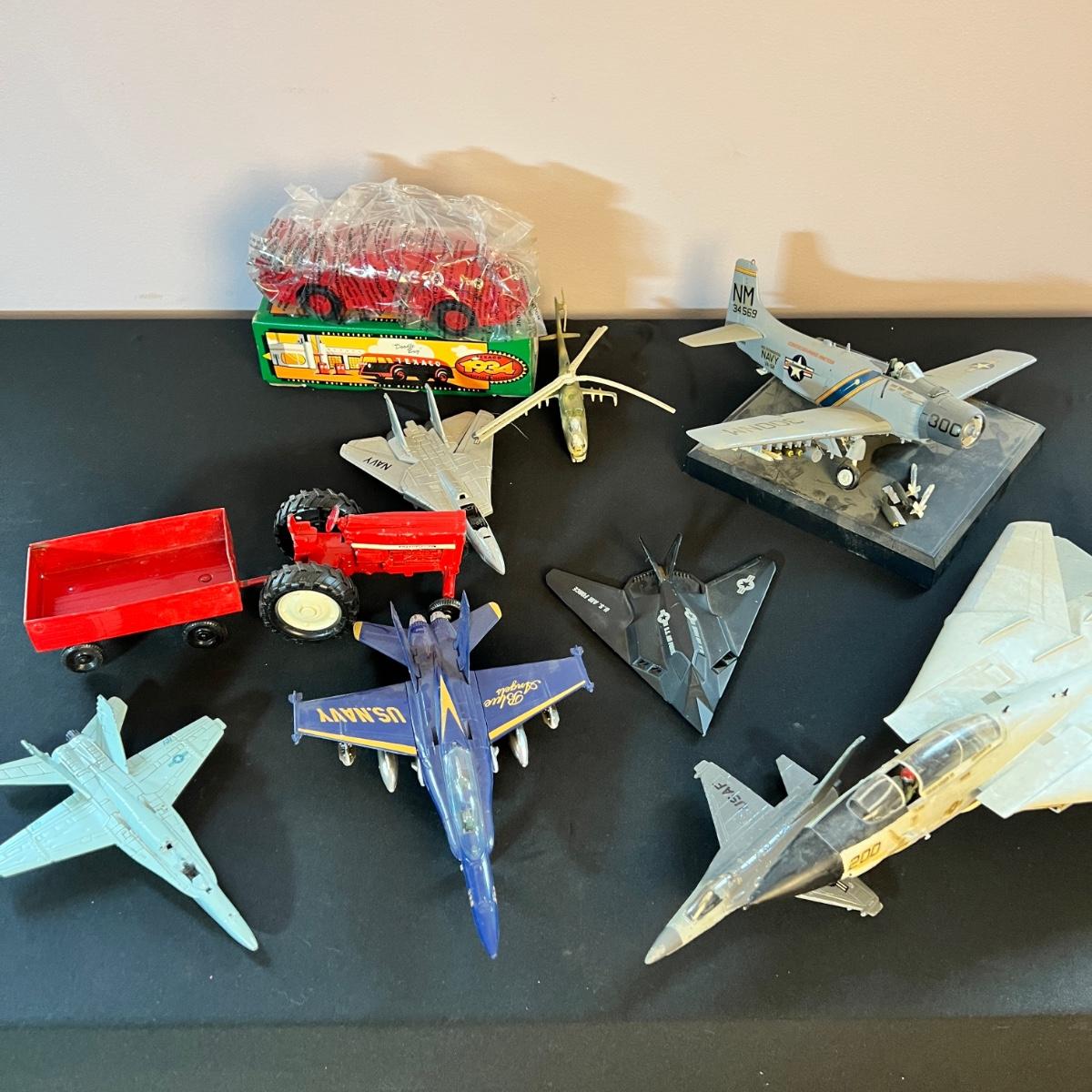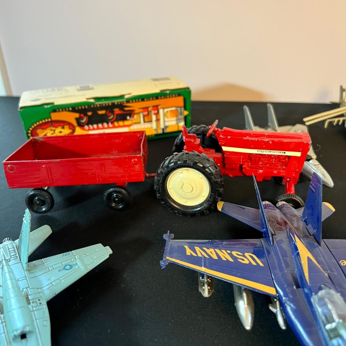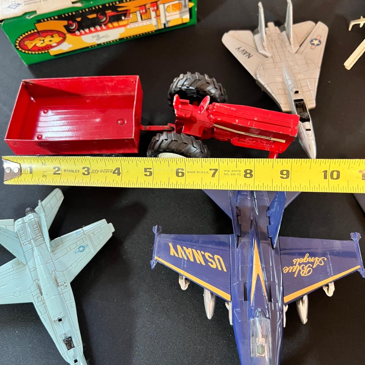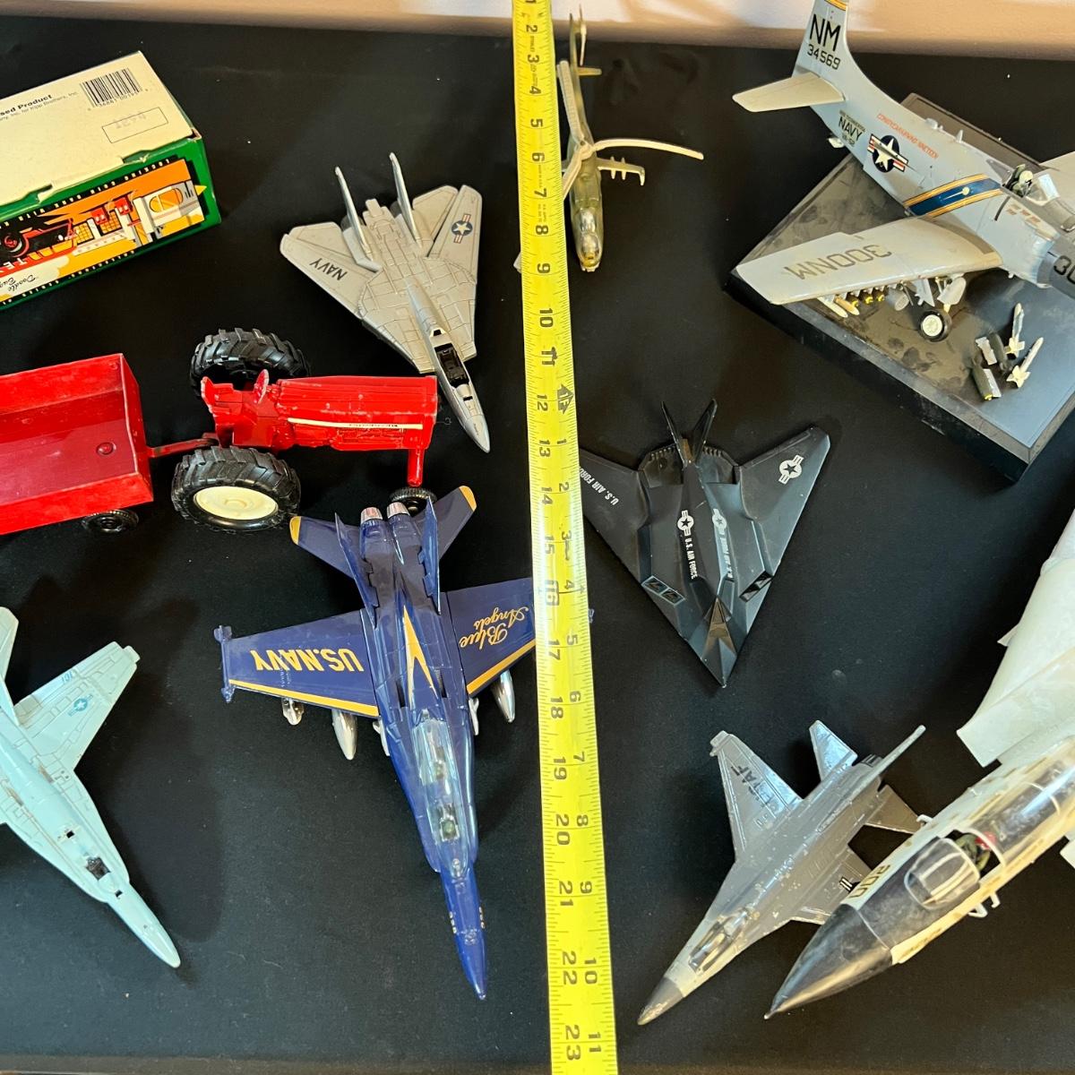 The 2 larger planes are plastic. The smaller jets are metal, metal tractor, NIB Ertl Texaco die cast metal truck.