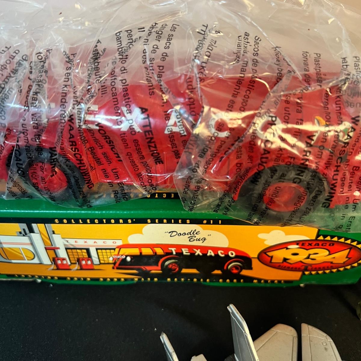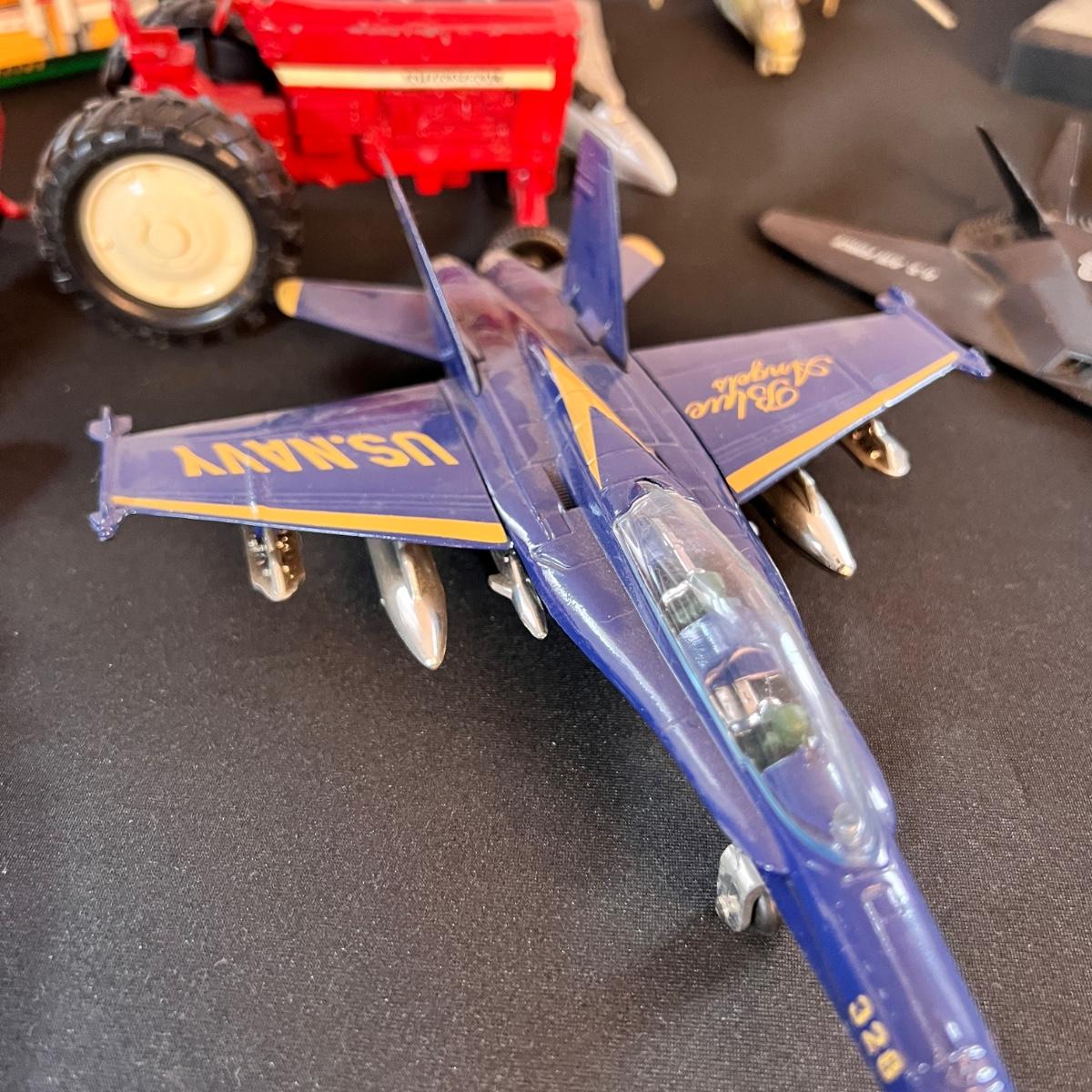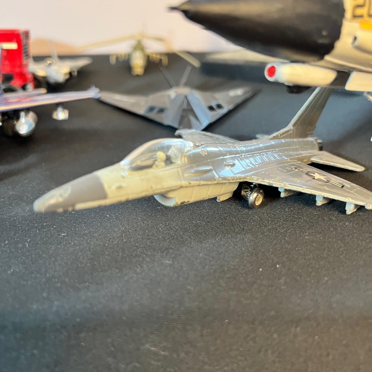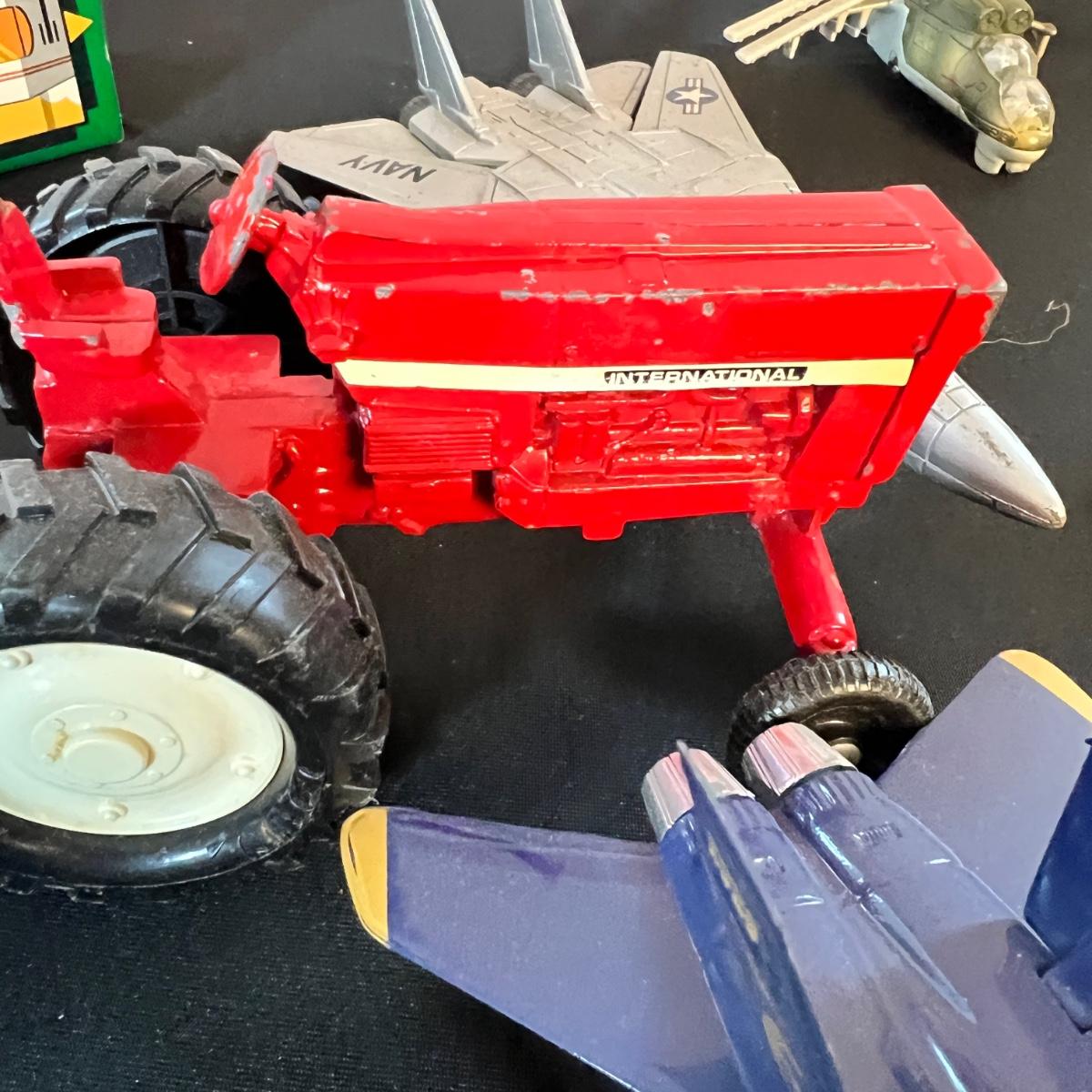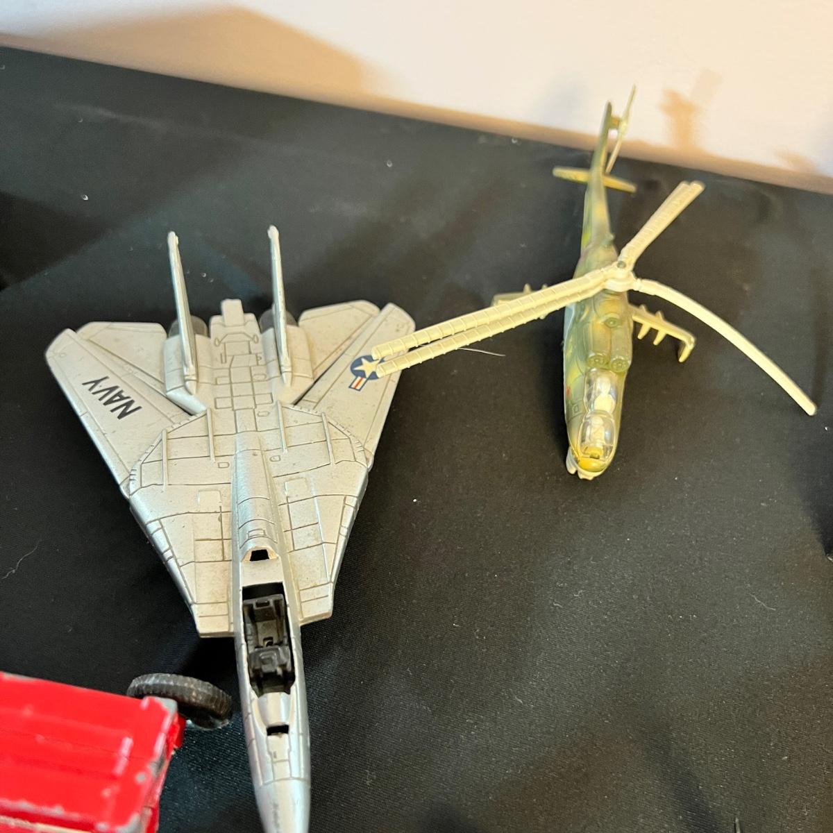 The 2 larger planes are plastic. The smaller jets are metal, metal tractor, NIB Ertl Texaco die cast metal truck.