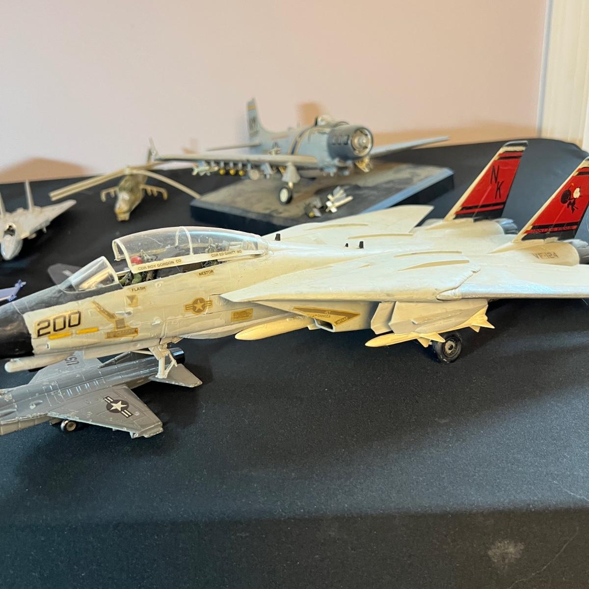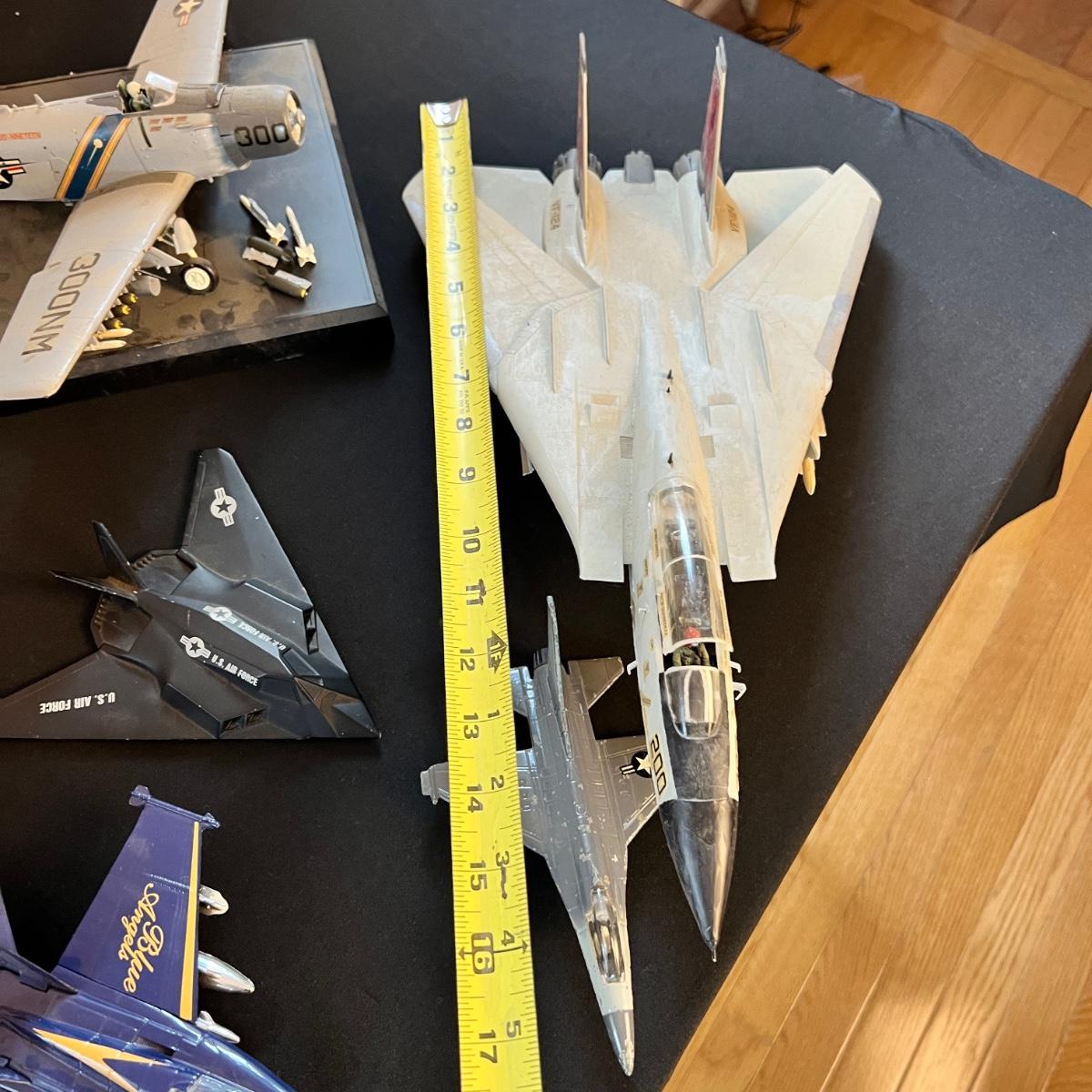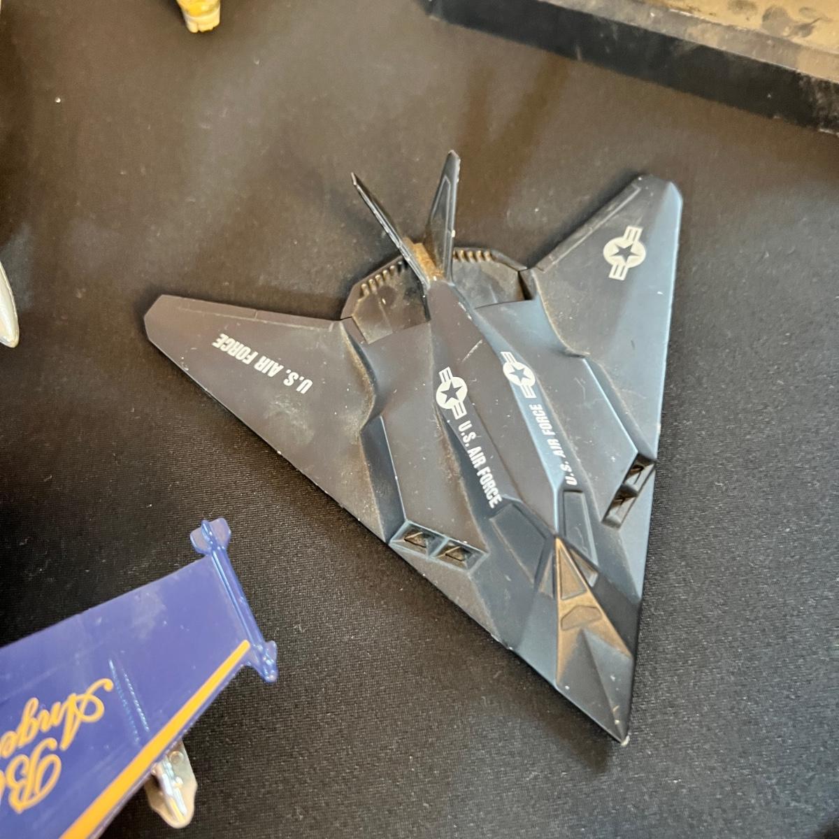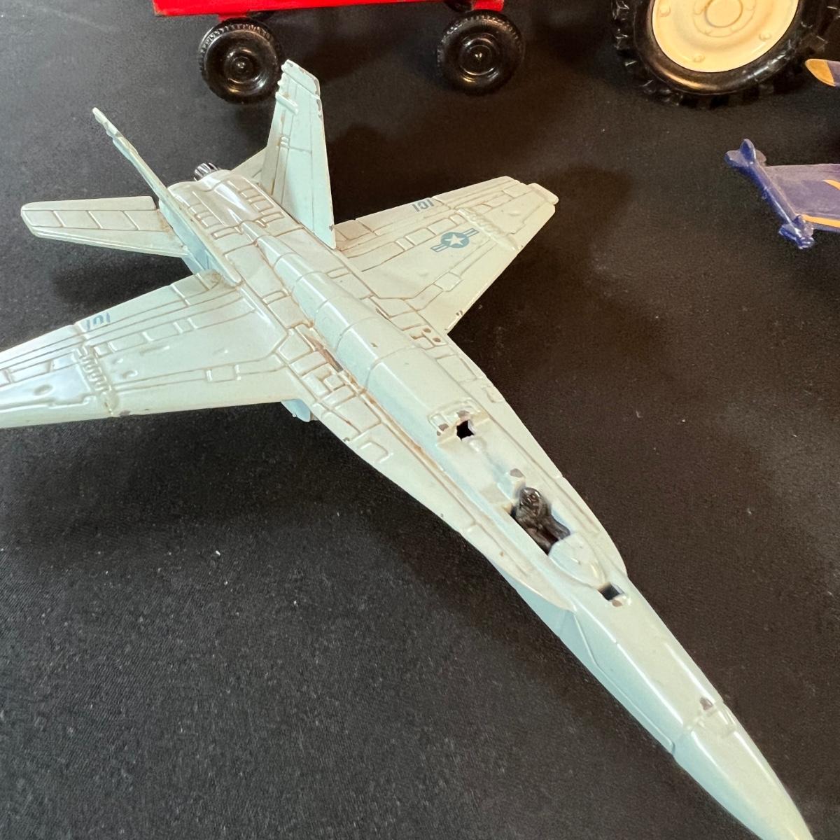 The 2 larger planes are plastic. The smaller jets are metal, metal tractor, NIB Ertl Texaco die cast metal truck.