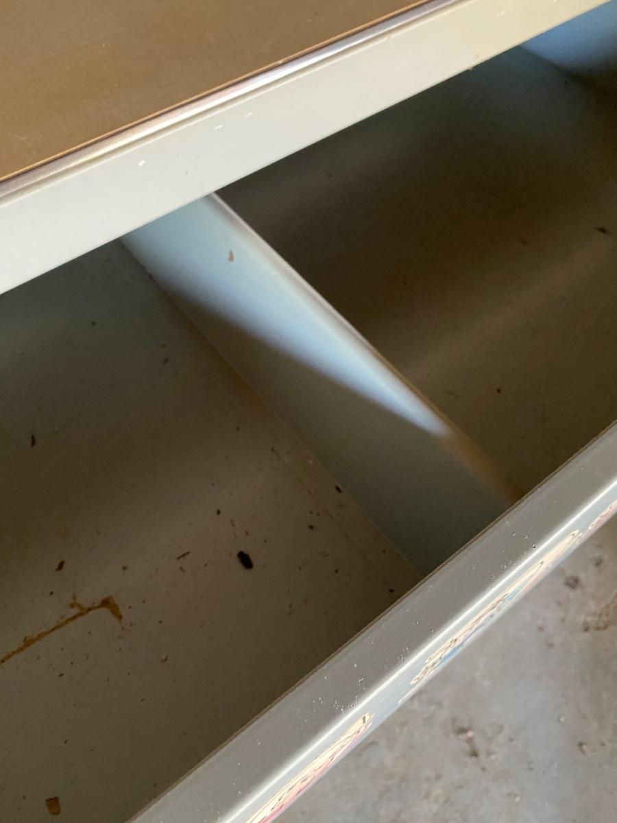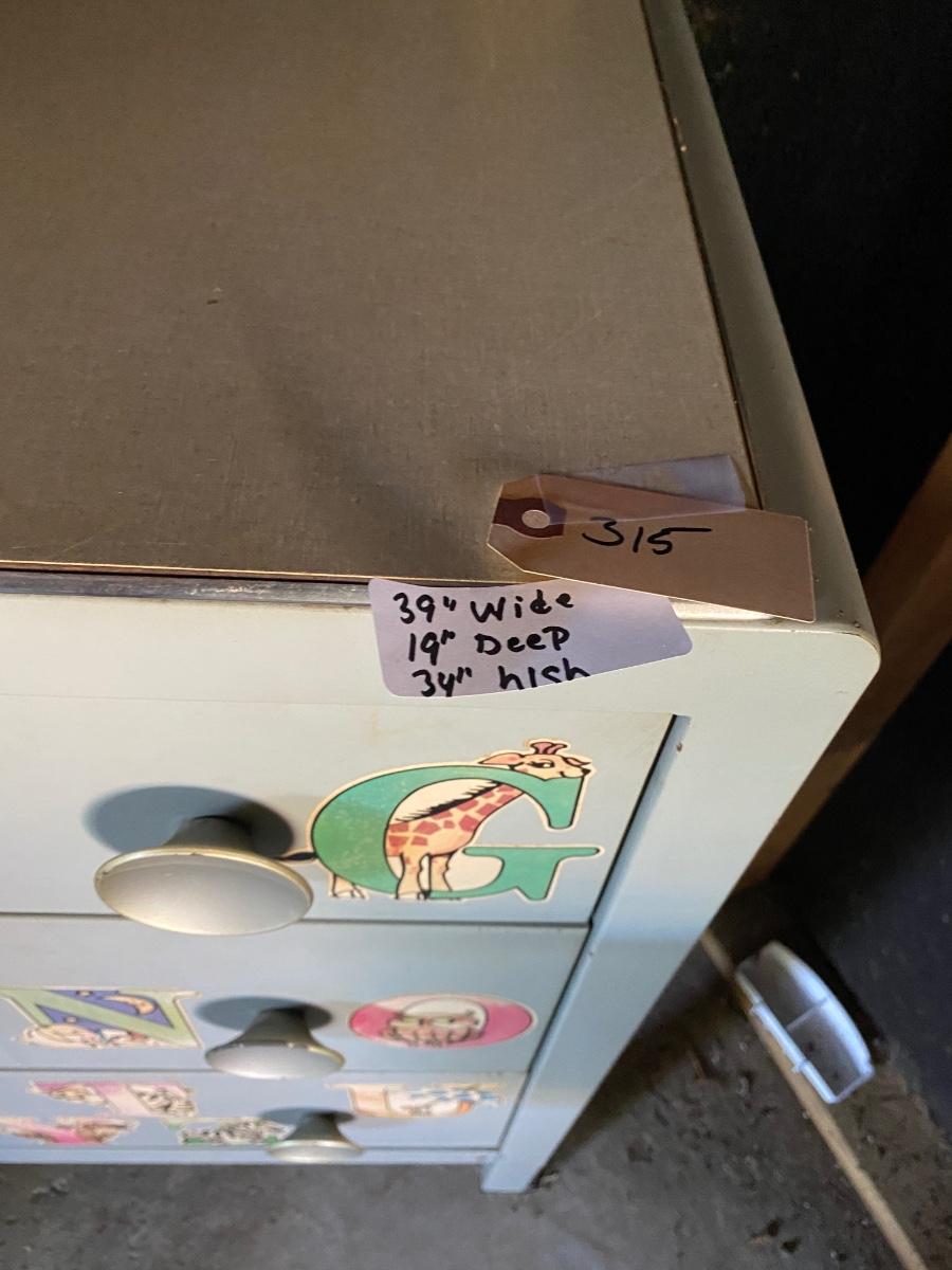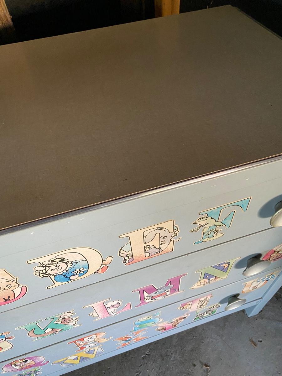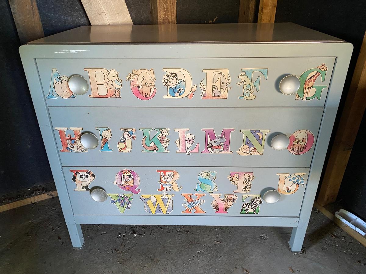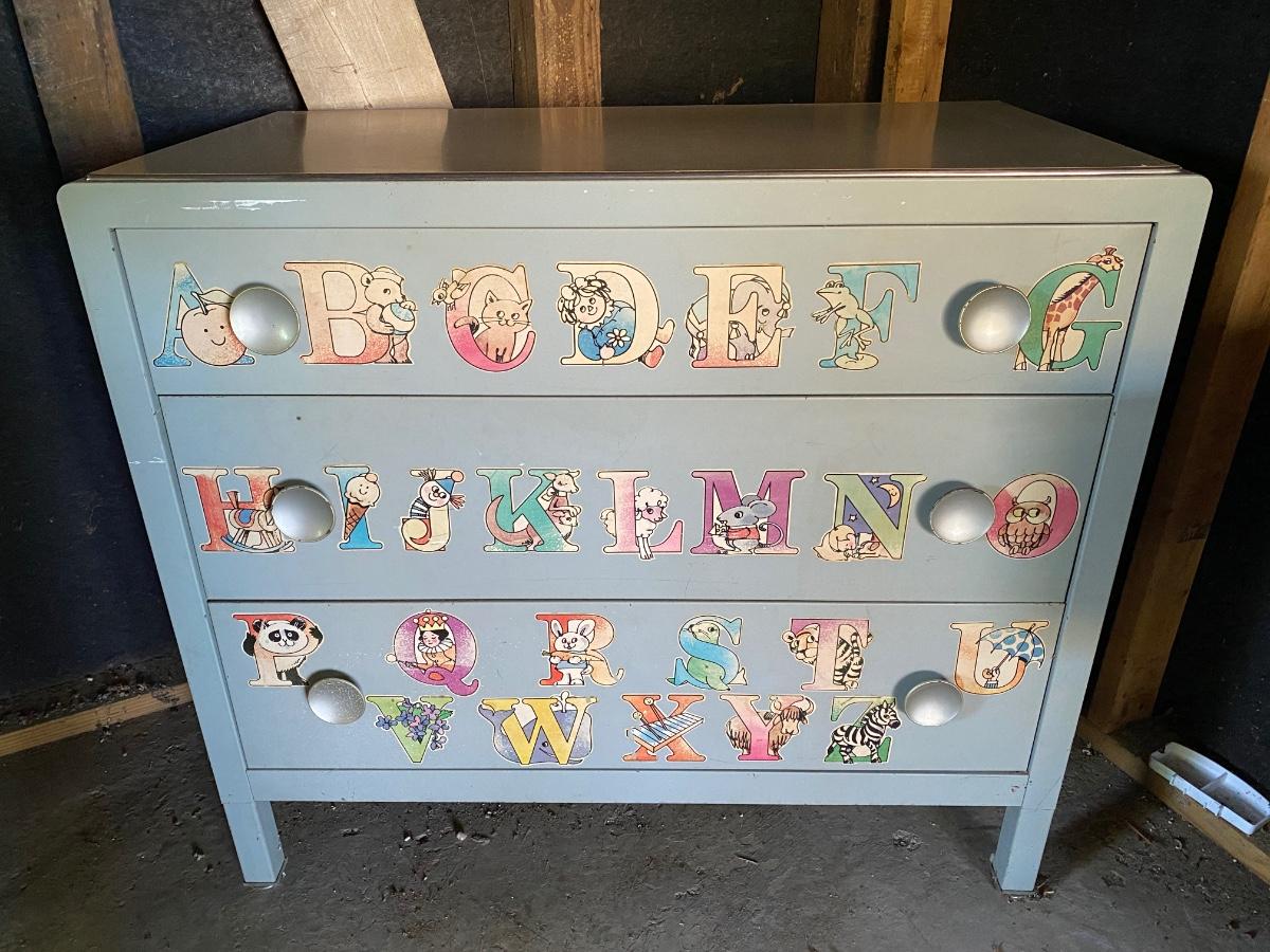 Vintage Metal 3 drawer chest 39x19x34, alphabet decorated as pictured