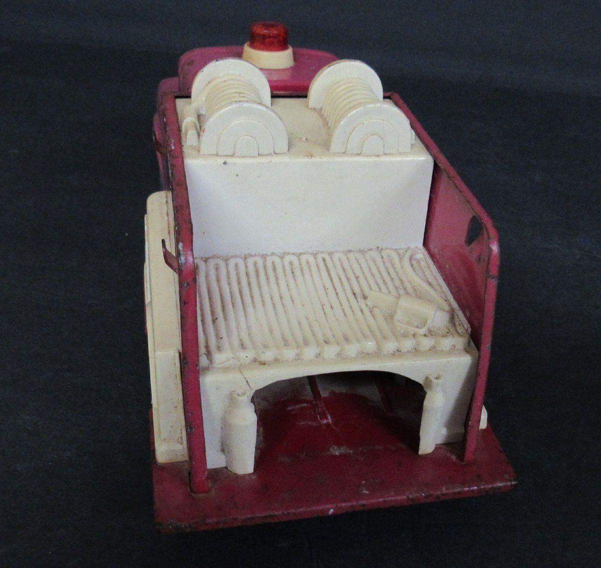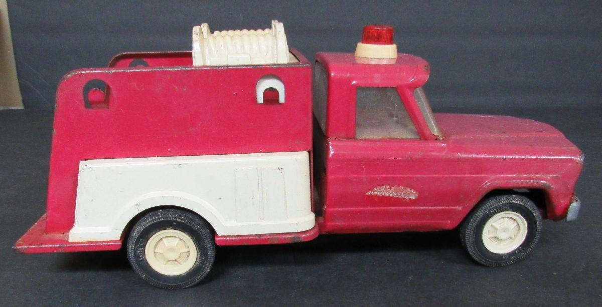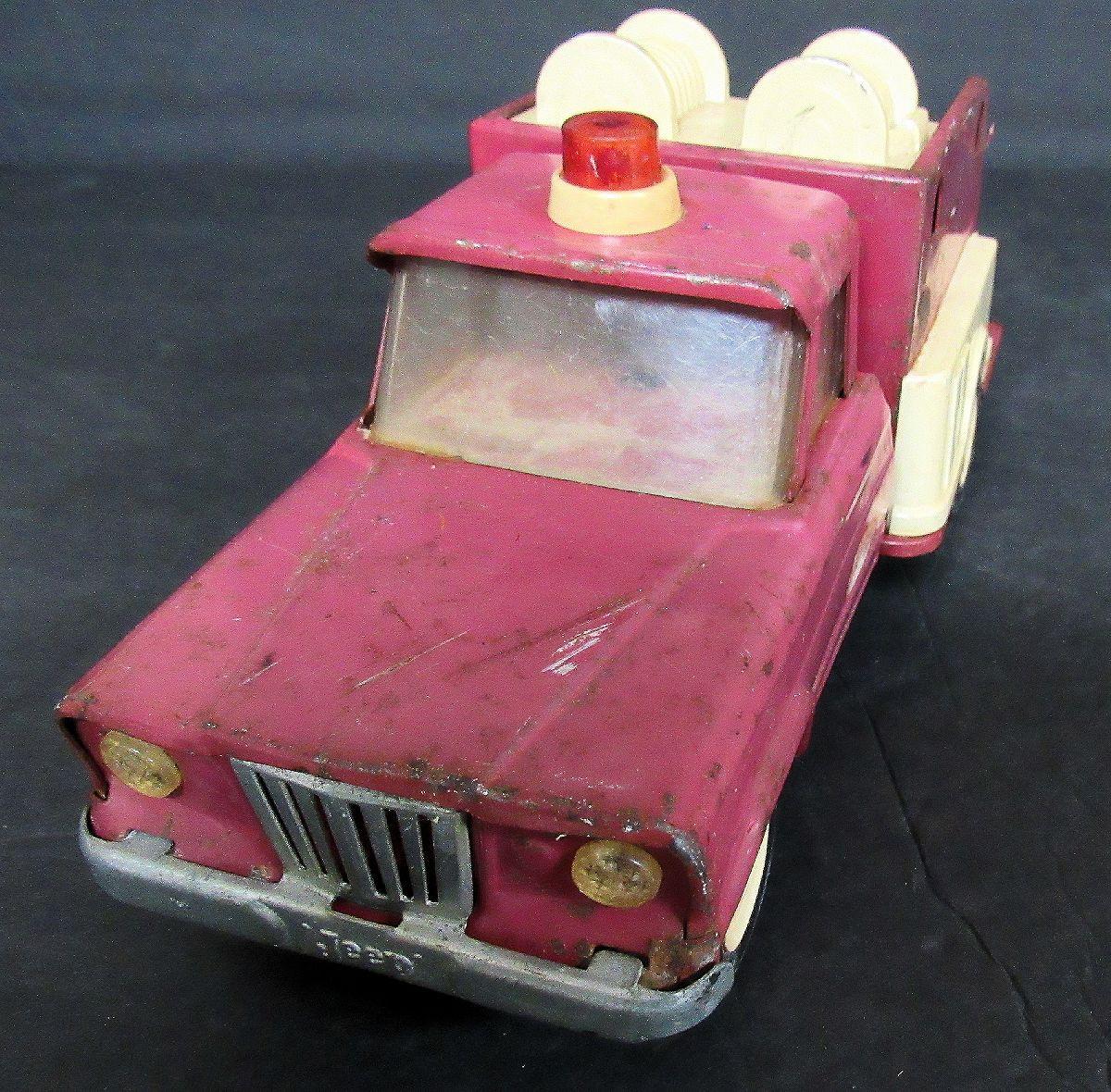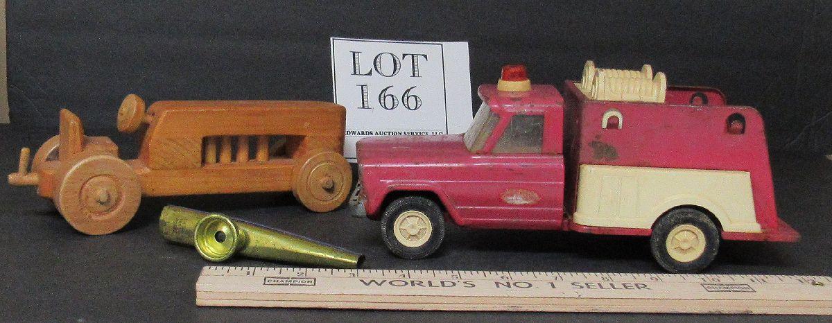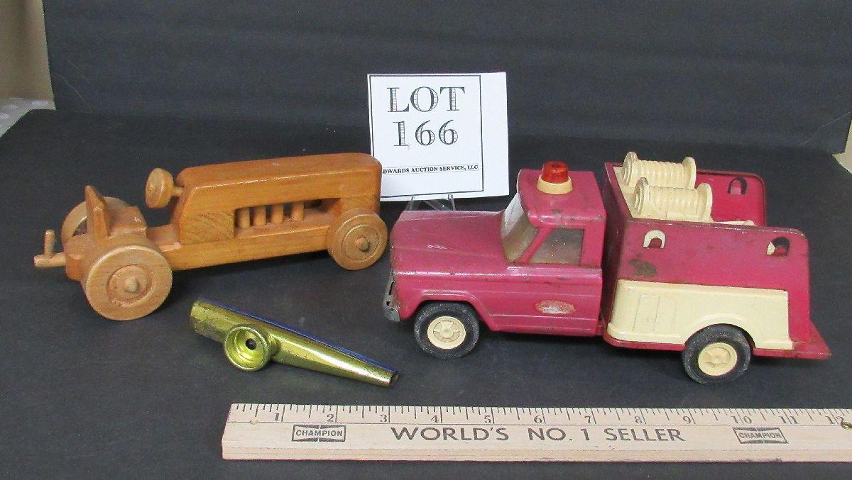 Vintage Metal and Plastic Fire Truck, Wood Car and Tin Kazoo