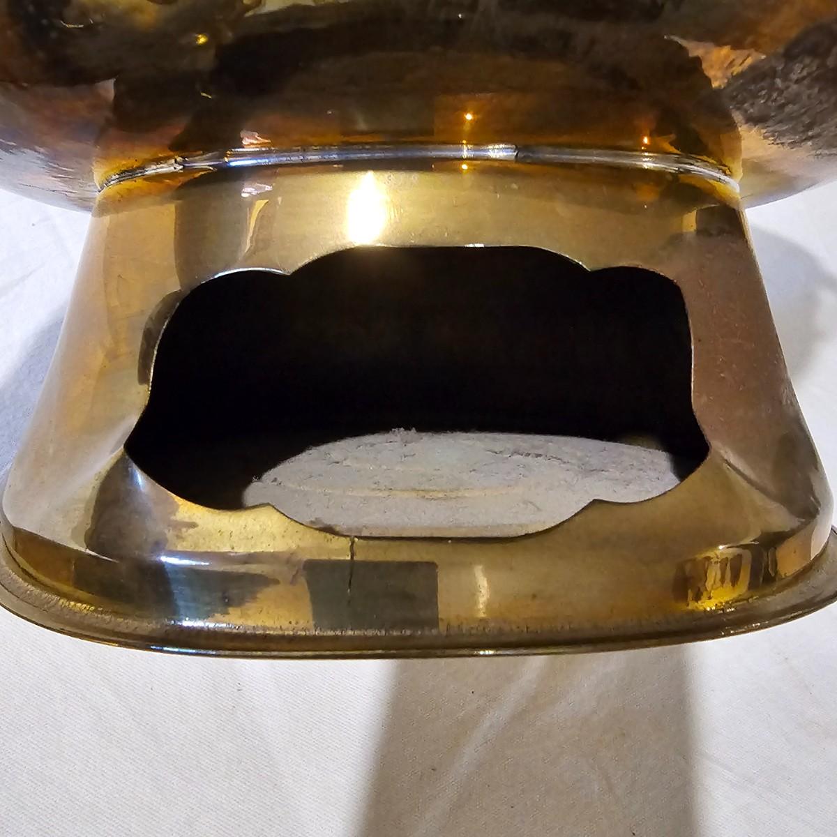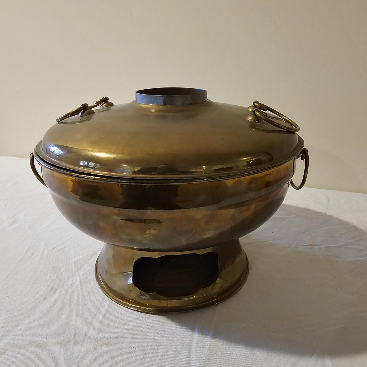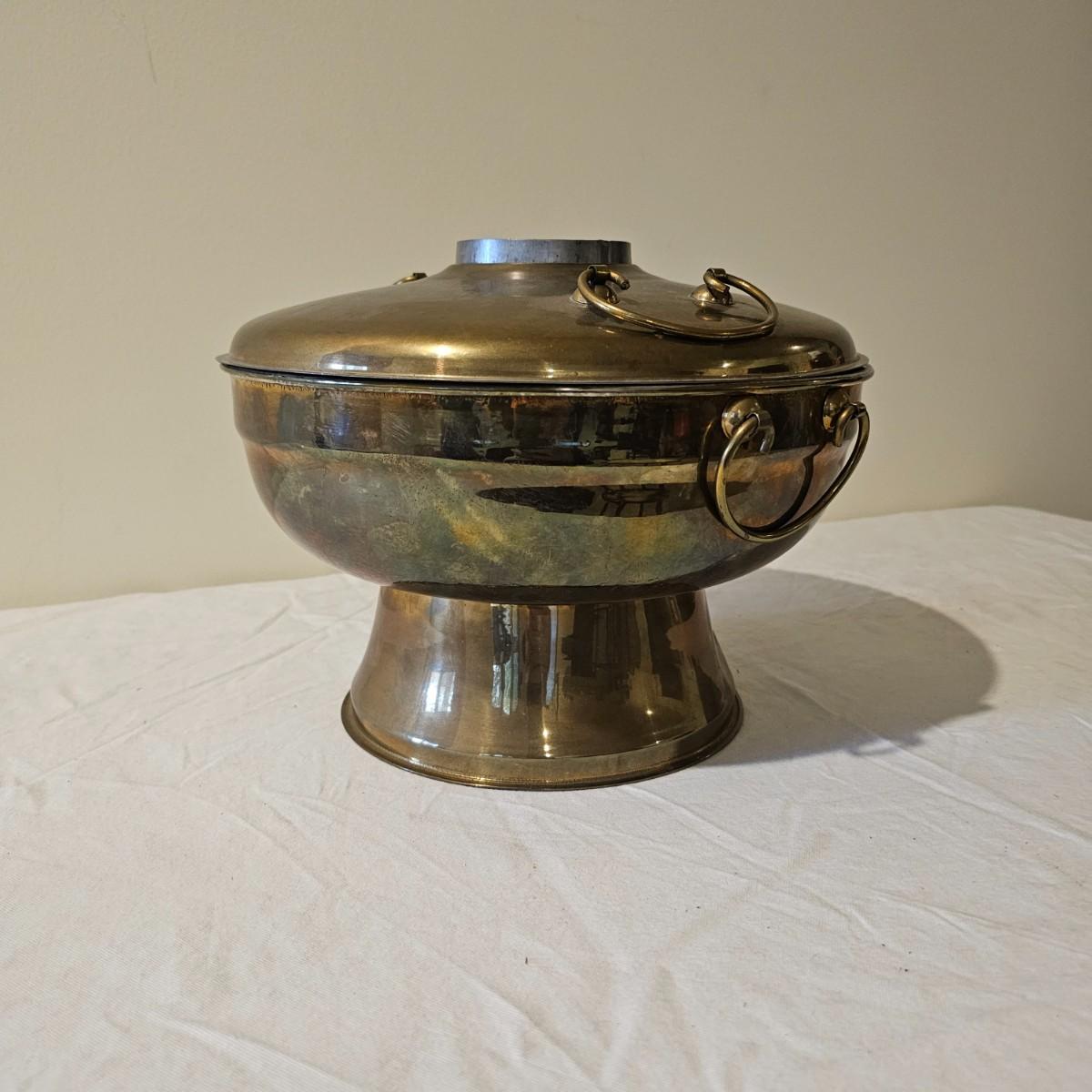 Tabletop style brazier for heating/keeping things warm. Item has lift off lid, opening in base for fuel. Piece measures 12.5"D x 9"H. May be brass plate over base metal. See photos for details. Shipping available.