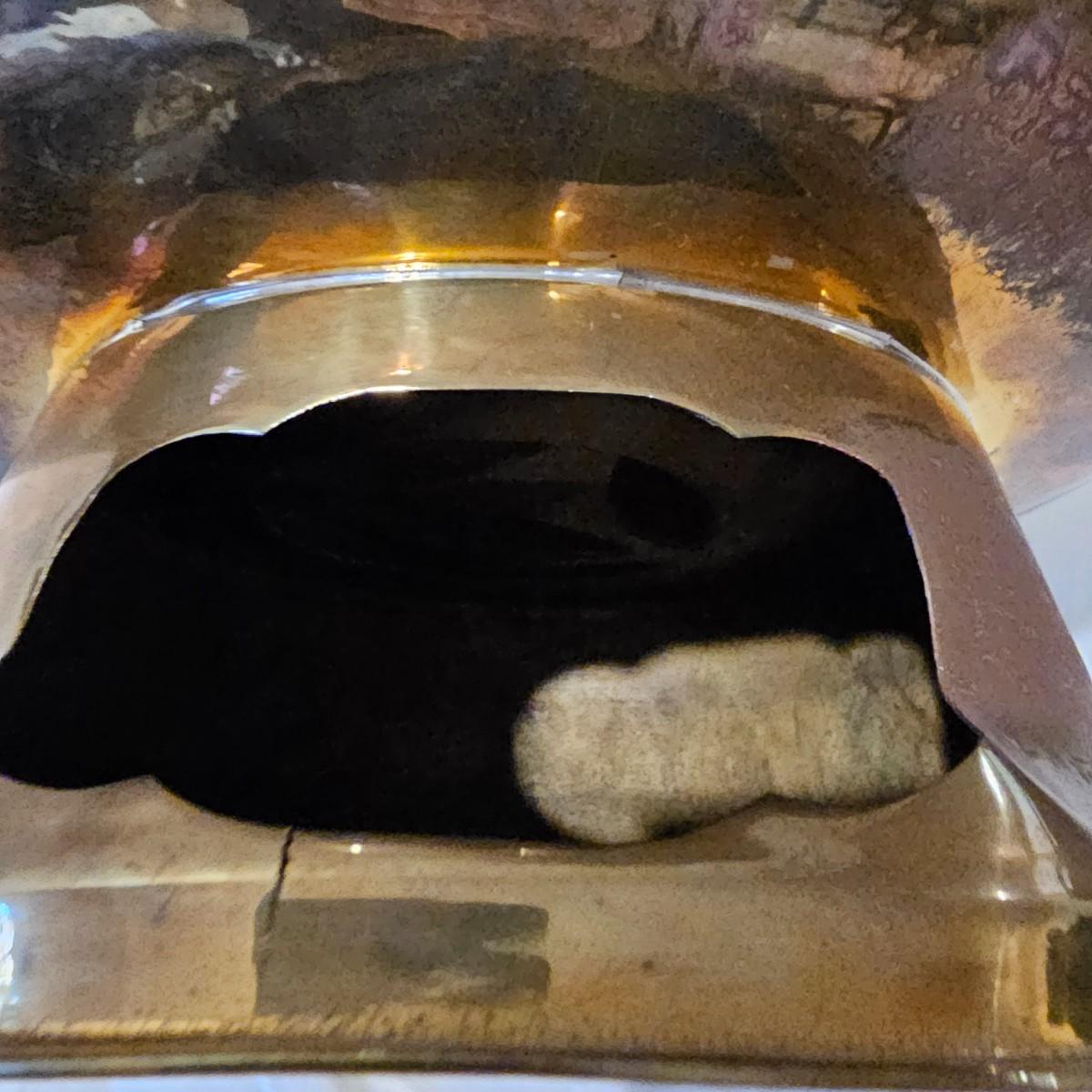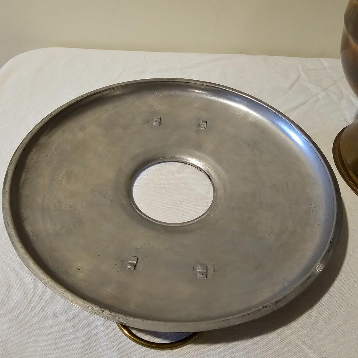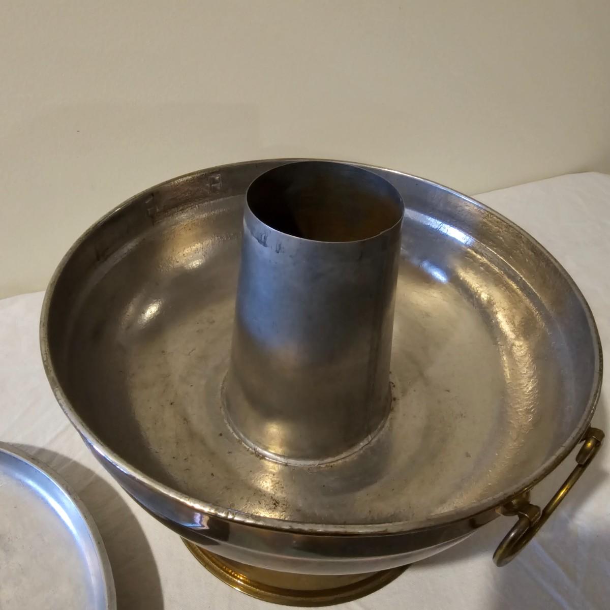 Tabletop style brazier for heating/keeping things warm. Item has lift off lid, opening in base for fuel. Piece measures 12.5"D x 9"H. May be brass plate over base metal. See photos for details. Shipping available.
