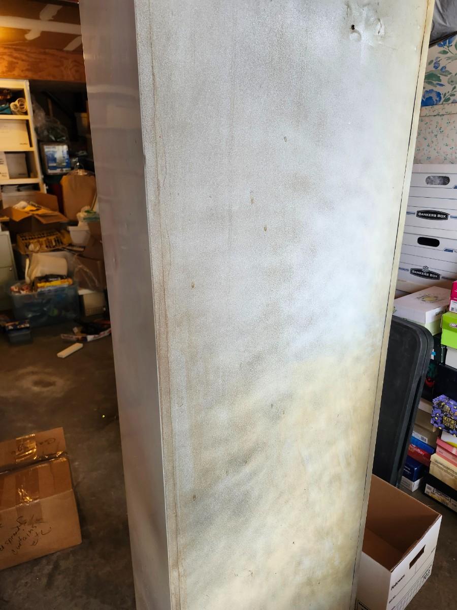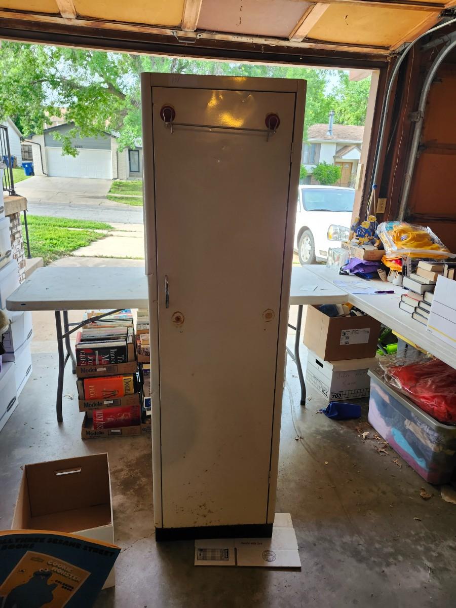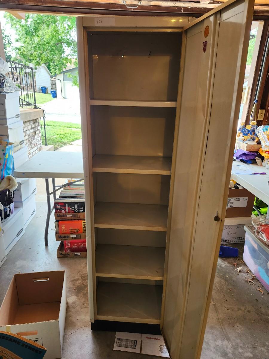 Vintage Metal Cabinet, one door, rounded top, 5 shelves. 18w x 15 deep x65 tall