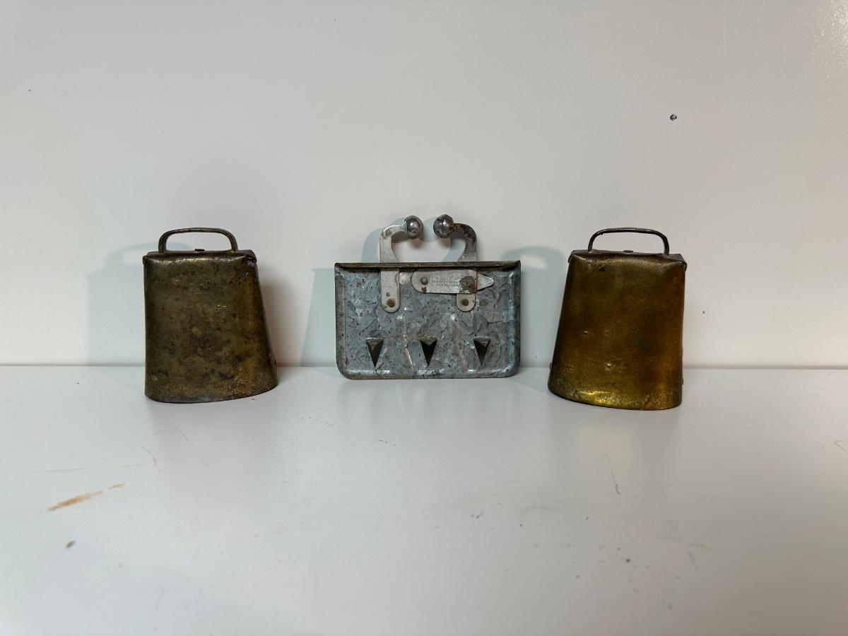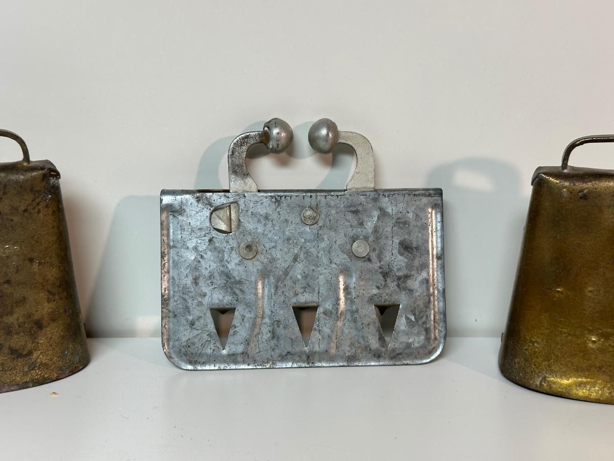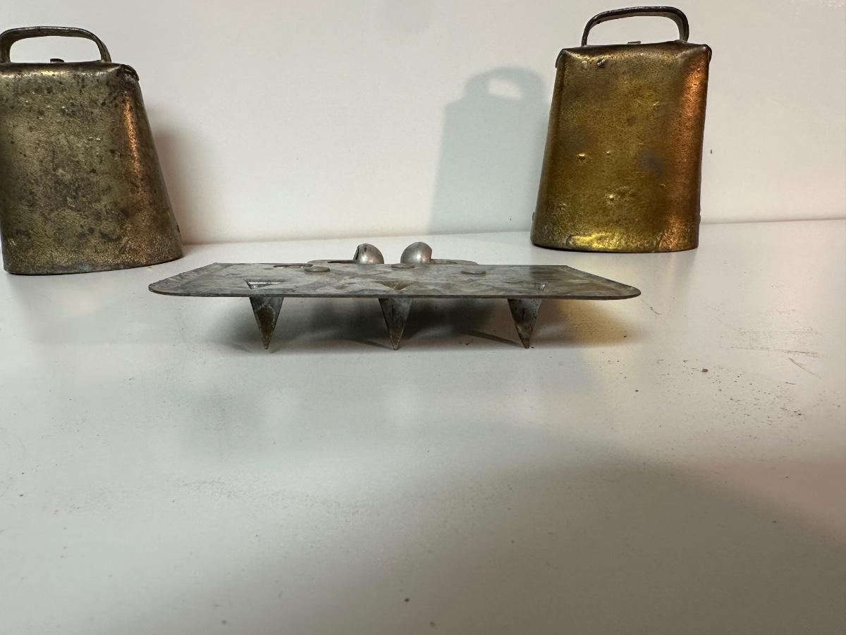VINTAGE METAL CALF WEANER AND 2 COW BELLS