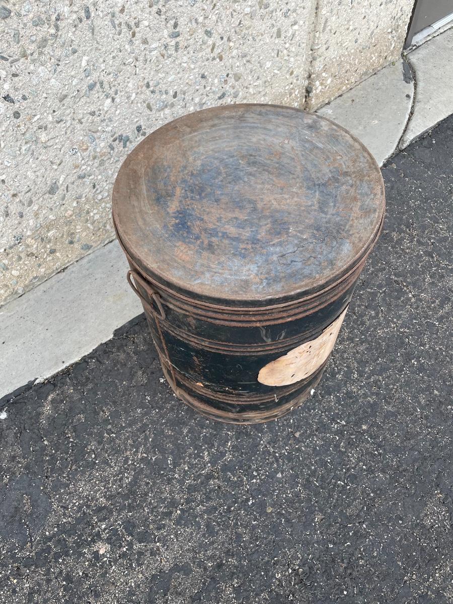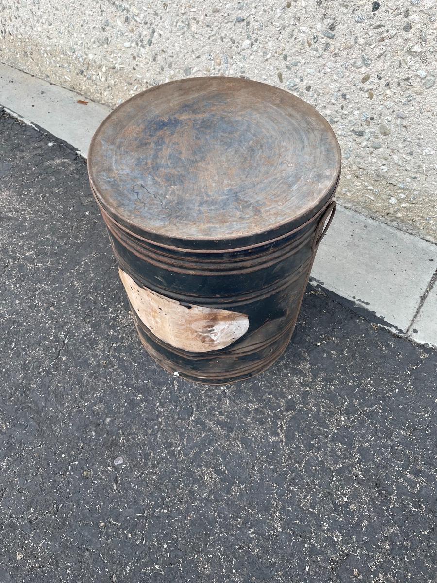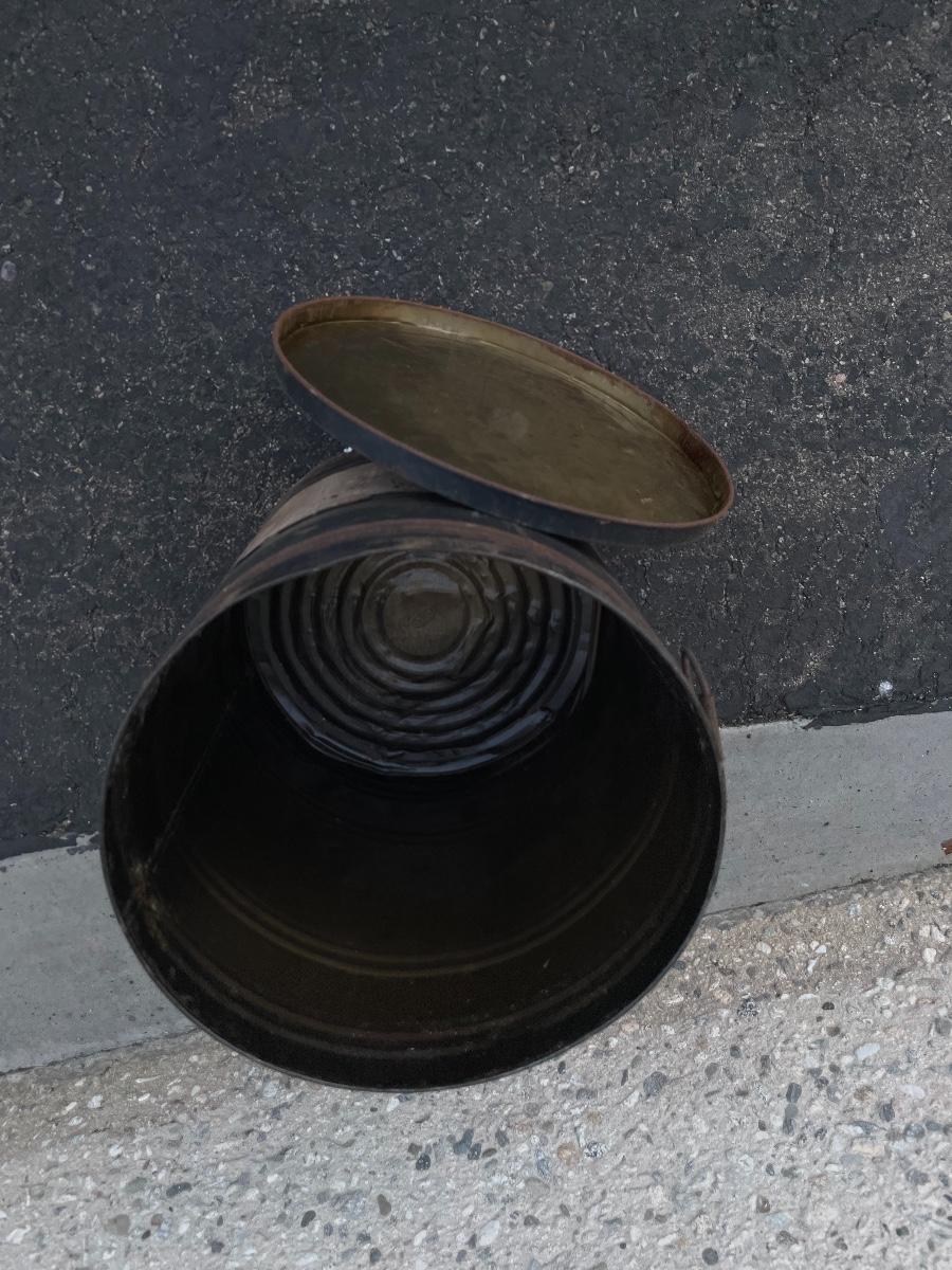 Black metal can with side handles and lid. Approx. 20” tall, 16” diameter.