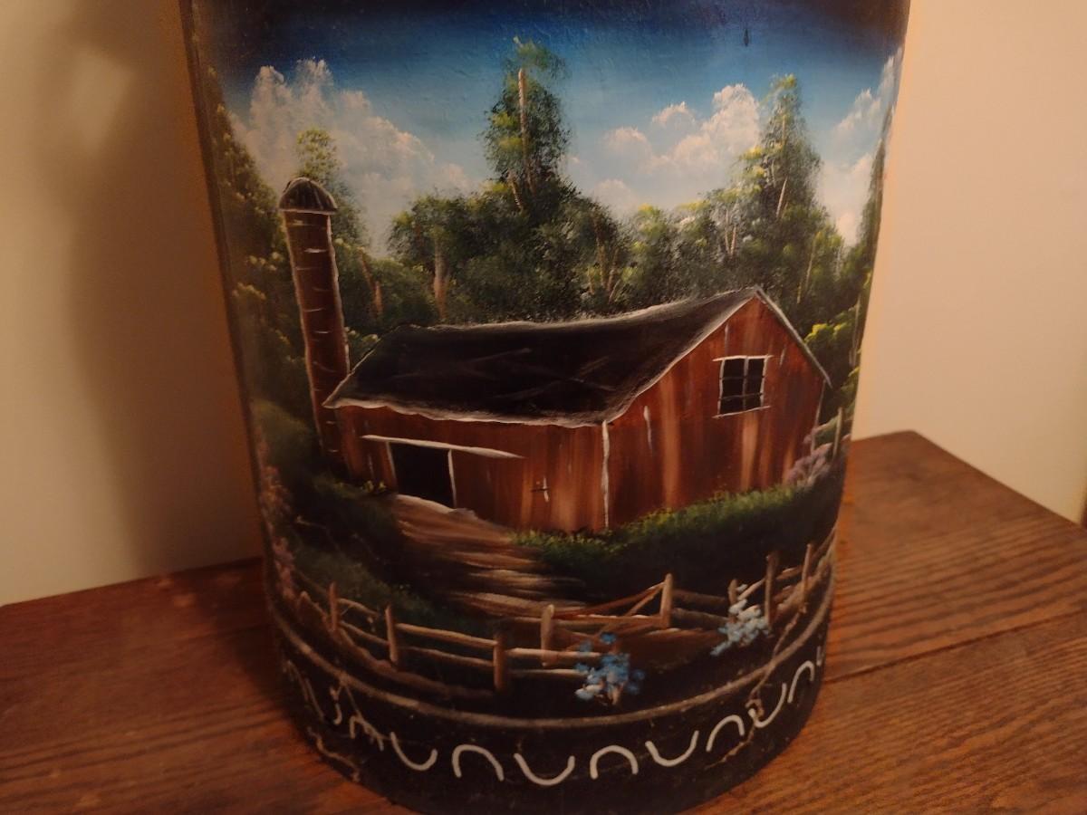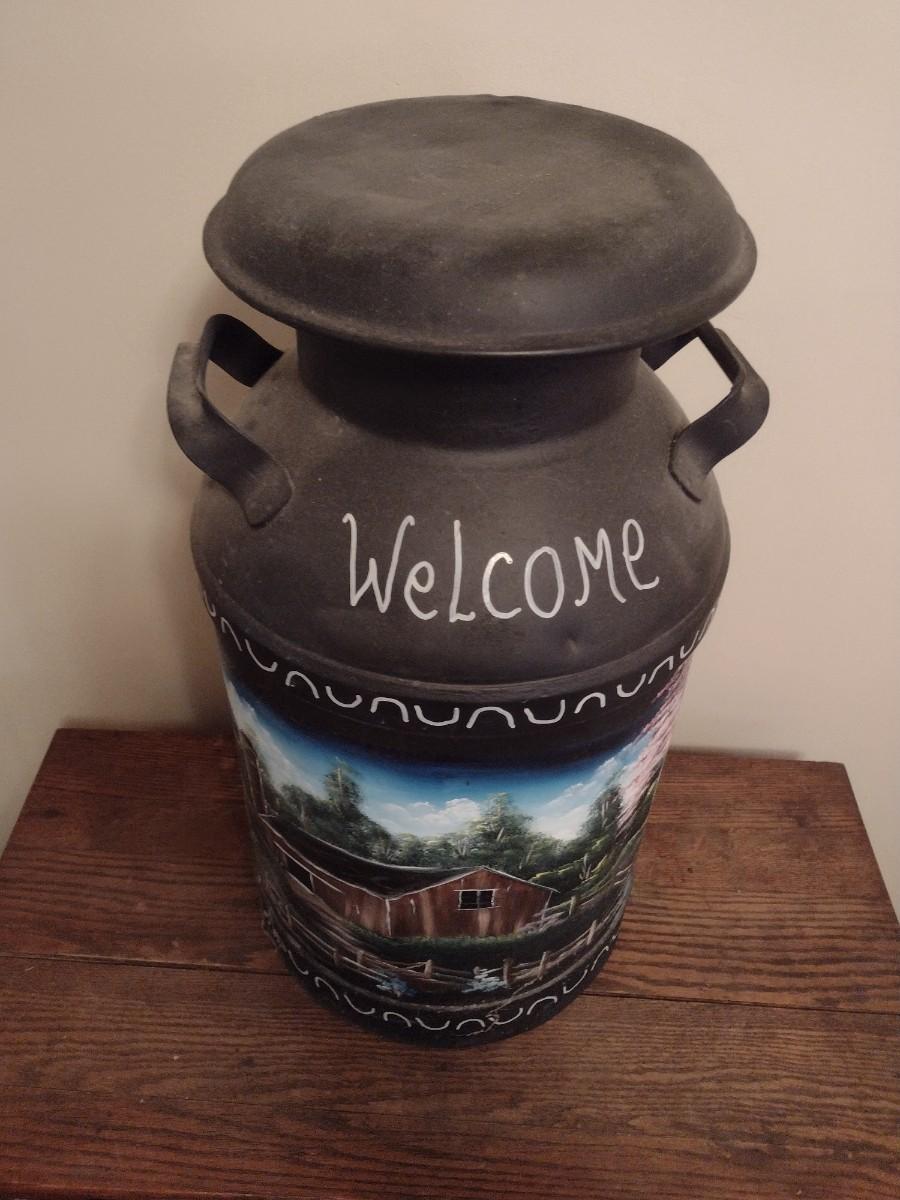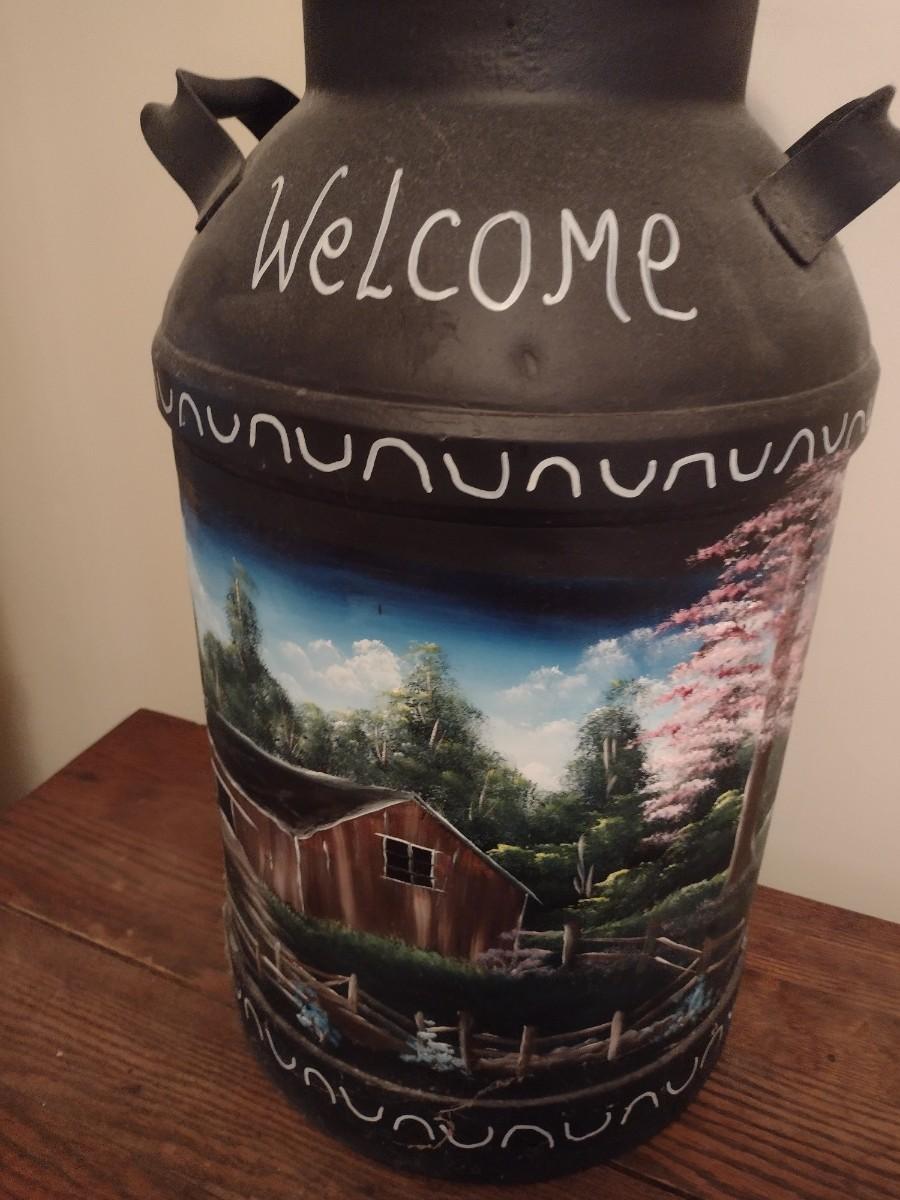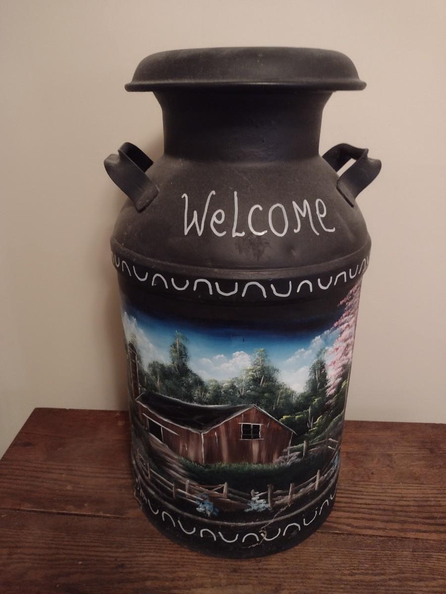 Vintage Metal Dairy Milk Can Hand Painted Barn Art Signed by Scilla R.