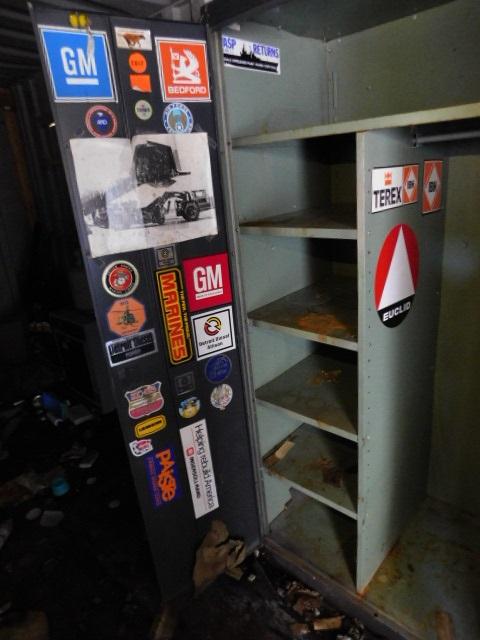 Vintage Metal Double Door Garage Storage Cabinet 36"x25"x78" has some rust at base. Classic look with auto and other stickers on interior of doors. Great item.