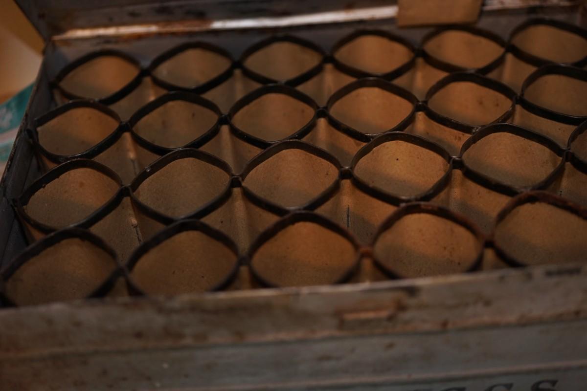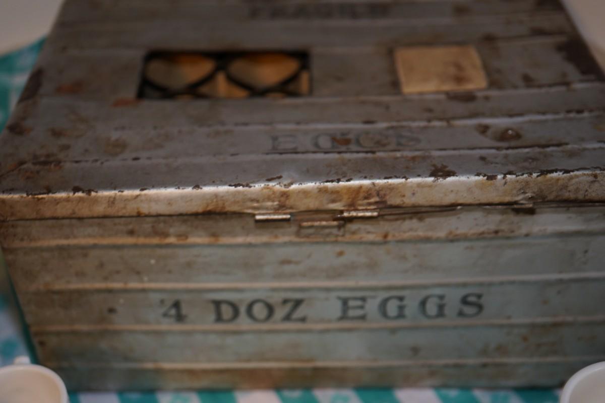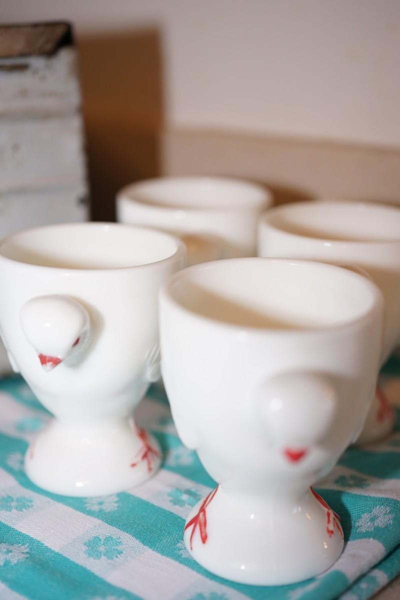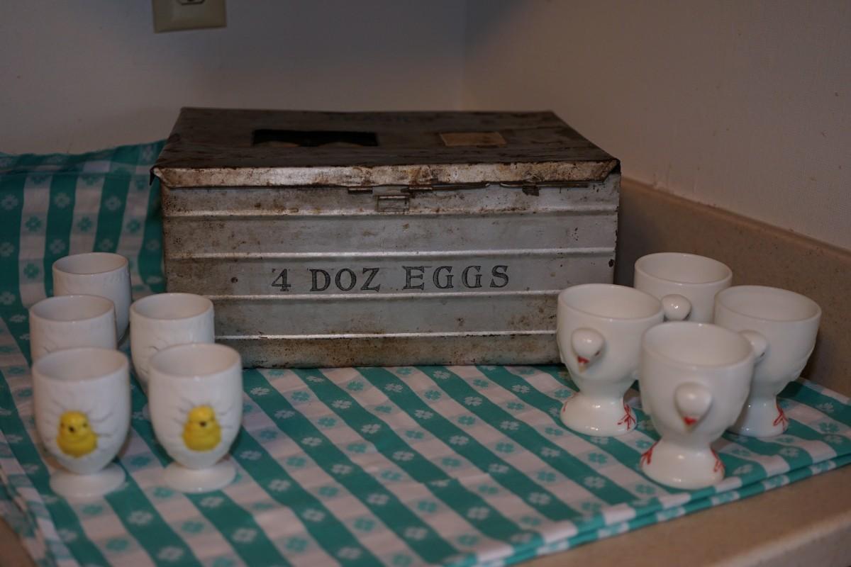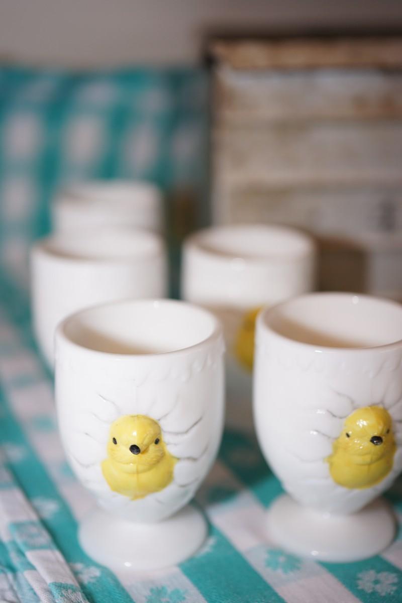 check out this sweet display of chick egg cups ( 5) and five chicken egg cups ( 5) and this vintage early 20th century tin egg box with the original paper insert.
