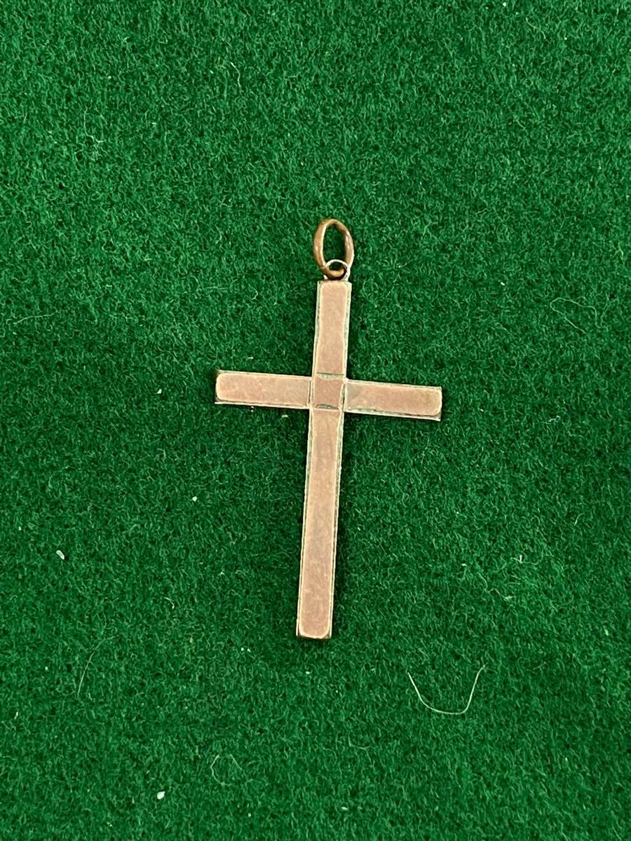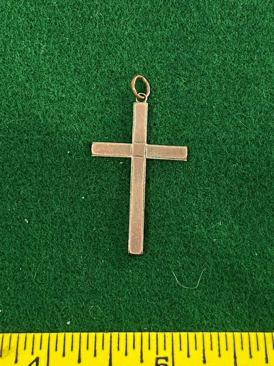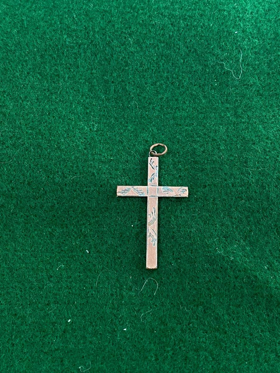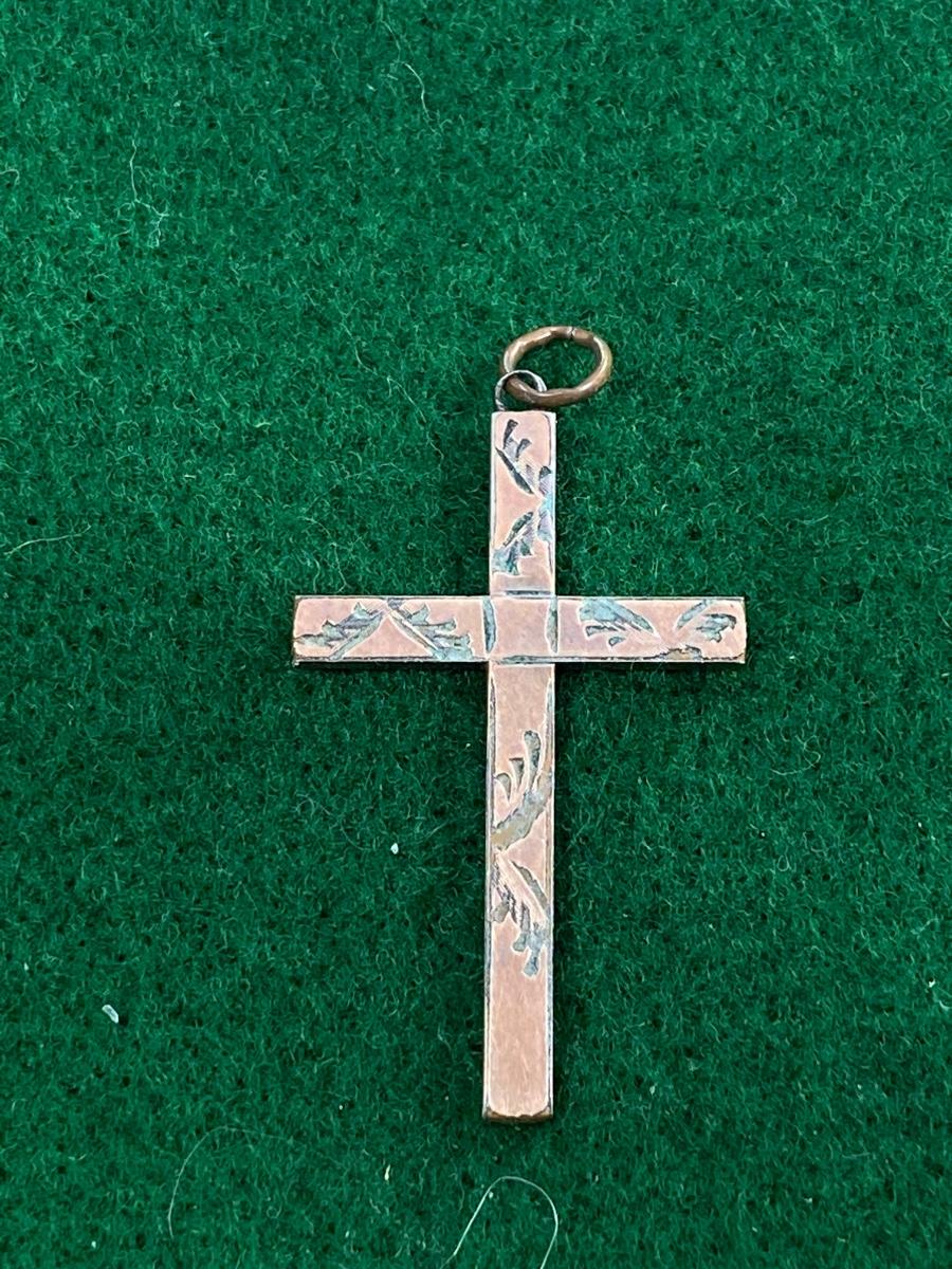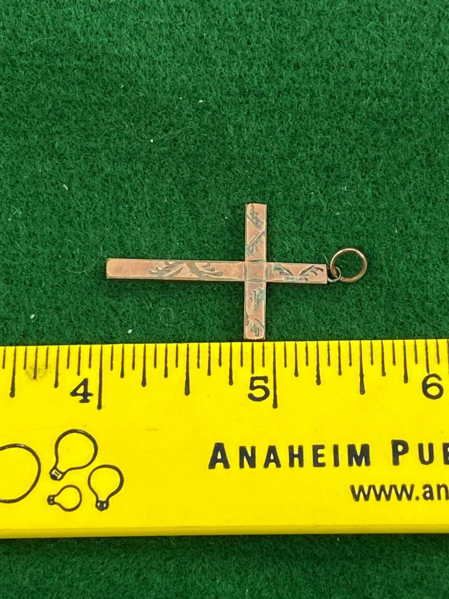 Vintage cross pendant. Unmarked metal has a copperish look to it. Stamped details on the front. About 1.5" length.