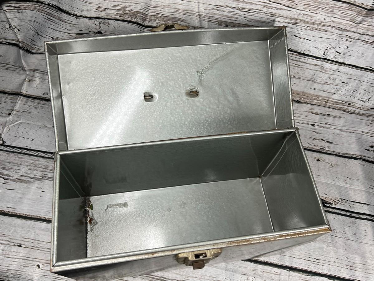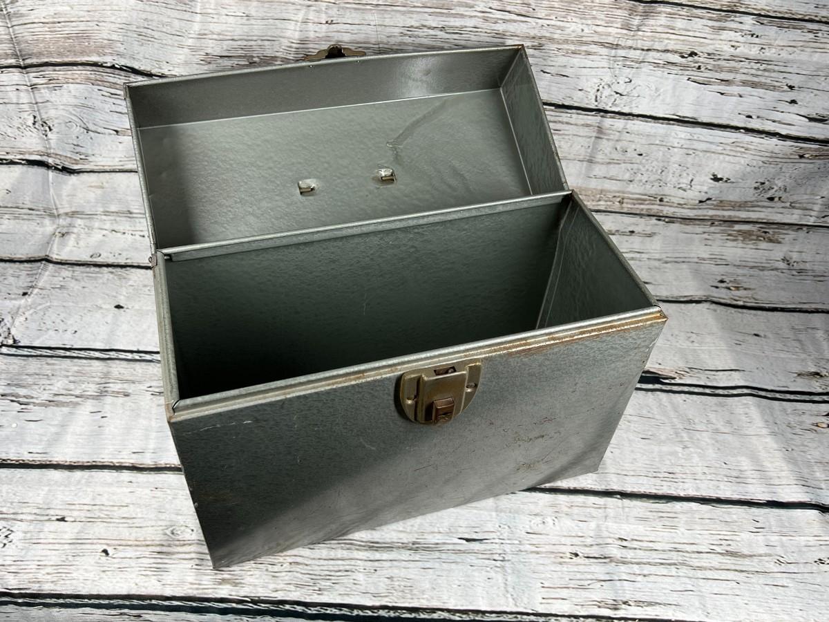 Vintage hinged lid metal file storage box. Some signs of age and use but in overall good vintage condition.