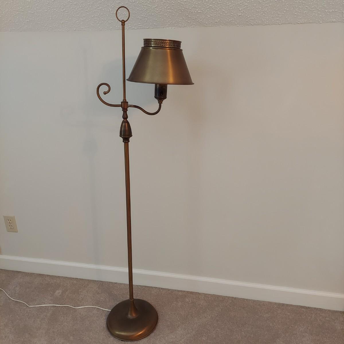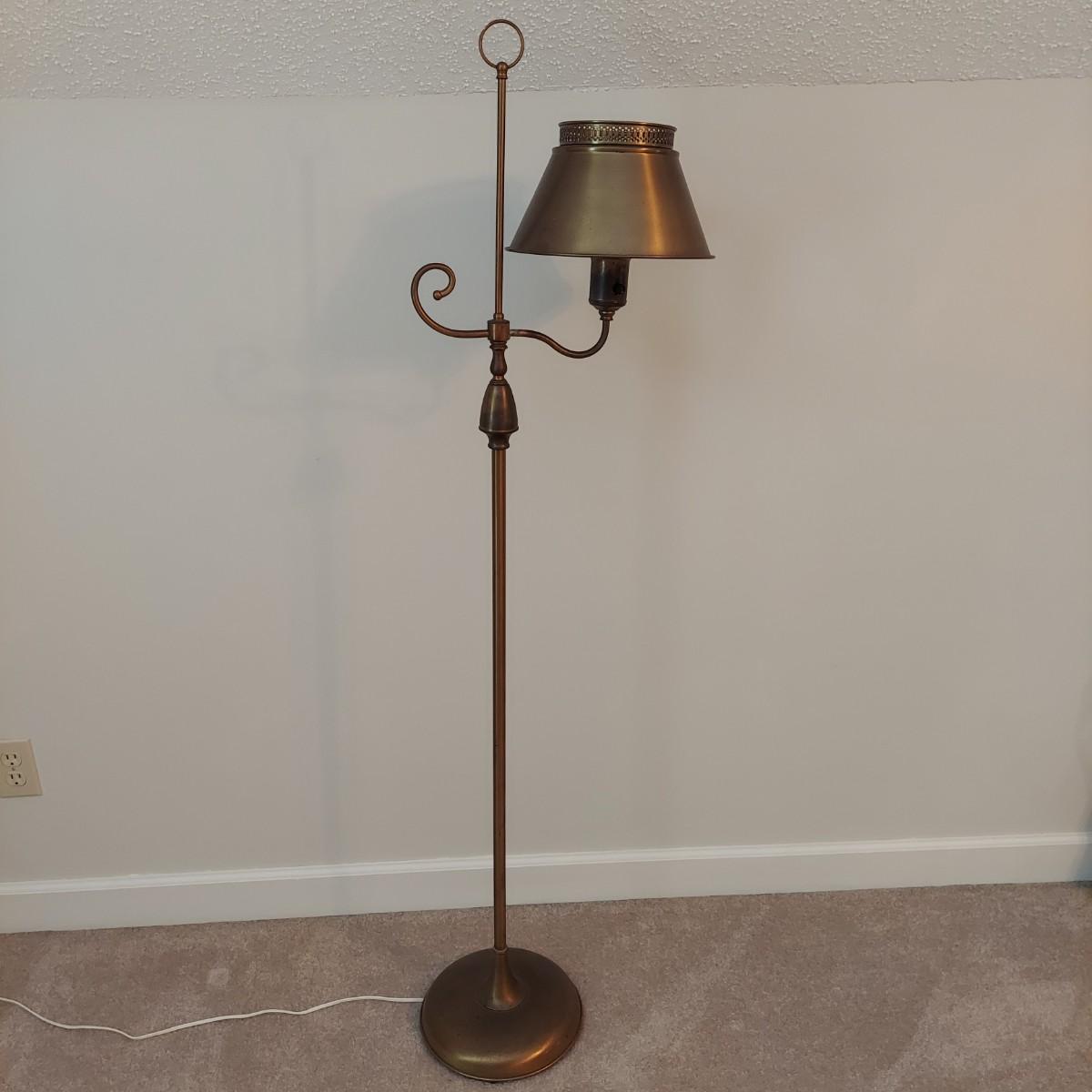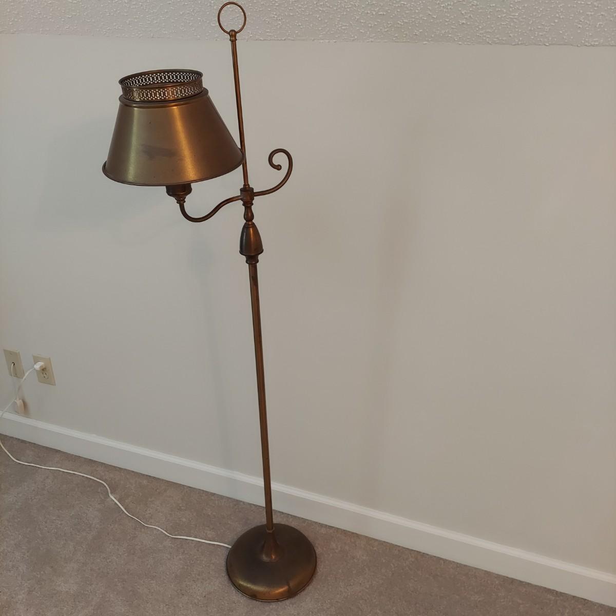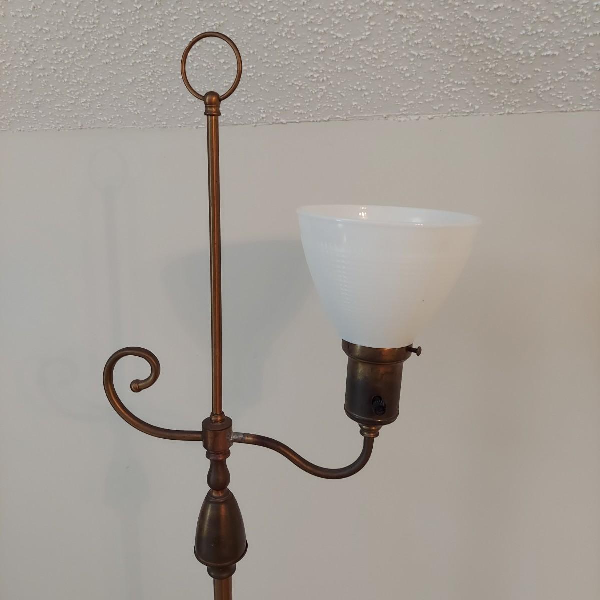 Brass colored vintage metal floor lamp. Has removable shade over milk glass globe light. Measures 15" x 10" x 58"H. There are signs of age on the base; see photos. Local Pickup Only.