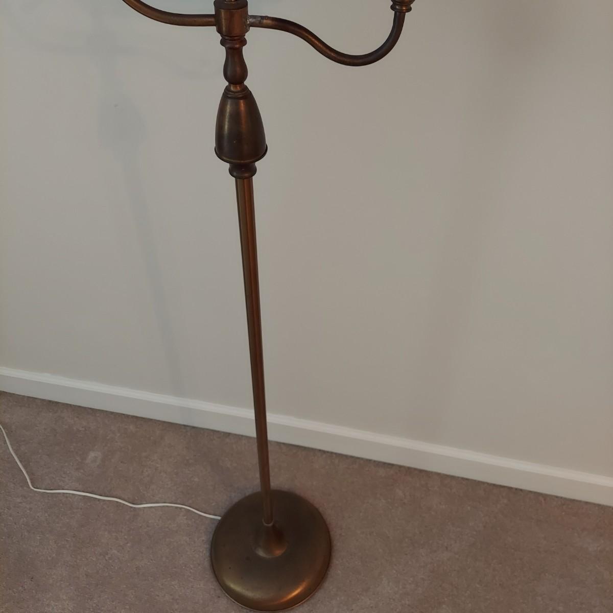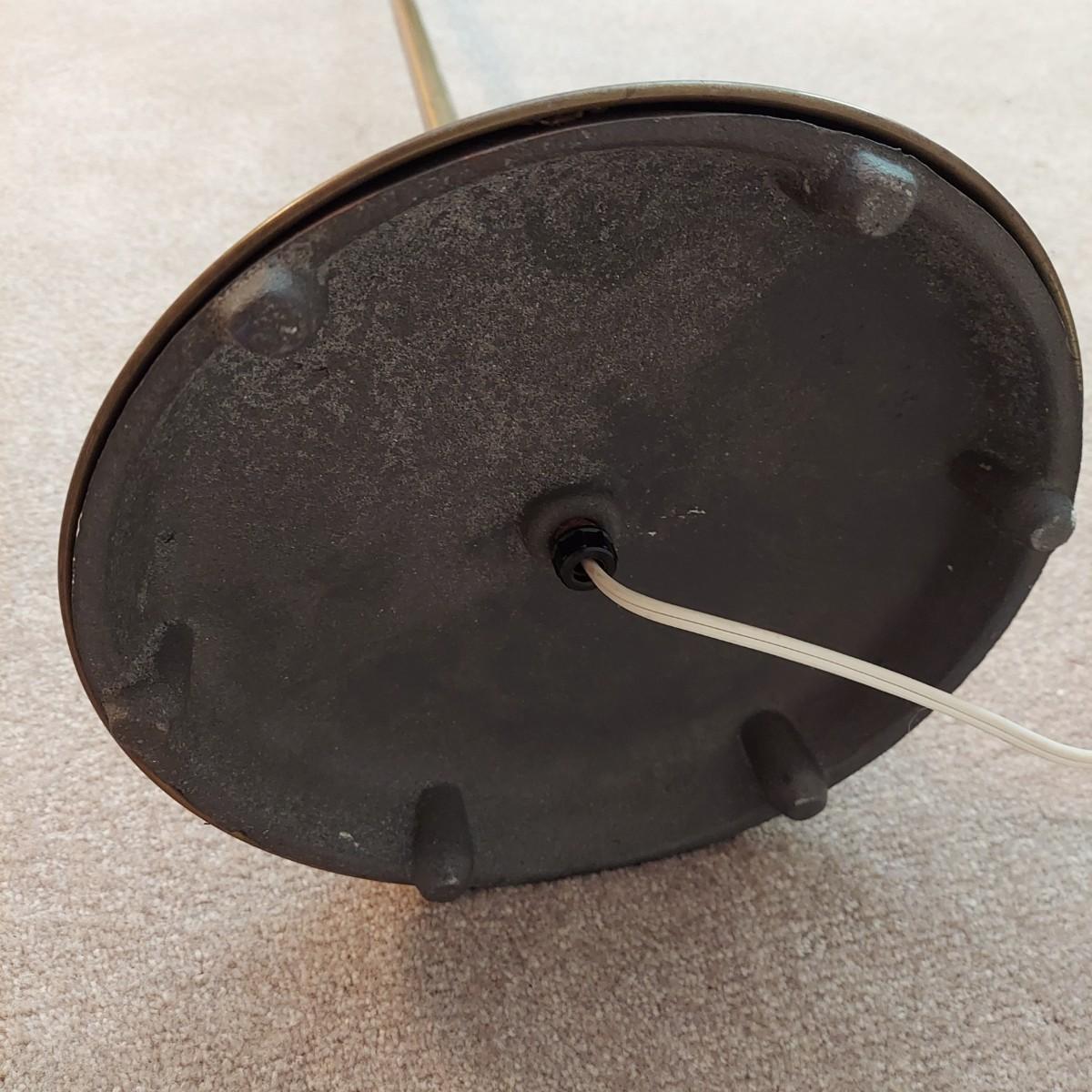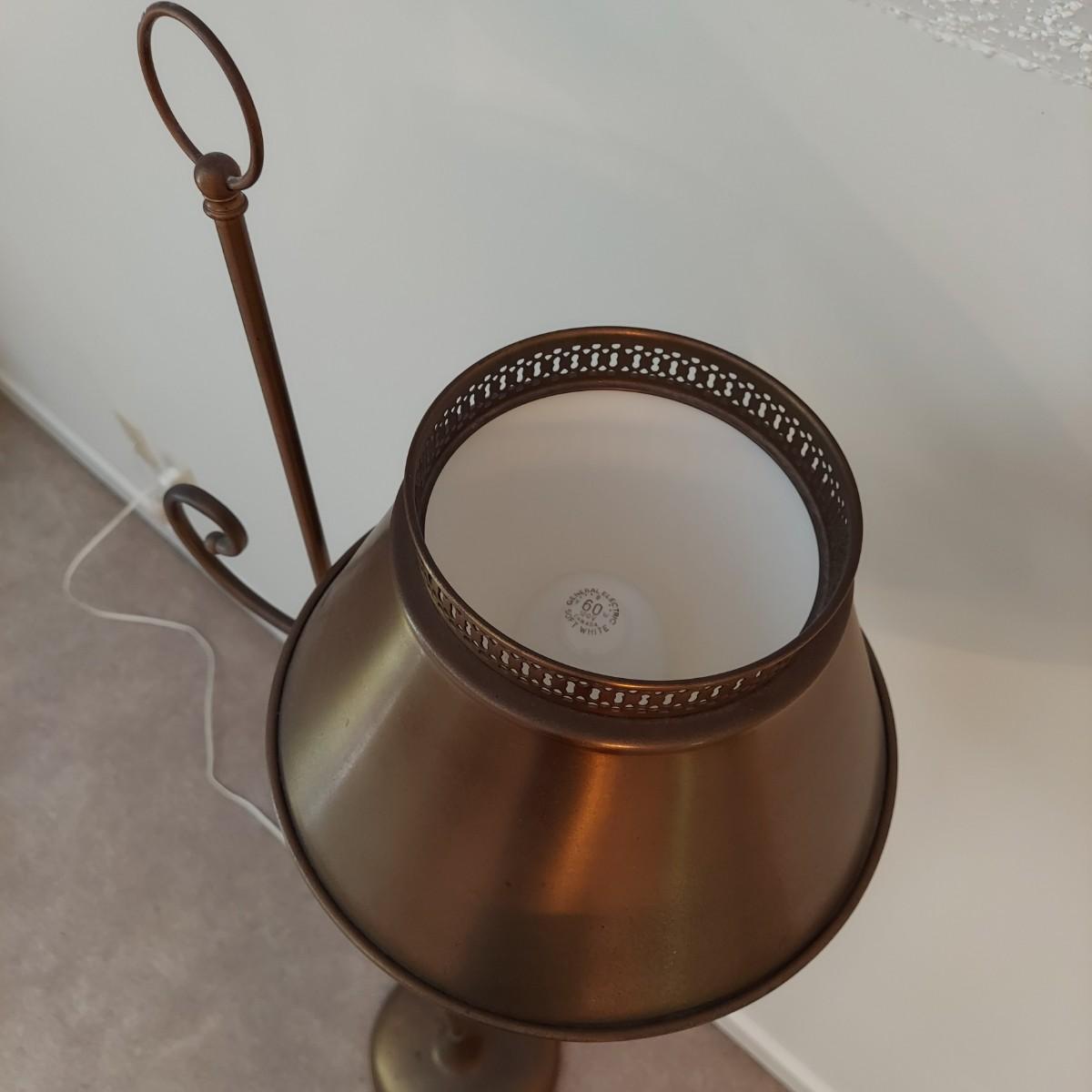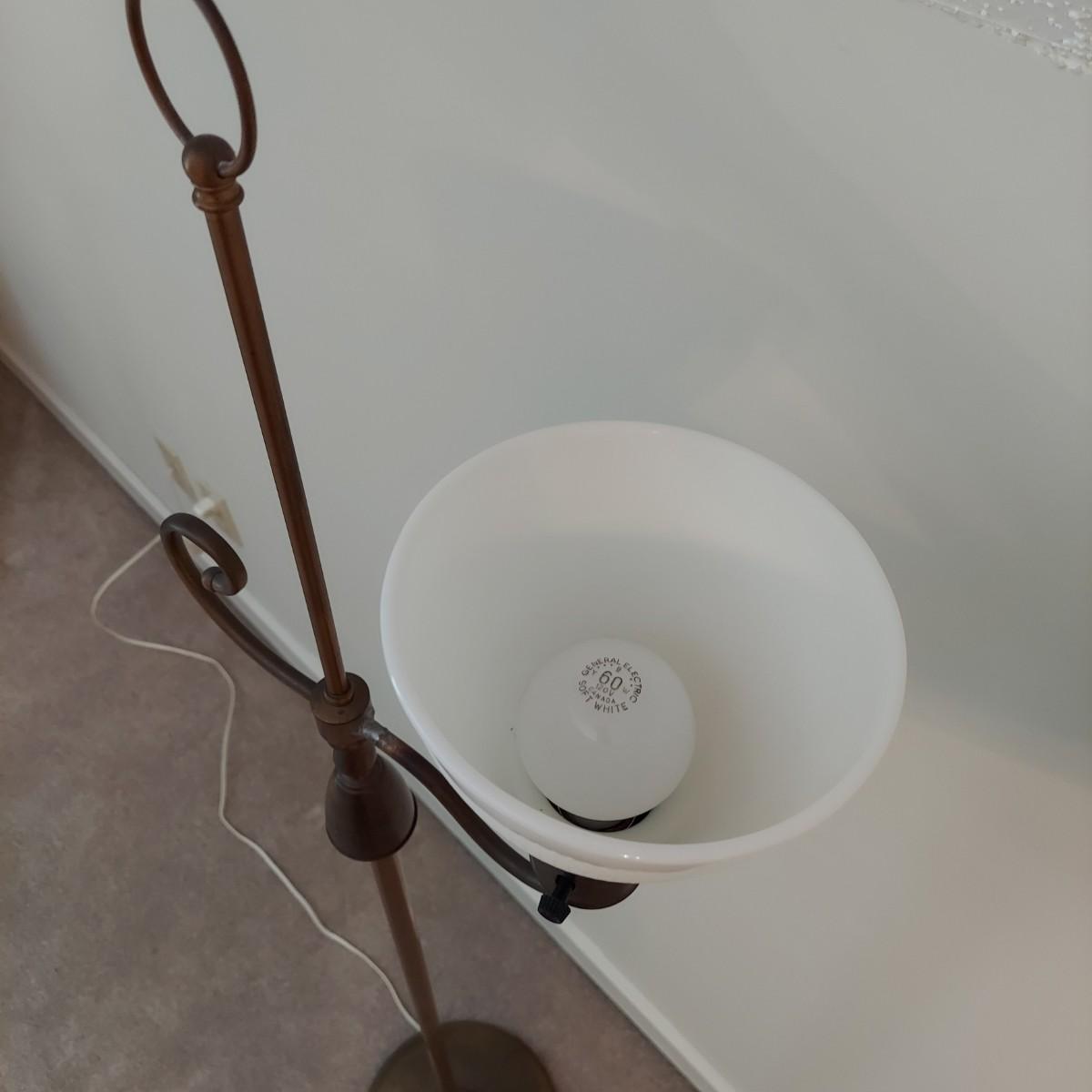 Brass colored vintage metal floor lamp. Has removable shade over milk glass globe light. Measures 15" x 10" x 58"H. There are signs of age on the base; see photos. Local Pickup Only.