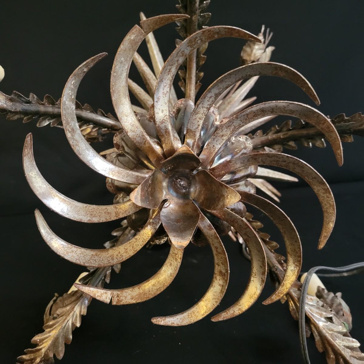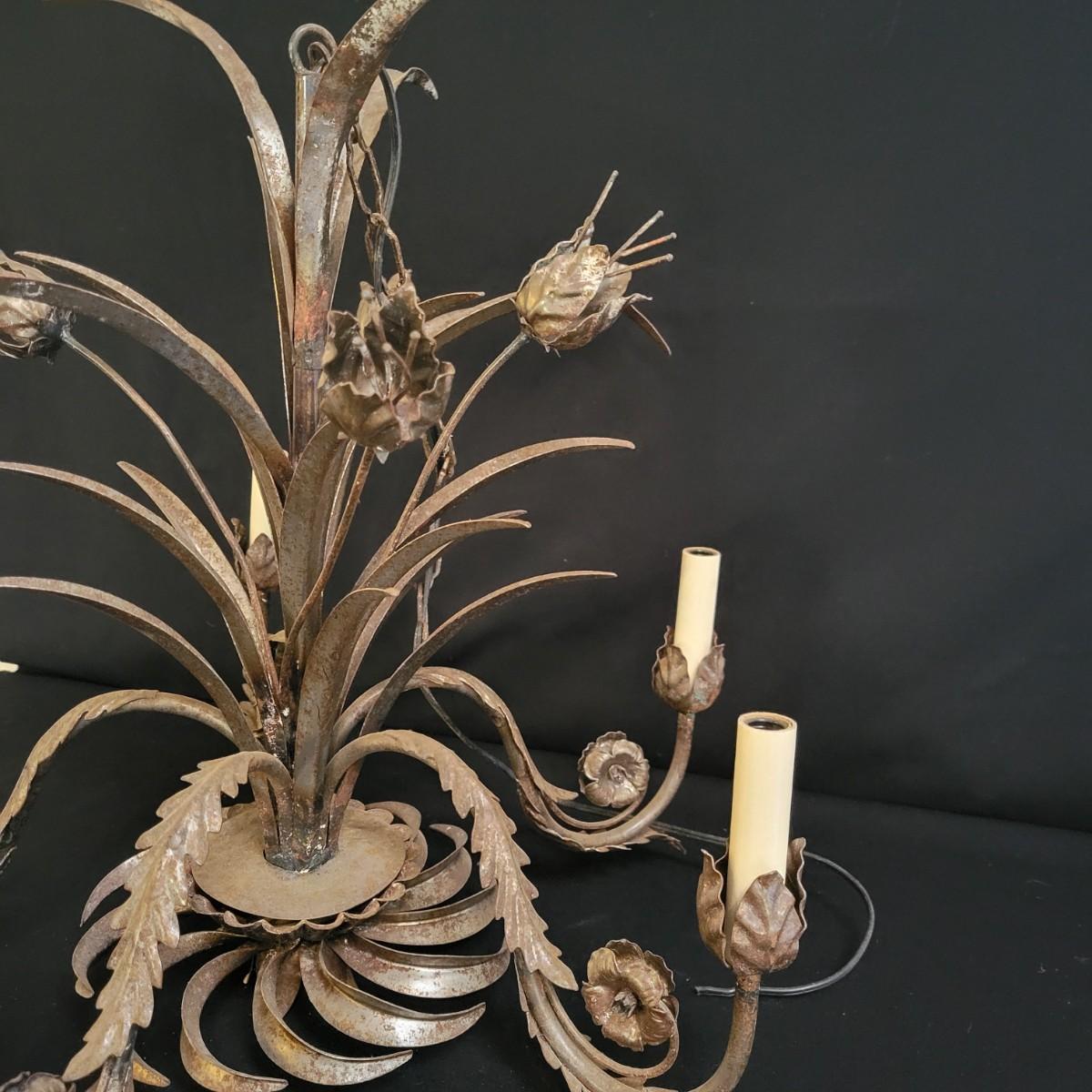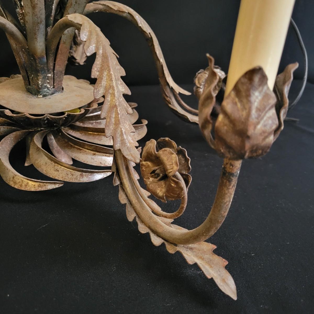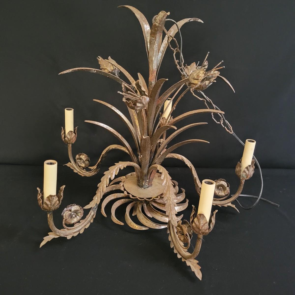 A vintage metal chandelier that could not be tested since it requires hardwiring. It features a floral motif with five light bulb locations. It measures approximately 24"D x 21"H. The chandelier has some rust spotting on it. Shipping available