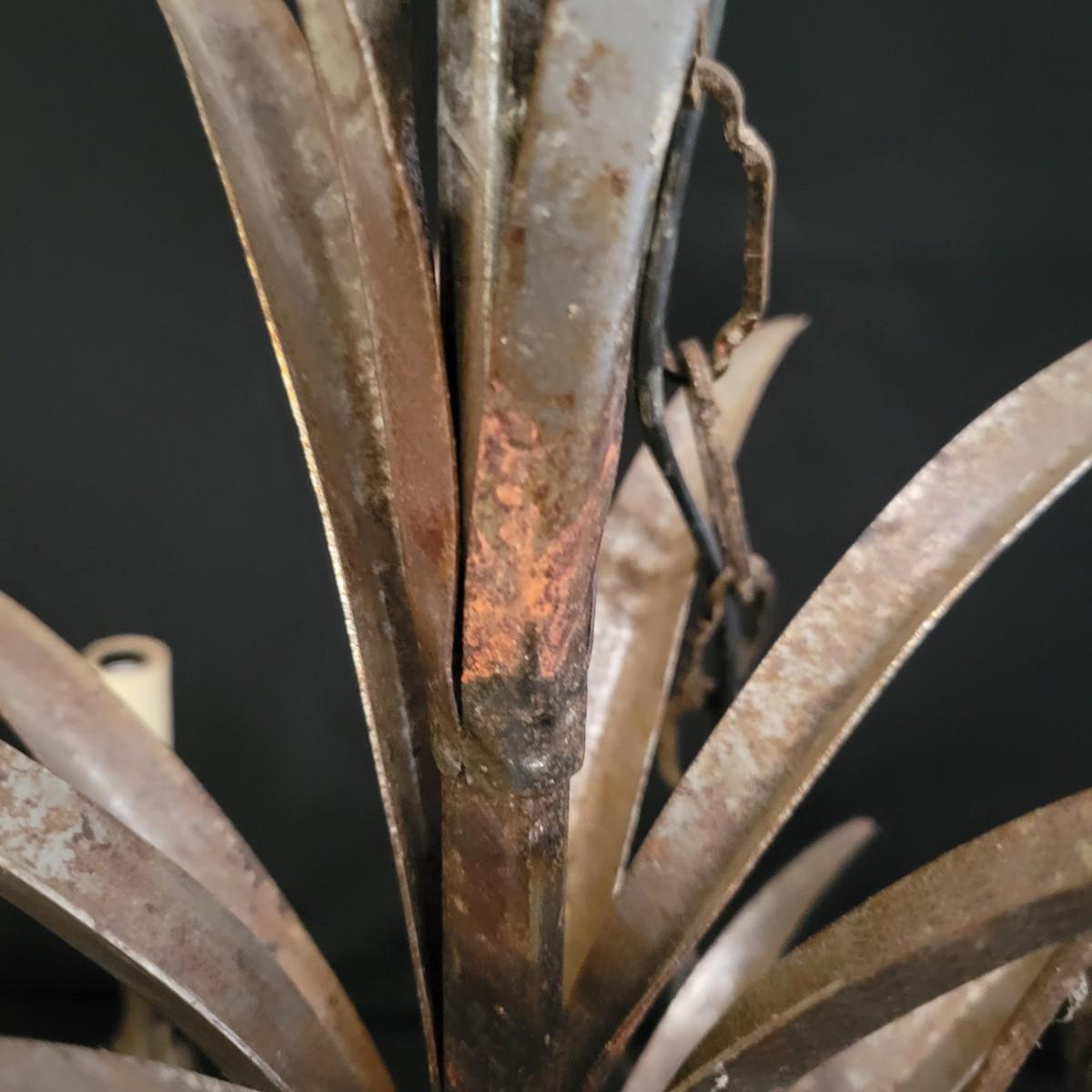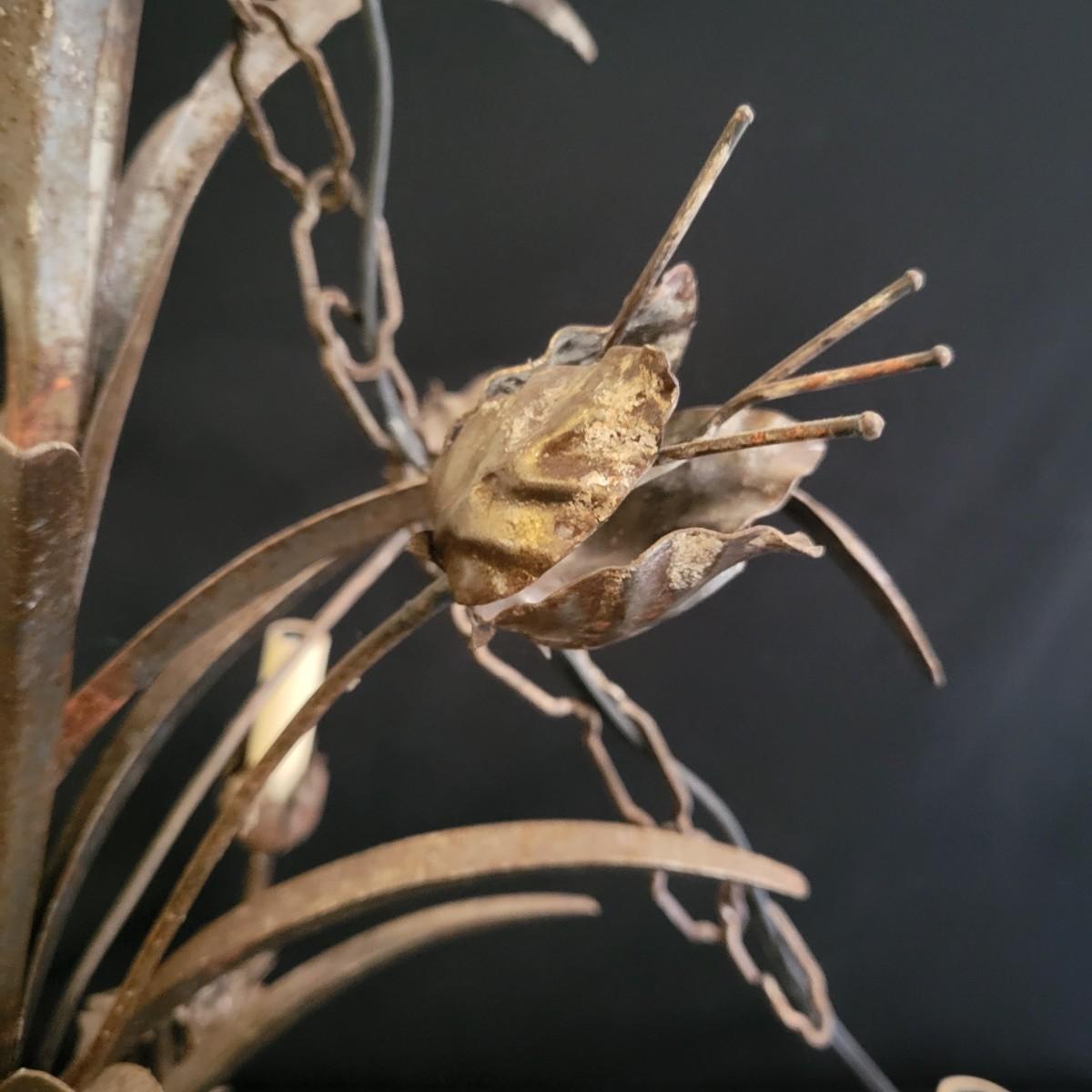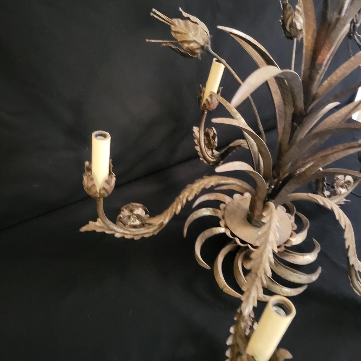 A vintage metal chandelier that could not be tested since it requires hardwiring. It features a floral motif with five light bulb locations. It measures approximately 24"D x 21"H. The chandelier has some rust spotting on it. Shipping available