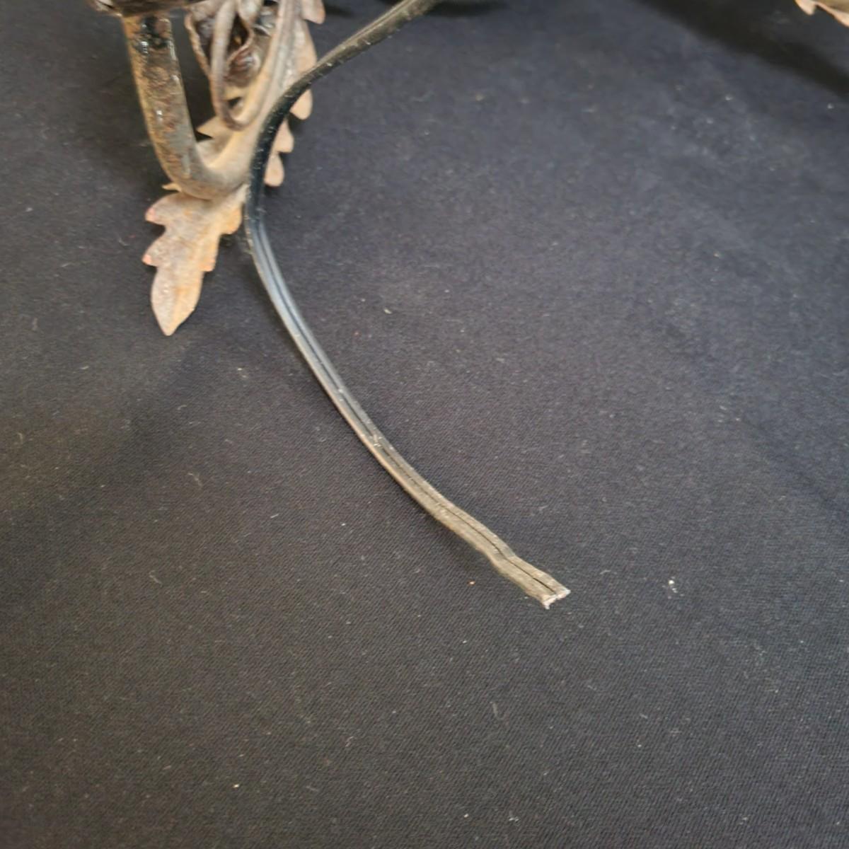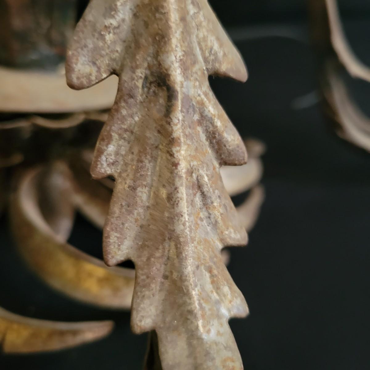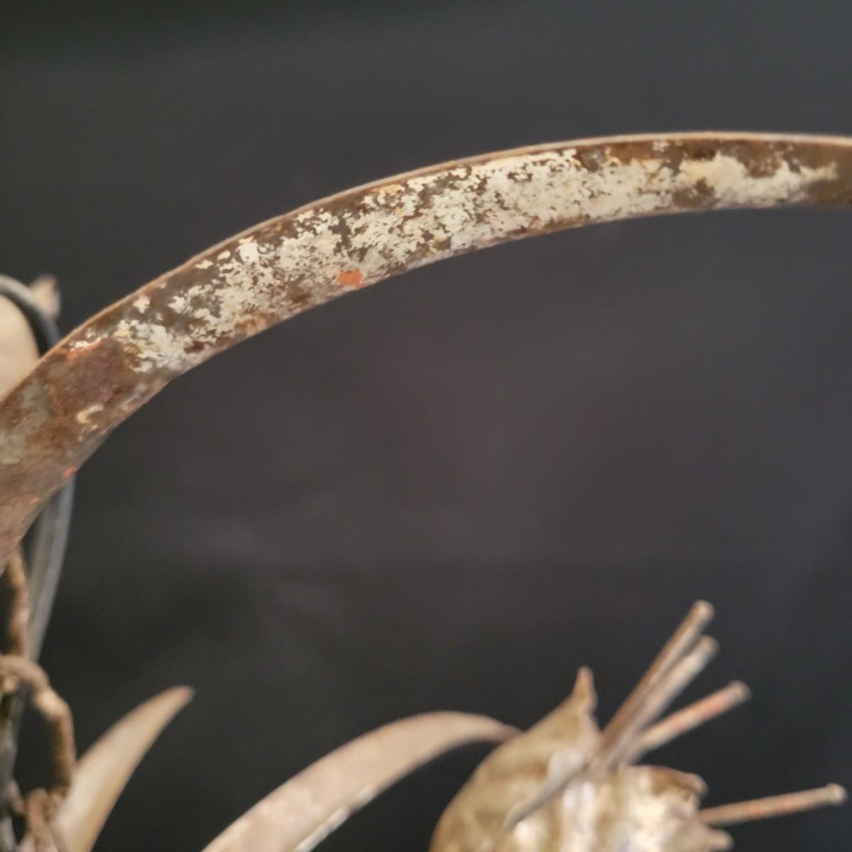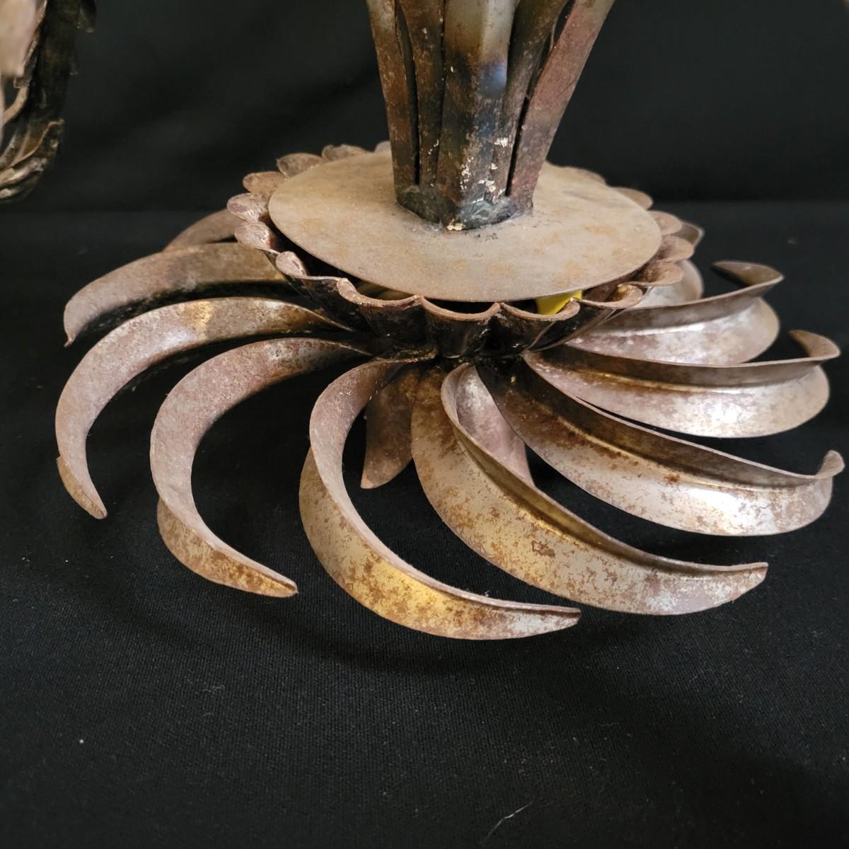 A vintage metal chandelier that could not be tested since it requires hardwiring. It features a floral motif with five light bulb locations. It measures approximately 24"D x 21"H. The chandelier has some rust spotting on it. Shipping available