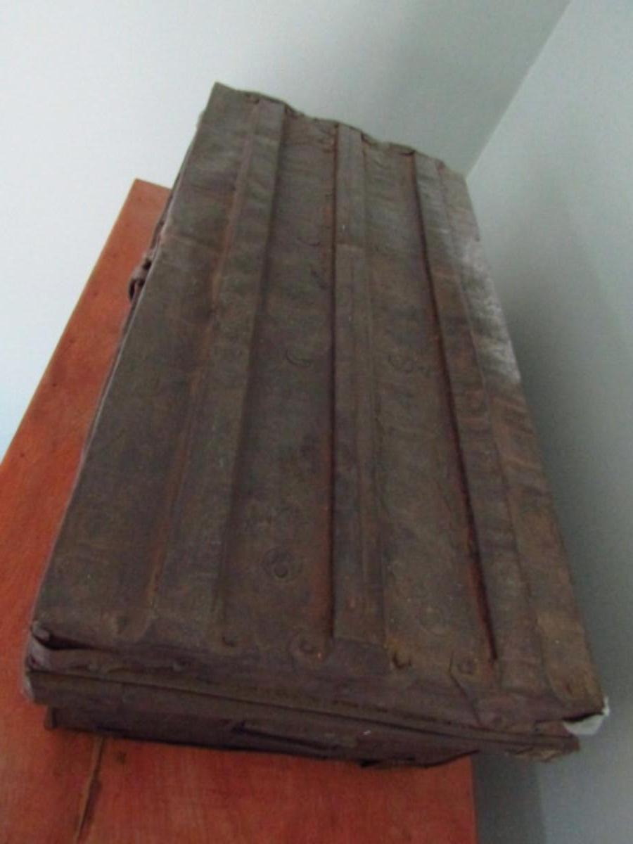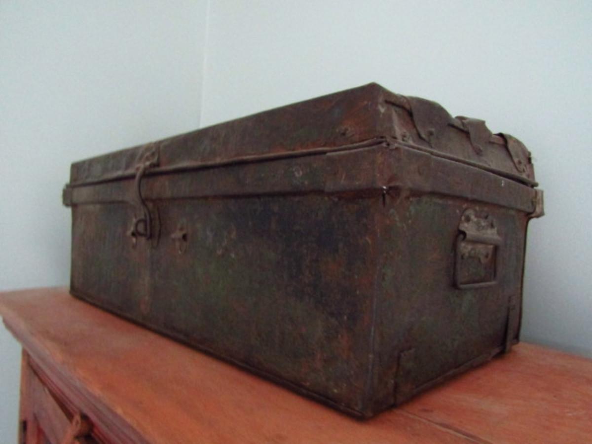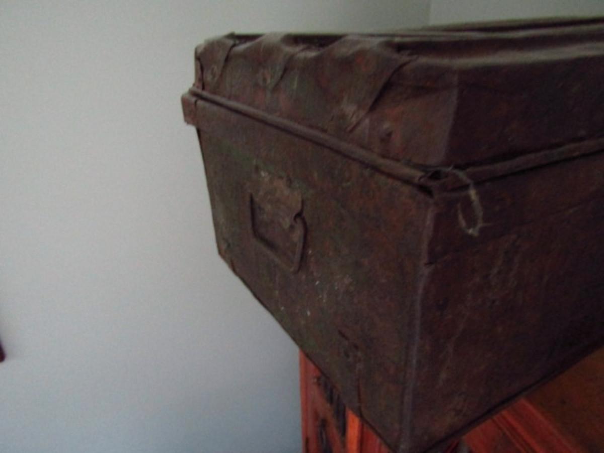 Vintage Metal Footlocker (Sunroom). Measures approx 26" x 13 1/2" x 10" tall