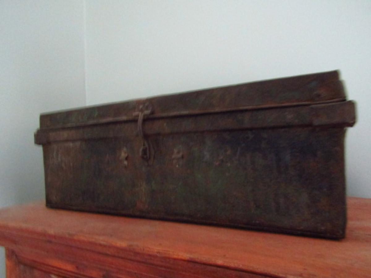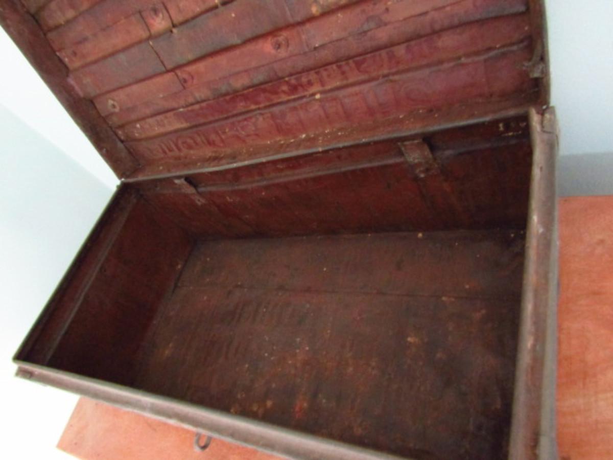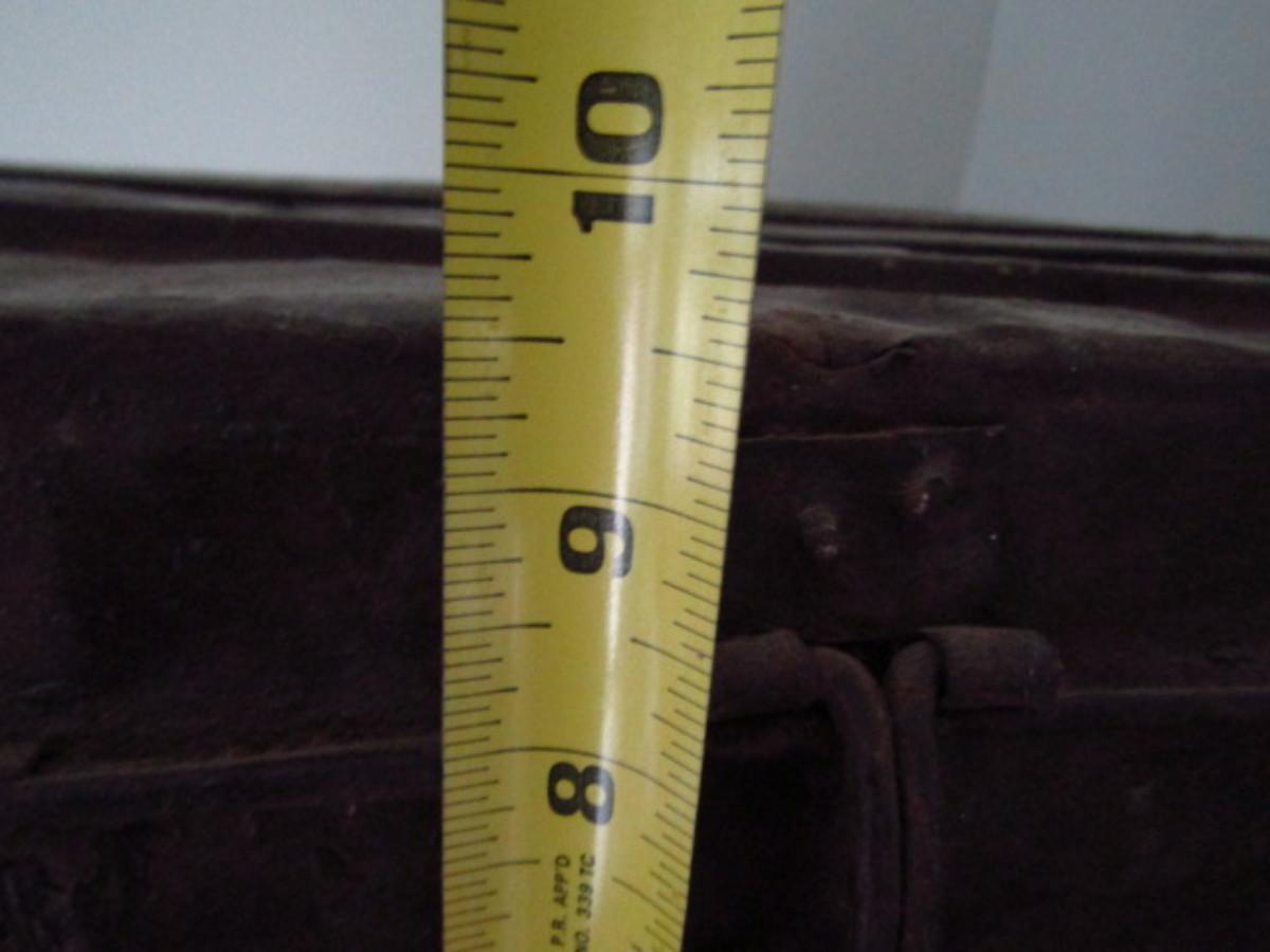 Vintage Metal Footlocker (Sunroom). Measures approx 26" x 13 1/2" x 10" tall