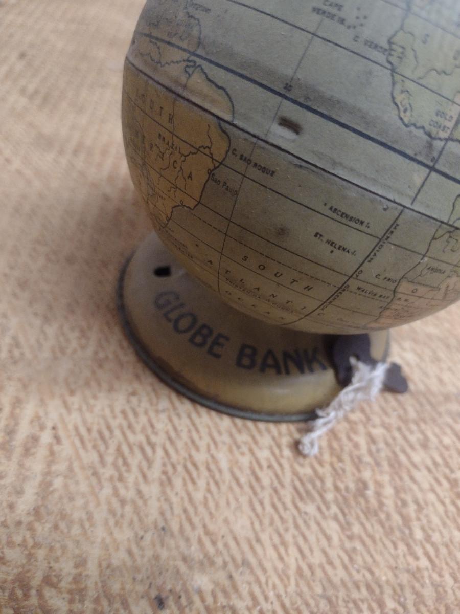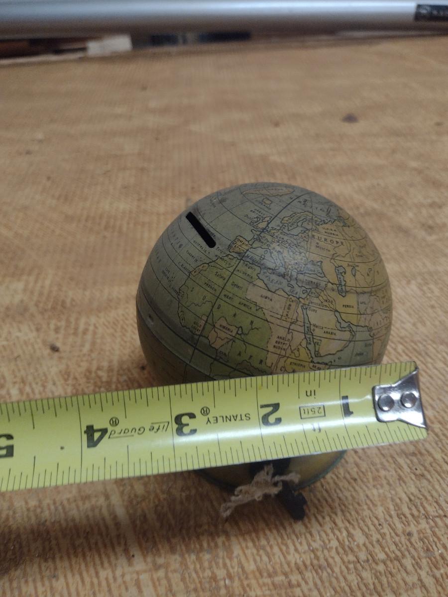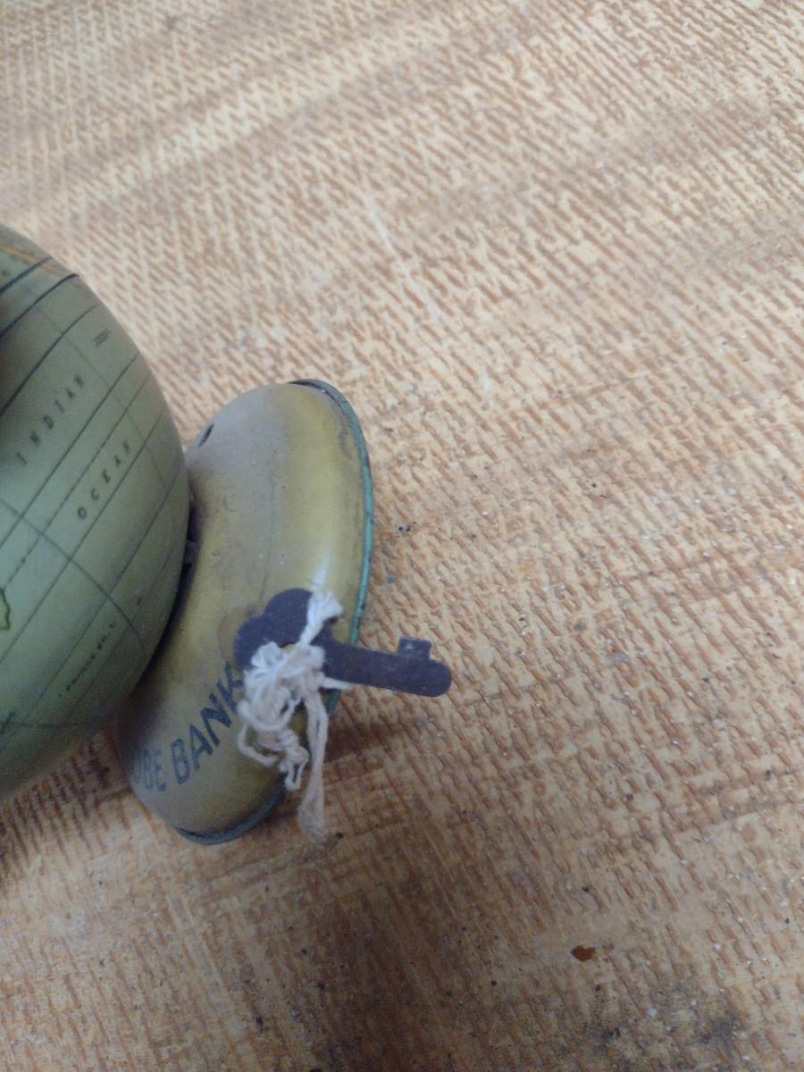 Vintage Metal Globe Coin Bank with Key- Approx 4 1/2" Tall. Stored in non-climatized basement so expect item may need to be cleaned from dust, insects, etc. Shipped in as is condition